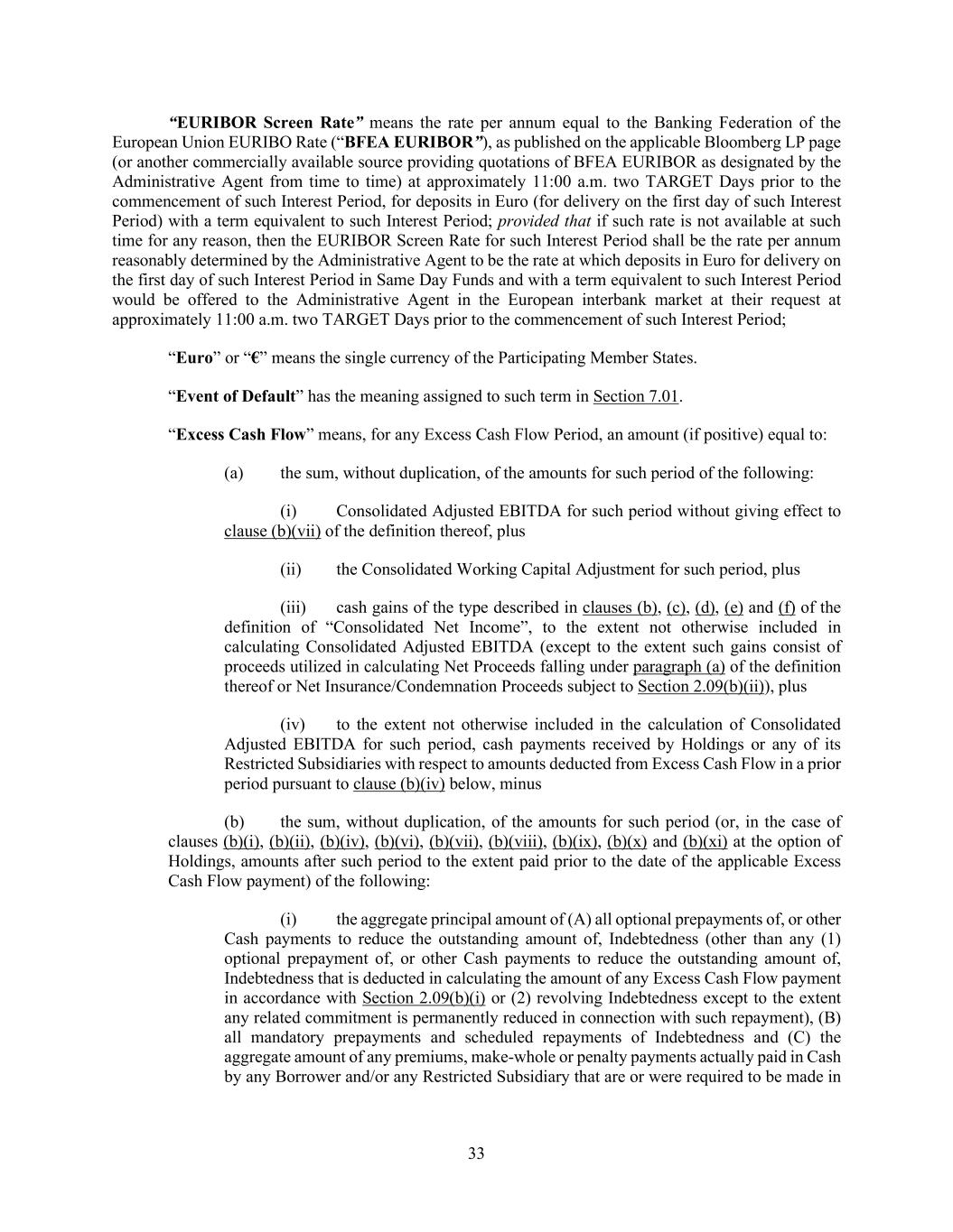 33 “EURIBOR Screen Rate” means the rate per annum equal to the Banking Federation of the European Union EURIBO Rate (“BFEA EURIBOR”), as published on the applicable Bloomberg LP page (or another commercially available source providing quotations of BFEA EURIBOR as designated by the Administrative Agent from time to time) at approximately 11:00 a.m. two TARGET Days prior to the commencement of such Interest Period, for deposits in Euro (for delivery on the first day of such Interest Period) with a term equivalent to such Interest Period; provided that if such rate is not available at such time for any reason, then the EURIBOR Screen Rate for such Interest Period shall be the rate per annum reasonably determined by the Administrative Agent to be the rate at which deposits in Euro for delivery on the first day of such Interest Period in Same Day Funds and with a term equivalent to such Interest Period would be offered to the Administrative Agent in the European interbank market at their request at approximately 11:00 a.m. two TARGET Days prior to the commencement of such Interest Period; “Euro” or “€” means the single currency of the Participating Member States. “Event of Default” has the meaning assigned to such term in Section 7.01. “Excess Cash Flow” means, for any Excess Cash Flow Period, an amount (if positive) equal to: (a) the sum, without duplication, of the amounts for such period of the following: (i) Consolidated Adjusted EBITDA for such period without giving effect to clause (b)(vii) of the definition thereof, plus (ii) the Consolidated Working Capital Adjustment for such period, plus (iii) cash gains of the type described in clauses (b), (c), (d), (e) and (f) of the definition of “Consolidated Net Income”, to the extent not otherwise included in calculating Consolidated Adjusted EBITDA (except to the extent such gains consist of proceeds utilized in calculating Net Proceeds falling under paragraph (a) of the definition thereof or Net Insurance/Condemnation Proceeds subject to Section 2.09(b)(ii)), plus (iv) to the extent not otherwise included in the calculation of Consolidated Adjusted EBITDA for such period, cash payments received by Holdings or any of its Restricted Subsidiaries with respect to amounts deducted from Excess Cash Flow in a prior period pursuant to clause (b)(iv) below, minus (b) the sum, without duplication, of the amounts for such period (or, in the case of clauses (b)(i), (b)(ii), (b)(iv), (b)(vi), (b)(vii), (b)(viii), (b)(ix), (b)(x) and (b)(xi) at the option of Holdings, amounts after such period to the extent paid prior to the date of the applicable Excess Cash Flow payment) of the following: (i) the aggregate principal amount of (A) all optional prepayments of, or other Cash payments to reduce the outstanding amount of, Indebtedness (other than any (1) optional prepayment of, or other Cash payments to reduce the outstanding amount of, Indebtedness that is deducted in calculating the amount of any Excess Cash Flow payment in accordance with Section 2.09(b)(i) or (2) revolving Indebtedness except to the extent any related commitment is permanently reduced in connection with such repayment), (B) all mandatory prepayments and scheduled repayments of Indebtedness and (C) the aggregate amount of any premiums, make-whole or penalty payments actually paid in Cash by any Borrower and/or any Restricted Subsidiary that are or were required to be made in