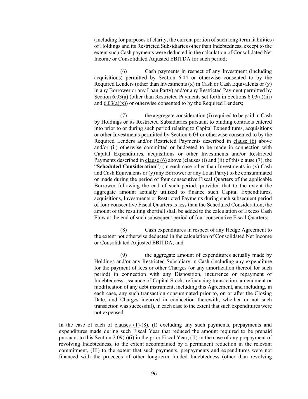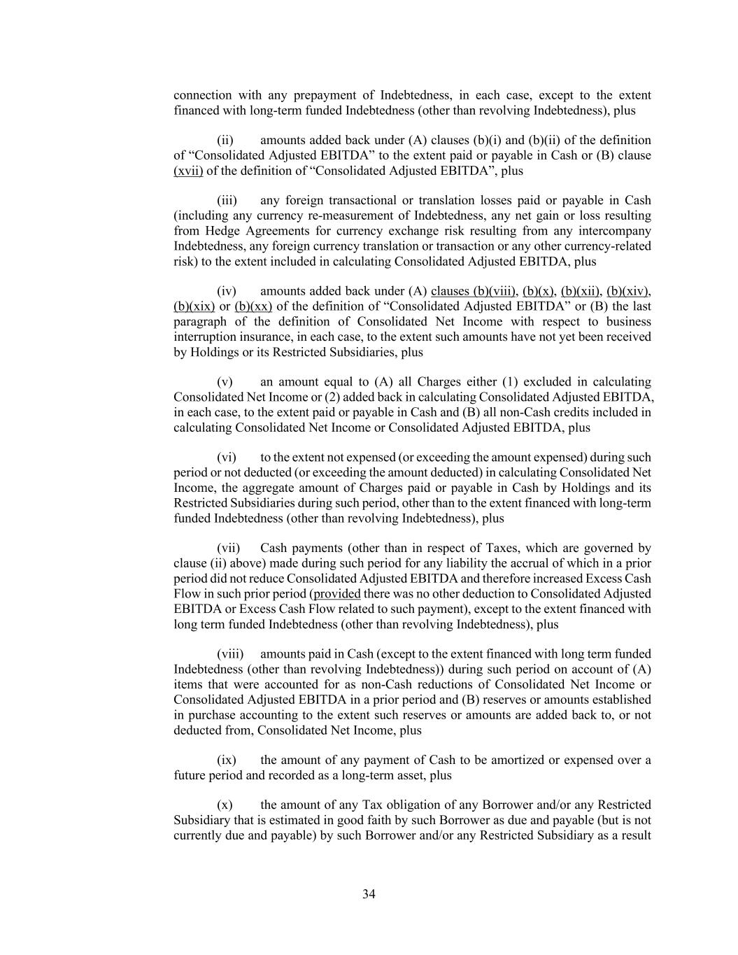 34 connection with any prepayment of Indebtedness, in each case, except to the extent financed with long-term funded Indebtedness (other than revolving Indebtedness), plus (ii) amounts added back under (A) clauses (b)(i) and (b)(ii) of the definition of “Consolidated Adjusted EBITDA” to the extent paid or payable in Cash or (B) clause (xvii) of the definition of “Consolidated Adjusted EBITDA”, plus (iii) any foreign transactional or translation losses paid or payable in Cash (including any currency re-measurement of Indebtedness, any net gain or loss resulting from Hedge Agreements for currency exchange risk resulting from any intercompany Indebtedness, any foreign currency translation or transaction or any other currency-related risk) to the extent included in calculating Consolidated Adjusted EBITDA, plus (iv) amounts added back under (A) clauses (b)(viii), (b)(x), (b)(xii), (b)(xiv), (b)(xix) or (b)(xx) of the definition of “Consolidated Adjusted EBITDA” or (B) the last paragraph of the definition of Consolidated Net Income with respect to business interruption insurance, in each case, to the extent such amounts have not yet been received by Holdings or its Restricted Subsidiaries, plus (v) an amount equal to (A) all Charges either (1) excluded in calculating Consolidated Net Income or (2) added back in calculating Consolidated Adjusted EBITDA, in each case, to the extent paid or payable in Cash and (B) all non-Cash credits included in calculating Consolidated Net Income or Consolidated Adjusted EBITDA, plus (vi) to the extent not expensed (or exceeding the amount expensed) during such period or not deducted (or exceeding the amount deducted) in calculating Consolidated Net Income, the aggregate amount of Charges paid or payable in Cash by Holdings and its Restricted Subsidiaries during such period, other than to the extent financed with long-term funded Indebtedness (other than revolving Indebtedness), plus (vii) Cash payments (other than in respect of Taxes, which are governed by clause (ii) above) made during such period for any liability the accrual of which in a prior period did not reduce Consolidated Adjusted EBITDA and therefore increased Excess Cash Flow in such prior period (provided there was no other deduction to Consolidated Adjusted EBITDA or Excess Cash Flow related to such payment), except to the extent financed with long term funded Indebtedness (other than revolving Indebtedness), plus (viii) amounts paid in Cash (except to the extent financed with long term funded Indebtedness (other than revolving Indebtedness)) during such period on account of (A) items that were accounted for as non-Cash reductions of Consolidated Net Income or Consolidated Adjusted EBITDA in a prior period and (B) reserves or amounts established in purchase accounting to the extent such reserves or amounts are added back to, or not deducted from, Consolidated Net Income, plus (ix) the amount of any payment of Cash to be amortized or expensed over a future period and recorded as a long-term asset, plus (x) the amount of any Tax obligation of any Borrower and/or any Restricted Subsidiary that is estimated in good faith by such Borrower as due and payable (but is not currently due and payable) by such Borrower and/or any Restricted Subsidiary as a result