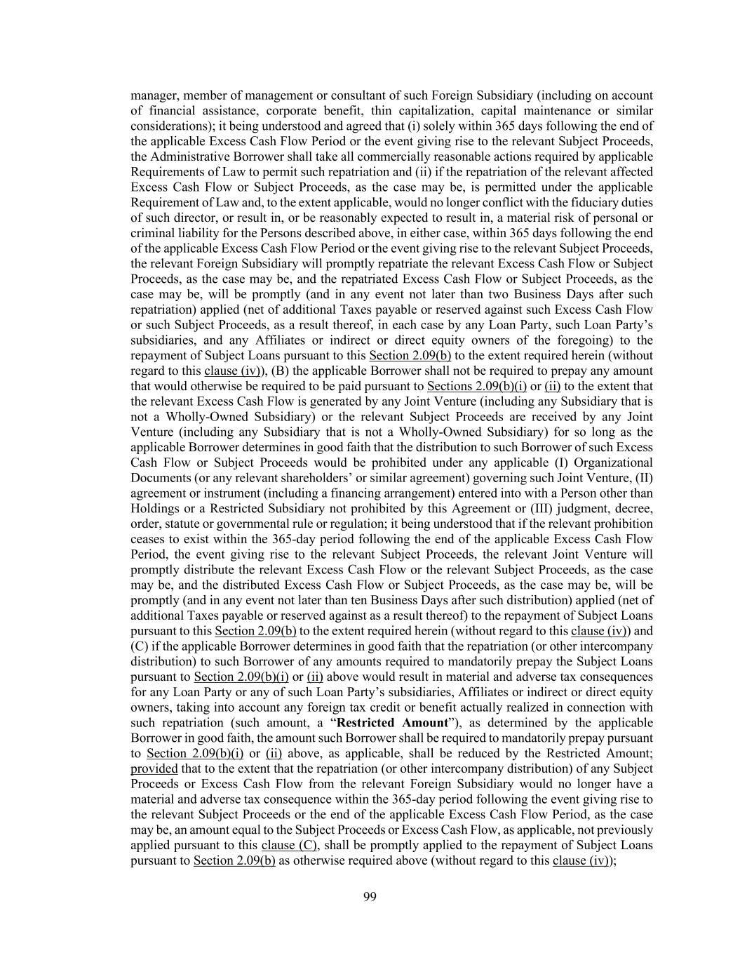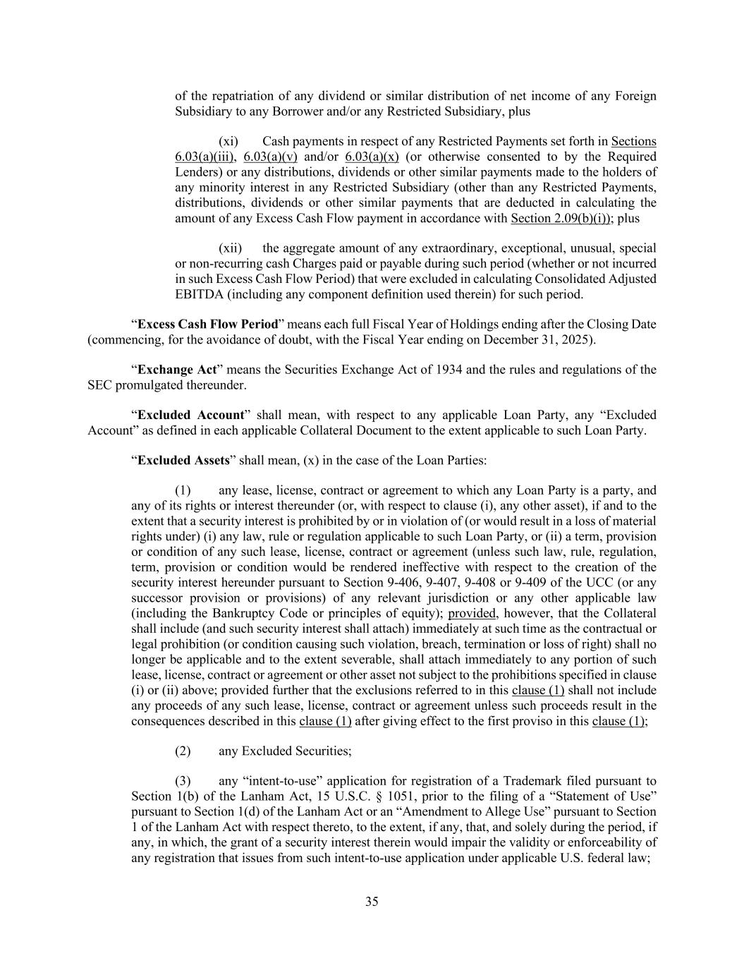 35 of the repatriation of any dividend or similar distribution of net income of any Foreign Subsidiary to any Borrower and/or any Restricted Subsidiary, plus (xi) Cash payments in respect of any Restricted Payments set forth in Sections 6.03(a)(iii), 6.03(a)(v) and/or 6.03(a)(x) (or otherwise consented to by the Required Lenders) or any distributions, dividends or other similar payments made to the holders of any minority interest in any Restricted Subsidiary (other than any Restricted Payments, distributions, dividends or other similar payments that are deducted in calculating the amount of any Excess Cash Flow payment in accordance with Section 2.09(b)(i)); plus (xii) the aggregate amount of any extraordinary, exceptional, unusual, special or non-recurring cash Charges paid or payable during such period (whether or not incurred in such Excess Cash Flow Period) that were excluded in calculating Consolidated Adjusted EBITDA (including any component definition used therein) for such period. “Excess Cash Flow Period” means each full Fiscal Year of Holdings ending after the Closing Date (commencing, for the avoidance of doubt, with the Fiscal Year ending on December 31, 2025). “Exchange Act” means the Securities Exchange Act of 1934 and the rules and regulations of the SEC promulgated thereunder. “Excluded Account” shall mean, with respect to any applicable Loan Party, any “Excluded Account” as defined in each applicable Collateral Document to the extent applicable to such Loan Party. “Excluded Assets” shall mean, (x) in the case of the Loan Parties: (1) any lease, license, contract or agreement to which any Loan Party is a party, and any of its rights or interest thereunder (or, with respect to clause (i), any other asset), if and to the extent that a security interest is prohibited by or in violation of (or would result in a loss of material rights under) (i) any law, rule or regulation applicable to such Loan Party, or (ii) a term, provision or condition of any such lease, license, contract or agreement (unless such law, rule, regulation, term, provision or condition would be rendered ineffective with respect to the creation of the security interest hereunder pursuant to Section 9-406, 9-407, 9-408 or 9-409 of the UCC (or any successor provision or provisions) of any relevant jurisdiction or any other applicable law (including the Bankruptcy Code or principles of equity); provided, however, that the Collateral shall include (and such security interest shall attach) immediately at such time as the contractual or legal prohibition (or condition causing such violation, breach, termination or loss of right) shall no longer be applicable and to the extent severable, shall attach immediately to any portion of such lease, license, contract or agreement or other asset not subject to the prohibitions specified in clause (i) or (ii) above; provided further that the exclusions referred to in this clause (1) shall not include any proceeds of any such lease, license, contract or agreement unless such proceeds result in the consequences described in this clause (1) after giving effect to the first proviso in this clause (1); (2) any Excluded Securities; (3) any “intent-to-use” application for registration of a Trademark filed pursuant to Section 1(b) of the Lanham Act, 15 U.S.C. § 1051, prior to the filing of a “Statement of Use” pursuant to Section 1(d) of the Lanham Act or an “Amendment to Allege Use” pursuant to Section 1 of the Lanham Act with respect thereto, to the extent, if any, that, and solely during the period, if any, in which, the grant of a security interest therein would impair the validity or enforceability of any registration that issues from such intent-to-use application under applicable U.S. federal law;