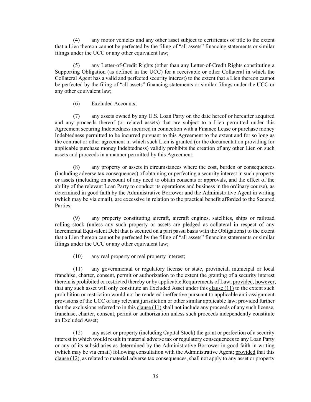 36 (4) any motor vehicles and any other asset subject to certificates of title to the extent that a Lien thereon cannot be perfected by the filing of “all assets” financing statements or similar filings under the UCC or any other equivalent law; (5) any Letter-of-Credit Rights (other than any Letter-of-Credit Rights constituting a Supporting Obligation (as defined in the UCC) for a receivable or other Collateral in which the Collateral Agent has a valid and perfected security interest) to the extent that a Lien thereon cannot be perfected by the filing of “all assets” financing statements or similar filings under the UCC or any other equivalent law; (6) Excluded Accounts; (7) any assets owned by any U.S. Loan Party on the date hereof or hereafter acquired and any proceeds thereof (or related assets) that are subject to a Lien permitted under this Agreement securing Indebtedness incurred in connection with a Finance Lease or purchase money Indebtedness permitted to be incurred pursuant to this Agreement to the extent and for so long as the contract or other agreement in which such Lien is granted (or the documentation providing for applicable purchase money Indebtedness) validly prohibits the creation of any other Lien on such assets and proceeds in a manner permitted by this Agreement; (8) any property or assets in circumstances where the cost, burden or consequences (including adverse tax consequences) of obtaining or perfecting a security interest in such property or assets (including on account of any need to obtain consents or approvals, and the effect of the ability of the relevant Loan Party to conduct its operations and business in the ordinary course), as determined in good faith by the Administrative Borrower and the Administrative Agent in writing (which may be via email), are excessive in relation to the practical benefit afforded to the Secured Parties; (9) any property constituting aircraft, aircraft engines, satellites, ships or railroad rolling stock (unless any such property or assets are pledged as collateral in respect of any Incremental Equivalent Debt that is secured on a pari passu basis with the Obligations) to the extent that a Lien thereon cannot be perfected by the filing of “all assets” financing statements or similar filings under the UCC or any other equivalent law; (10) any real property or real property interest; (11) any governmental or regulatory license or state, provincial, municipal or local franchise, charter, consent, permit or authorization to the extent the granting of a security interest therein is prohibited or restricted thereby or by applicable Requirements of Law; provided, however, that any such asset will only constitute an Excluded Asset under this clause (11) to the extent such prohibition or restriction would not be rendered ineffective pursuant to applicable anti-assignment provisions of the UCC of any relevant jurisdiction or other similar applicable law; provided further that the exclusions referred to in this clause (11) shall not include any proceeds of any such license, franchise, charter, consent, permit or authorization unless such proceeds independently constitute an Excluded Asset; (12) any asset or property (including Capital Stock) the grant or perfection of a security interest in which would result in material adverse tax or regulatory consequences to any Loan Party or any of its subsidiaries as determined by the Administrative Borrower in good faith in writing (which may be via email) following consultation with the Administrative Agent; provided that this clause (12), as related to material adverse tax consequences, shall not apply to any asset or property