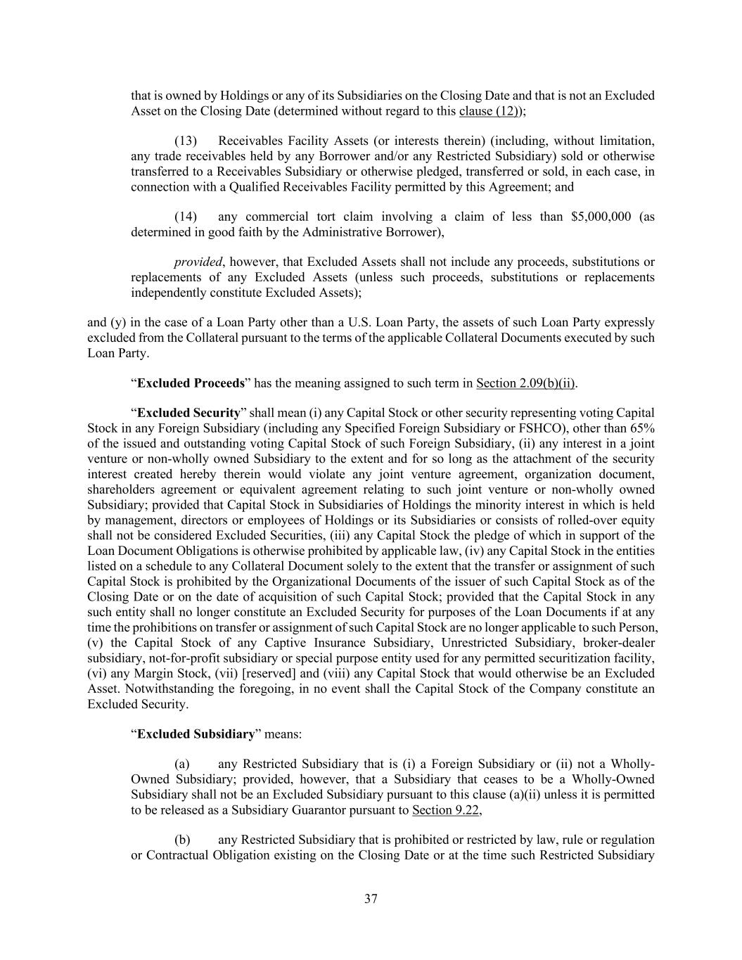 37 that is owned by Holdings or any of its Subsidiaries on the Closing Date and that is not an Excluded Asset on the Closing Date (determined without regard to this clause (12)); (13) Receivables Facility Assets (or interests therein) (including, without limitation, any trade receivables held by any Borrower and/or any Restricted Subsidiary) sold or otherwise transferred to a Receivables Subsidiary or otherwise pledged, transferred or sold, in each case, in connection with a Qualified Receivables Facility permitted by this Agreement; and (14) any commercial tort claim involving a claim of less than $5,000,000 (as determined in good faith by the Administrative Borrower), provided, however, that Excluded Assets shall not include any proceeds, substitutions or replacements of any Excluded Assets (unless such proceeds, substitutions or replacements independently constitute Excluded Assets); and (y) in the case of a Loan Party other than a U.S. Loan Party, the assets of such Loan Party expressly excluded from the Collateral pursuant to the terms of the applicable Collateral Documents executed by such Loan Party. “Excluded Proceeds” has the meaning assigned to such term in Section 2.09(b)(ii). “Excluded Security” shall mean (i) any Capital Stock or other security representing voting Capital Stock in any Foreign Subsidiary (including any Specified Foreign Subsidiary or FSHCO), other than 65% of the issued and outstanding voting Capital Stock of such Foreign Subsidiary, (ii) any interest in a joint venture or non-wholly owned Subsidiary to the extent and for so long as the attachment of the security interest created hereby therein would violate any joint venture agreement, organization document, shareholders agreement or equivalent agreement relating to such joint venture or non-wholly owned Subsidiary; provided that Capital Stock in Subsidiaries of Holdings the minority interest in which is held by management, directors or employees of Holdings or its Subsidiaries or consists of rolled-over equity shall not be considered Excluded Securities, (iii) any Capital Stock the pledge of which in support of the Loan Document Obligations is otherwise prohibited by applicable law, (iv) any Capital Stock in the entities listed on a schedule to any Collateral Document solely to the extent that the transfer or assignment of such Capital Stock is prohibited by the Organizational Documents of the issuer of such Capital Stock as of the Closing Date or on the date of acquisition of such Capital Stock; provided that the Capital Stock in any such entity shall no longer constitute an Excluded Security for purposes of the Loan Documents if at any time the prohibitions on transfer or assignment of such Capital Stock are no longer applicable to such Person, (v) the Capital Stock of any Captive Insurance Subsidiary, Unrestricted Subsidiary, broker-dealer subsidiary, not-for-profit subsidiary or special purpose entity used for any permitted securitization facility, (vi) any Margin Stock, (vii) [reserved] and (viii) any Capital Stock that would otherwise be an Excluded Asset. Notwithstanding the foregoing, in no event shall the Capital Stock of the Company constitute an Excluded Security. “Excluded Subsidiary” means: (a) any Restricted Subsidiary that is (i) a Foreign Subsidiary or (ii) not a Wholly- Owned Subsidiary; provided, however, that a Subsidiary that ceases to be a Wholly-Owned Subsidiary shall not be an Excluded Subsidiary pursuant to this clause (a)(ii) unless it is permitted to be released as a Subsidiary Guarantor pursuant to Section 9.22, (b) any Restricted Subsidiary that is prohibited or restricted by law, rule or regulation or Contractual Obligation existing on the Closing Date or at the time such Restricted Subsidiary
