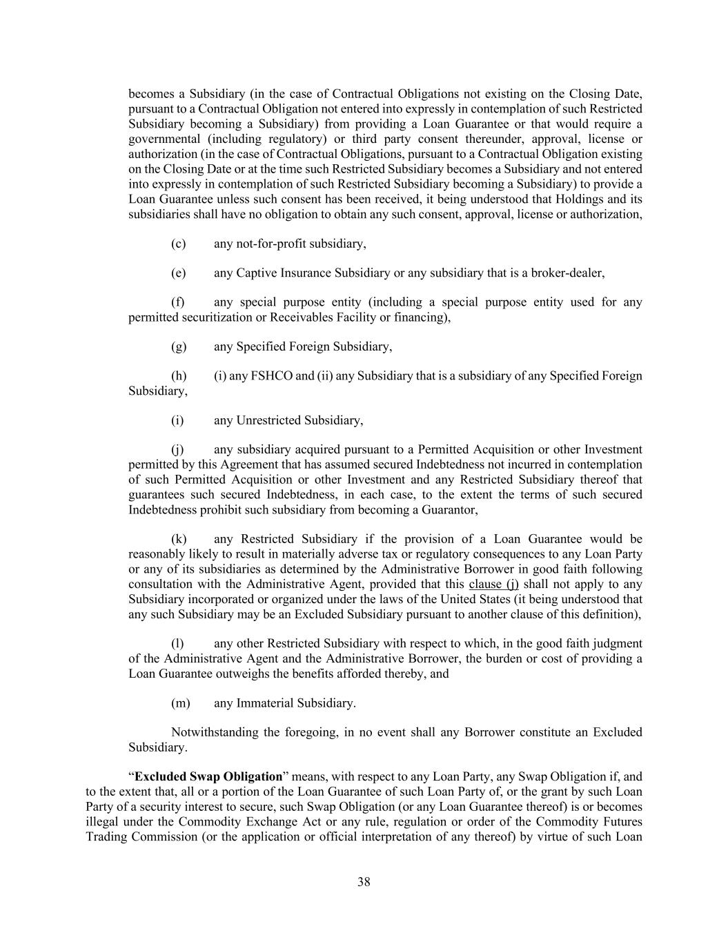 38 becomes a Subsidiary (in the case of Contractual Obligations not existing on the Closing Date, pursuant to a Contractual Obligation not entered into expressly in contemplation of such Restricted Subsidiary becoming a Subsidiary) from providing a Loan Guarantee or that would require a governmental (including regulatory) or third party consent thereunder, approval, license or authorization (in the case of Contractual Obligations, pursuant to a Contractual Obligation existing on the Closing Date or at the time such Restricted Subsidiary becomes a Subsidiary and not entered into expressly in contemplation of such Restricted Subsidiary becoming a Subsidiary) to provide a Loan Guarantee unless such consent has been received, it being understood that Holdings and its subsidiaries shall have no obligation to obtain any such consent, approval, license or authorization, (c) any not-for-profit subsidiary, (e) any Captive Insurance Subsidiary or any subsidiary that is a broker-dealer, (f) any special purpose entity (including a special purpose entity used for any permitted securitization or Receivables Facility or financing), (g) any Specified Foreign Subsidiary, (h) (i) any FSHCO and (ii) any Subsidiary that is a subsidiary of any Specified Foreign Subsidiary, (i) any Unrestricted Subsidiary, (j) any subsidiary acquired pursuant to a Permitted Acquisition or other Investment permitted by this Agreement that has assumed secured Indebtedness not incurred in contemplation of such Permitted Acquisition or other Investment and any Restricted Subsidiary thereof that guarantees such secured Indebtedness, in each case, to the extent the terms of such secured Indebtedness prohibit such subsidiary from becoming a Guarantor, (k) any Restricted Subsidiary if the provision of a Loan Guarantee would be reasonably likely to result in materially adverse tax or regulatory consequences to any Loan Party or any of its subsidiaries as determined by the Administrative Borrower in good faith following consultation with the Administrative Agent, provided that this clause (j) shall not apply to any Subsidiary incorporated or organized under the laws of the United States (it being understood that any such Subsidiary may be an Excluded Subsidiary pursuant to another clause of this definition), (l) any other Restricted Subsidiary with respect to which, in the good faith judgment of the Administrative Agent and the Administrative Borrower, the burden or cost of providing a Loan Guarantee outweighs the benefits afforded thereby, and (m) any Immaterial Subsidiary. Notwithstanding the foregoing, in no event shall any Borrower constitute an Excluded Subsidiary. “Excluded Swap Obligation” means, with respect to any Loan Party, any Swap Obligation if, and to the extent that, all or a portion of the Loan Guarantee of such Loan Party of, or the grant by such Loan Party of a security interest to secure, such Swap Obligation (or any Loan Guarantee thereof) is or becomes illegal under the Commodity Exchange Act or any rule, regulation or order of the Commodity Futures Trading Commission (or the application or official interpretation of any thereof) by virtue of such Loan