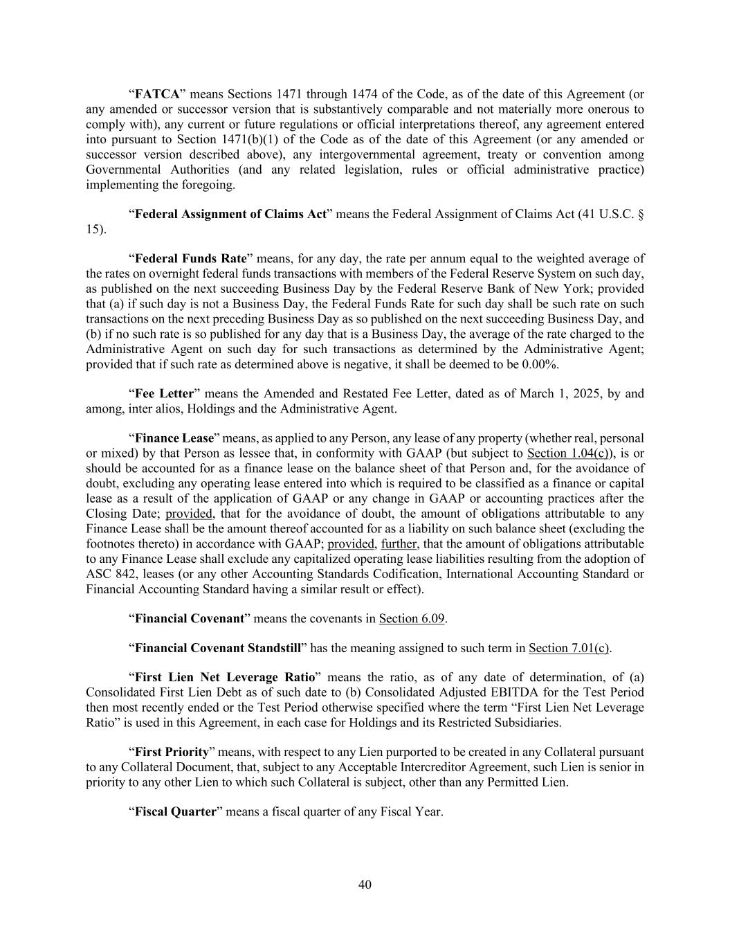 40 “FATCA” means Sections 1471 through 1474 of the Code, as of the date of this Agreement (or any amended or successor version that is substantively comparable and not materially more onerous to comply with), any current or future regulations or official interpretations thereof, any agreement entered into pursuant to Section 1471(b)(1) of the Code as of the date of this Agreement (or any amended or successor version described above), any intergovernmental agreement, treaty or convention among Governmental Authorities (and any related legislation, rules or official administrative practice) implementing the foregoing. “Federal Assignment of Claims Act” means the Federal Assignment of Claims Act (41 U.S.C. § 15). “Federal Funds Rate” means, for any day, the rate per annum equal to the weighted average of the rates on overnight federal funds transactions with members of the Federal Reserve System on such day, as published on the next succeeding Business Day by the Federal Reserve Bank of New York; provided that (a) if such day is not a Business Day, the Federal Funds Rate for such day shall be such rate on such transactions on the next preceding Business Day as so published on the next succeeding Business Day, and (b) if no such rate is so published for any day that is a Business Day, the average of the rate charged to the Administrative Agent on such day for such transactions as determined by the Administrative Agent; provided that if such rate as determined above is negative, it shall be deemed to be 0.00%. “Fee Letter” means the Amended and Restated Fee Letter, dated as of March 1, 2025, by and among, inter alios, Holdings and the Administrative Agent. “Finance Lease” means, as applied to any Person, any lease of any property (whether real, personal or mixed) by that Person as lessee that, in conformity with GAAP (but subject to Section 1.04(c)), is or should be accounted for as a finance lease on the balance sheet of that Person and, for the avoidance of doubt, excluding any operating lease entered into which is required to be classified as a finance or capital lease as a result of the application of GAAP or any change in GAAP or accounting practices after the Closing Date; provided, that for the avoidance of doubt, the amount of obligations attributable to any Finance Lease shall be the amount thereof accounted for as a liability on such balance sheet (excluding the footnotes thereto) in accordance with GAAP; provided, further, that the amount of obligations attributable to any Finance Lease shall exclude any capitalized operating lease liabilities resulting from the adoption of ASC 842, leases (or any other Accounting Standards Codification, International Accounting Standard or Financial Accounting Standard having a similar result or effect). “Financial Covenant” means the covenants in Section 6.09. “Financial Covenant Standstill” has the meaning assigned to such term in Section 7.01(c). “First Lien Net Leverage Ratio” means the ratio, as of any date of determination, of (a) Consolidated First Lien Debt as of such date to (b) Consolidated Adjusted EBITDA for the Test Period then most recently ended or the Test Period otherwise specified where the term “First Lien Net Leverage Ratio” is used in this Agreement, in each case for Holdings and its Restricted Subsidiaries. “First Priority” means, with respect to any Lien purported to be created in any Collateral pursuant to any Collateral Document, that, subject to any Acceptable Intercreditor Agreement, such Lien is senior in priority to any other Lien to which such Collateral is subject, other than any Permitted Lien. “Fiscal Quarter” means a fiscal quarter of any Fiscal Year.