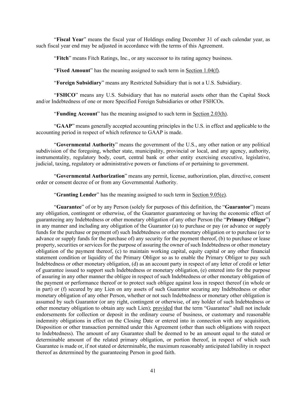 41 “Fiscal Year” means the fiscal year of Holdings ending December 31 of each calendar year, as such fiscal year end may be adjusted in accordance with the terms of this Agreement. “Fitch” means Fitch Ratings, Inc., or any successor to its rating agency business. “Fixed Amount” has the meaning assigned to such term in Section 1.04(f). “Foreign Subsidiary” means any Restricted Subsidiary that is not a U.S. Subsidiary. “FSHCO” means any U.S. Subsidiary that has no material assets other than the Capital Stock and/or Indebtedness of one or more Specified Foreign Subsidiaries or other FSHCOs. “Funding Account” has the meaning assigned to such term in Section 2.03(h). “GAAP” means generally accepted accounting principles in the U.S. in effect and applicable to the accounting period in respect of which reference to GAAP is made. “Governmental Authority” means the government of the U.S., any other nation or any political subdivision of the foregoing, whether state, municipality, provincial or local, and any agency, authority, instrumentality, regulatory body, court, central bank or other entity exercising executive, legislative, judicial, taxing, regulatory or administrative powers or functions of or pertaining to government. “Governmental Authorization” means any permit, license, authorization, plan, directive, consent order or consent decree of or from any Governmental Authority. “Granting Lender” has the meaning assigned to such term in Section 9.05(e). “Guarantee” of or by any Person (solely for purposes of this definition, the “Guarantor”) means any obligation, contingent or otherwise, of the Guarantor guaranteeing or having the economic effect of guaranteeing any Indebtedness or other monetary obligation of any other Person (the “Primary Obligor”) in any manner and including any obligation of the Guarantor (a) to purchase or pay (or advance or supply funds for the purchase or payment of) such Indebtedness or other monetary obligation or to purchase (or to advance or supply funds for the purchase of) any security for the payment thereof, (b) to purchase or lease property, securities or services for the purpose of assuring the owner of such Indebtedness or other monetary obligation of the payment thereof, (c) to maintain working capital, equity capital or any other financial statement condition or liquidity of the Primary Obligor so as to enable the Primary Obligor to pay such Indebtedness or other monetary obligation, (d) as an account party in respect of any letter of credit or letter of guarantee issued to support such Indebtedness or monetary obligation, (e) entered into for the purpose of assuring in any other manner the obligee in respect of such Indebtedness or other monetary obligation of the payment or performance thereof or to protect such obligee against loss in respect thereof (in whole or in part) or (f) secured by any Lien on any assets of such Guarantor securing any Indebtedness or other monetary obligation of any other Person, whether or not such Indebtedness or monetary other obligation is assumed by such Guarantor (or any right, contingent or otherwise, of any holder of such Indebtedness or other monetary obligation to obtain any such Lien); provided that the term “Guarantee” shall not include endorsements for collection or deposit in the ordinary course of business, or customary and reasonable indemnity obligations in effect on the Closing Date or entered into in connection with any acquisition, Disposition or other transaction permitted under this Agreement (other than such obligations with respect to Indebtedness). The amount of any Guarantee shall be deemed to be an amount equal to the stated or determinable amount of the related primary obligation, or portion thereof, in respect of which such Guarantee is made or, if not stated or determinable, the maximum reasonably anticipated liability in respect thereof as determined by the guaranteeing Person in good faith.