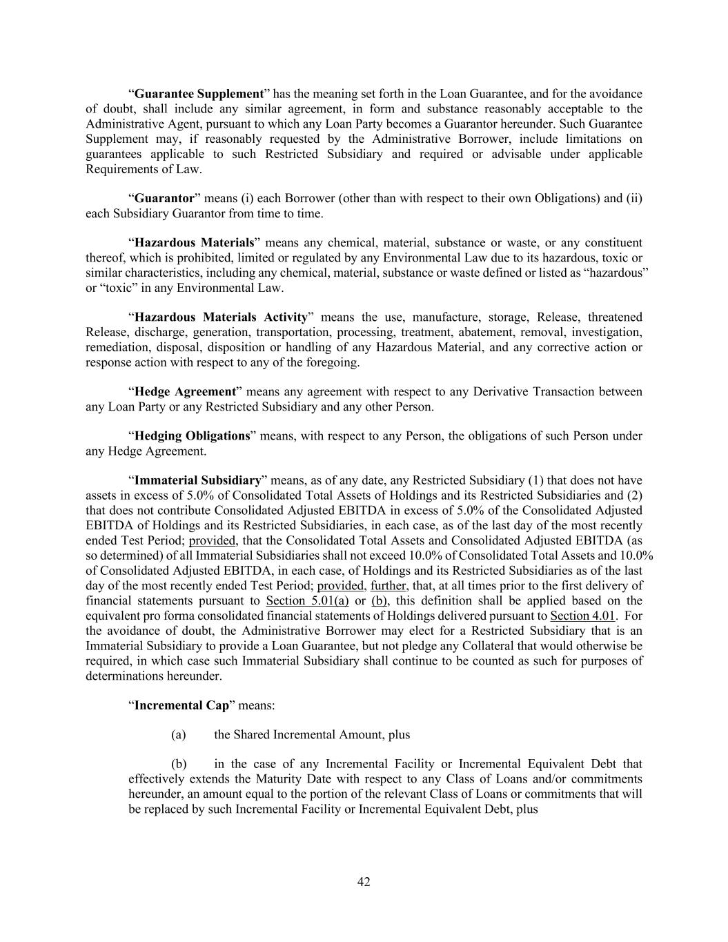 42 “Guarantee Supplement” has the meaning set forth in the Loan Guarantee, and for the avoidance of doubt, shall include any similar agreement, in form and substance reasonably acceptable to the Administrative Agent, pursuant to which any Loan Party becomes a Guarantor hereunder. Such Guarantee Supplement may, if reasonably requested by the Administrative Borrower, include limitations on guarantees applicable to such Restricted Subsidiary and required or advisable under applicable Requirements of Law. “Guarantor” means (i) each Borrower (other than with respect to their own Obligations) and (ii) each Subsidiary Guarantor from time to time. “Hazardous Materials” means any chemical, material, substance or waste, or any constituent thereof, which is prohibited, limited or regulated by any Environmental Law due to its hazardous, toxic or similar characteristics, including any chemical, material, substance or waste defined or listed as “hazardous” or “toxic” in any Environmental Law. “Hazardous Materials Activity” means the use, manufacture, storage, Release, threatened Release, discharge, generation, transportation, processing, treatment, abatement, removal, investigation, remediation, disposal, disposition or handling of any Hazardous Material, and any corrective action or response action with respect to any of the foregoing. “Hedge Agreement” means any agreement with respect to any Derivative Transaction between any Loan Party or any Restricted Subsidiary and any other Person. “Hedging Obligations” means, with respect to any Person, the obligations of such Person under any Hedge Agreement. “Immaterial Subsidiary” means, as of any date, any Restricted Subsidiary (1) that does not have assets in excess of 5.0% of Consolidated Total Assets of Holdings and its Restricted Subsidiaries and (2) that does not contribute Consolidated Adjusted EBITDA in excess of 5.0% of the Consolidated Adjusted EBITDA of Holdings and its Restricted Subsidiaries, in each case, as of the last day of the most recently ended Test Period; provided, that the Consolidated Total Assets and Consolidated Adjusted EBITDA (as so determined) of all Immaterial Subsidiaries shall not exceed 10.0% of Consolidated Total Assets and 10.0% of Consolidated Adjusted EBITDA, in each case, of Holdings and its Restricted Subsidiaries as of the last day of the most recently ended Test Period; provided, further, that, at all times prior to the first delivery of financial statements pursuant to Section 5.01(a) or (b), this definition shall be applied based on the equivalent pro forma consolidated financial statements of Holdings delivered pursuant to Section 4.01. For the avoidance of doubt, the Administrative Borrower may elect for a Restricted Subsidiary that is an Immaterial Subsidiary to provide a Loan Guarantee, but not pledge any Collateral that would otherwise be required, in which case such Immaterial Subsidiary shall continue to be counted as such for purposes of determinations hereunder. “Incremental Cap” means: (a) the Shared Incremental Amount, plus (b) in the case of any Incremental Facility or Incremental Equivalent Debt that effectively extends the Maturity Date with respect to any Class of Loans and/or commitments hereunder, an amount equal to the portion of the relevant Class of Loans or commitments that will be replaced by such Incremental Facility or Incremental Equivalent Debt, plus