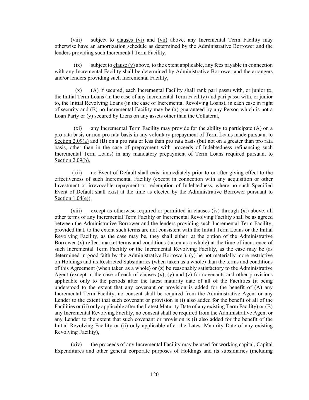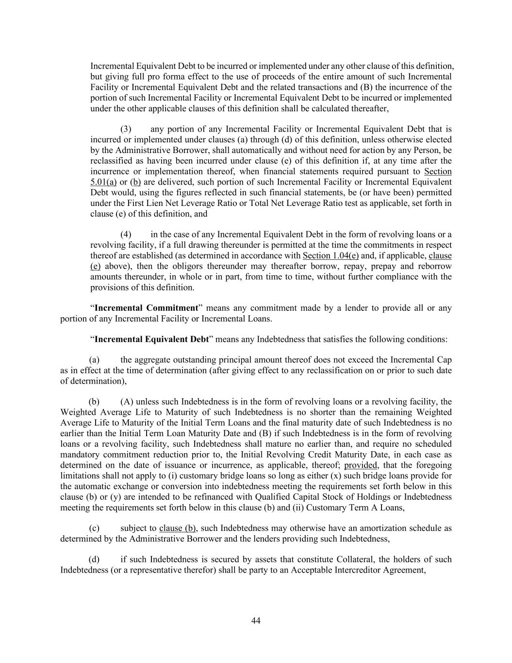 44 Incremental Equivalent Debt to be incurred or implemented under any other clause of this definition, but giving full pro forma effect to the use of proceeds of the entire amount of such Incremental Facility or Incremental Equivalent Debt and the related transactions and (B) the incurrence of the portion of such Incremental Facility or Incremental Equivalent Debt to be incurred or implemented under the other applicable clauses of this definition shall be calculated thereafter, (3) any portion of any Incremental Facility or Incremental Equivalent Debt that is incurred or implemented under clauses (a) through (d) of this definition, unless otherwise elected by the Administrative Borrower, shall automatically and without need for action by any Person, be reclassified as having been incurred under clause (e) of this definition if, at any time after the incurrence or implementation thereof, when financial statements required pursuant to Section 5.01(a) or (b) are delivered, such portion of such Incremental Facility or Incremental Equivalent Debt would, using the figures reflected in such financial statements, be (or have been) permitted under the First Lien Net Leverage Ratio or Total Net Leverage Ratio test as applicable, set forth in clause (e) of this definition, and (4) in the case of any Incremental Equivalent Debt in the form of revolving loans or a revolving facility, if a full drawing thereunder is permitted at the time the commitments in respect thereof are established (as determined in accordance with Section 1.04(e) and, if applicable, clause (e) above), then the obligors thereunder may thereafter borrow, repay, prepay and reborrow amounts thereunder, in whole or in part, from time to time, without further compliance with the provisions of this definition. “Incremental Commitment” means any commitment made by a lender to provide all or any portion of any Incremental Facility or Incremental Loans. “Incremental Equivalent Debt” means any Indebtedness that satisfies the following conditions: (a) the aggregate outstanding principal amount thereof does not exceed the Incremental Cap as in effect at the time of determination (after giving effect to any reclassification on or prior to such date of determination), (b) (A) unless such Indebtedness is in the form of revolving loans or a revolving facility, the Weighted Average Life to Maturity of such Indebtedness is no shorter than the remaining Weighted Average Life to Maturity of the Initial Term Loans and the final maturity date of such Indebtedness is no earlier than the Initial Term Loan Maturity Date and (B) if such Indebtedness is in the form of revolving loans or a revolving facility, such Indebtedness shall mature no earlier than, and require no scheduled mandatory commitment reduction prior to, the Initial Revolving Credit Maturity Date, in each case as determined on the date of issuance or incurrence, as applicable, thereof; provided, that the foregoing limitations shall not apply to (i) customary bridge loans so long as either (x) such bridge loans provide for the automatic exchange or conversion into indebtedness meeting the requirements set forth below in this clause (b) or (y) are intended to be refinanced with Qualified Capital Stock of Holdings or Indebtedness meeting the requirements set forth below in this clause (b) and (ii) Customary Term A Loans, (c) subject to clause (b), such Indebtedness may otherwise have an amortization schedule as determined by the Administrative Borrower and the lenders providing such Indebtedness, (d) if such Indebtedness is secured by assets that constitute Collateral, the holders of such Indebtedness (or a representative therefor) shall be party to an Acceptable Intercreditor Agreement,
