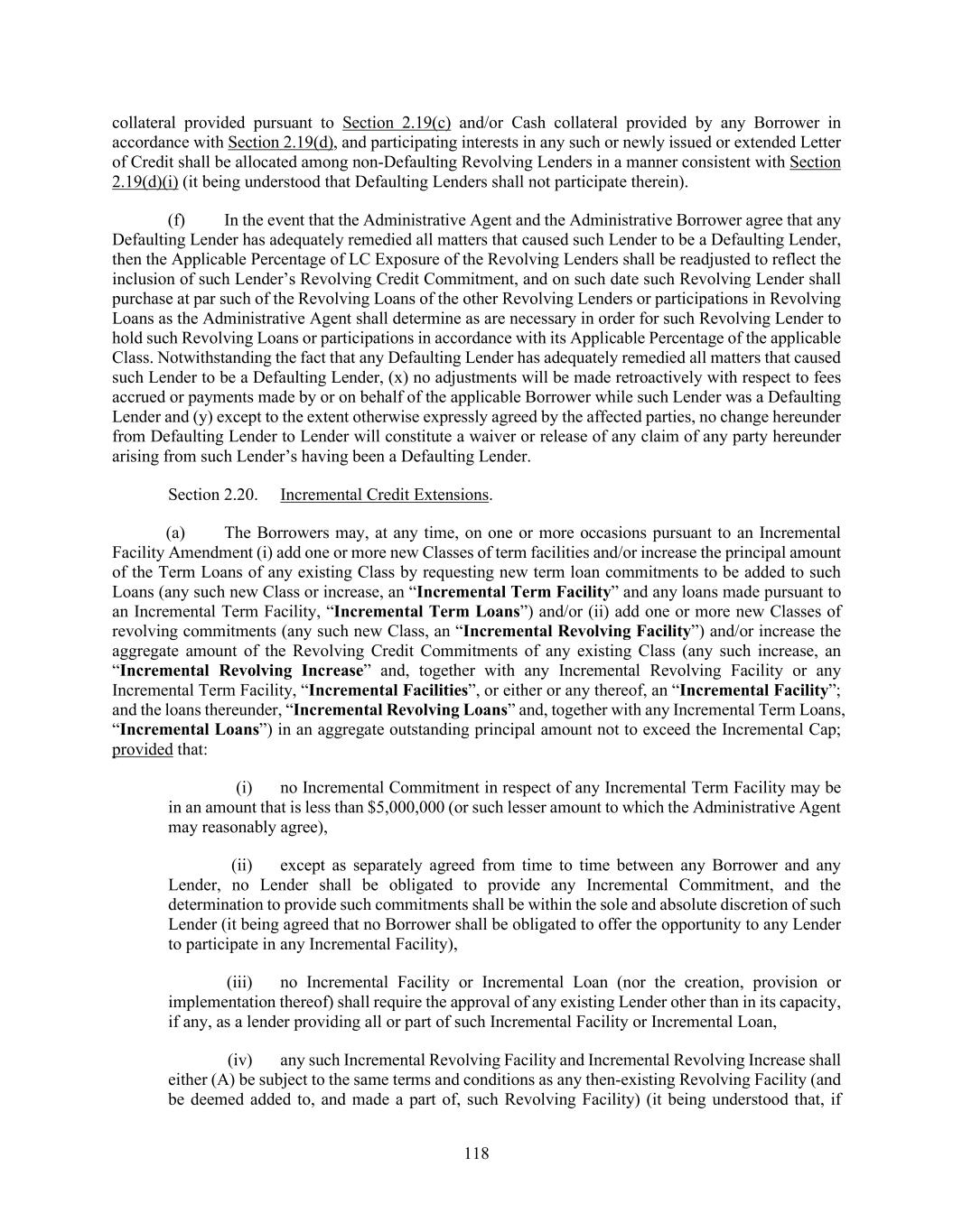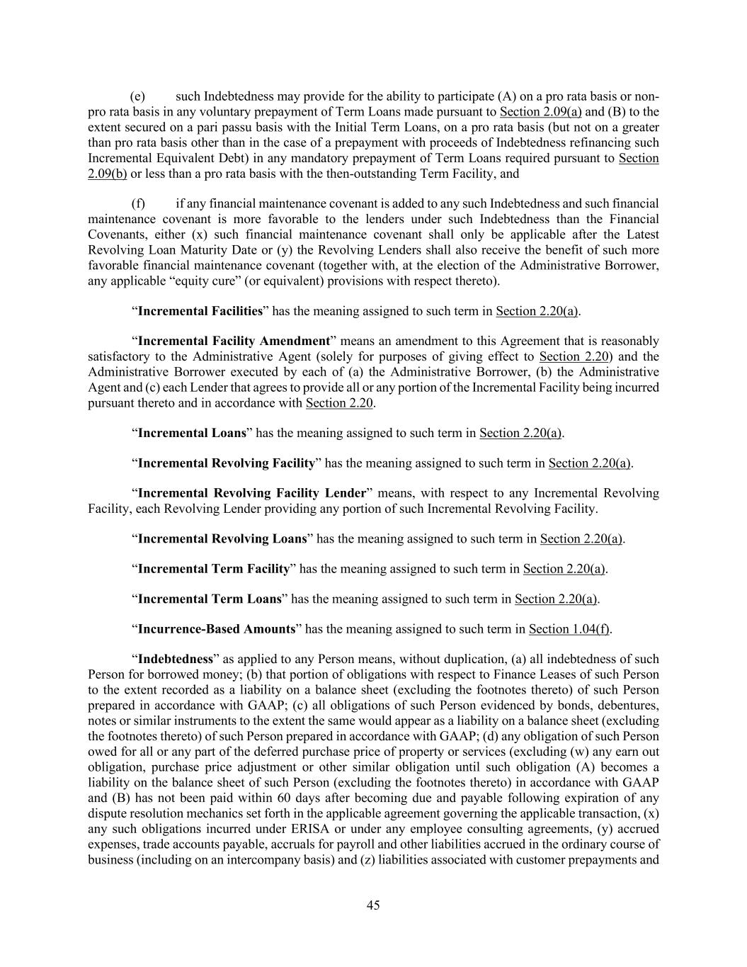 45 (e) such Indebtedness may provide for the ability to participate (A) on a pro rata basis or non- pro rata basis in any voluntary prepayment of Term Loans made pursuant to Section 2.09(a) and (B) to the extent secured on a pari passu basis with the Initial Term Loans, on a pro rata basis (but not on a greater than pro rata basis other than in the case of a prepayment with proceeds of Indebtedness refinancing such Incremental Equivalent Debt) in any mandatory prepayment of Term Loans required pursuant to Section 2.09(b) or less than a pro rata basis with the then-outstanding Term Facility, and (f) if any financial maintenance covenant is added to any such Indebtedness and such financial maintenance covenant is more favorable to the lenders under such Indebtedness than the Financial Covenants, either (x) such financial maintenance covenant shall only be applicable after the Latest Revolving Loan Maturity Date or (y) the Revolving Lenders shall also receive the benefit of such more favorable financial maintenance covenant (together with, at the election of the Administrative Borrower, any applicable “equity cure” (or equivalent) provisions with respect thereto). “Incremental Facilities” has the meaning assigned to such term in Section 2.20(a). “Incremental Facility Amendment” means an amendment to this Agreement that is reasonably satisfactory to the Administrative Agent (solely for purposes of giving effect to Section 2.20) and the Administrative Borrower executed by each of (a) the Administrative Borrower, (b) the Administrative Agent and (c) each Lender that agrees to provide all or any portion of the Incremental Facility being incurred pursuant thereto and in accordance with Section 2.20. “Incremental Loans” has the meaning assigned to such term in Section 2.20(a). “Incremental Revolving Facility” has the meaning assigned to such term in Section 2.20(a). “Incremental Revolving Facility Lender” means, with respect to any Incremental Revolving Facility, each Revolving Lender providing any portion of such Incremental Revolving Facility. “Incremental Revolving Loans” has the meaning assigned to such term in Section 2.20(a). “Incremental Term Facility” has the meaning assigned to such term in Section 2.20(a). “Incremental Term Loans” has the meaning assigned to such term in Section 2.20(a). “Incurrence-Based Amounts” has the meaning assigned to such term in Section 1.04(f). “Indebtedness” as applied to any Person means, without duplication, (a) all indebtedness of such Person for borrowed money; (b) that portion of obligations with respect to Finance Leases of such Person to the extent recorded as a liability on a balance sheet (excluding the footnotes thereto) of such Person prepared in accordance with GAAP; (c) all obligations of such Person evidenced by bonds, debentures, notes or similar instruments to the extent the same would appear as a liability on a balance sheet (excluding the footnotes thereto) of such Person prepared in accordance with GAAP; (d) any obligation of such Person owed for all or any part of the deferred purchase price of property or services (excluding (w) any earn out obligation, purchase price adjustment or other similar obligation until such obligation (A) becomes a liability on the balance sheet of such Person (excluding the footnotes thereto) in accordance with GAAP and (B) has not been paid within 60 days after becoming due and payable following expiration of any dispute resolution mechanics set forth in the applicable agreement governing the applicable transaction, (x) any such obligations incurred under ERISA or under any employee consulting agreements, (y) accrued expenses, trade accounts payable, accruals for payroll and other liabilities accrued in the ordinary course of business (including on an intercompany basis) and (z) liabilities associated with customer prepayments and
