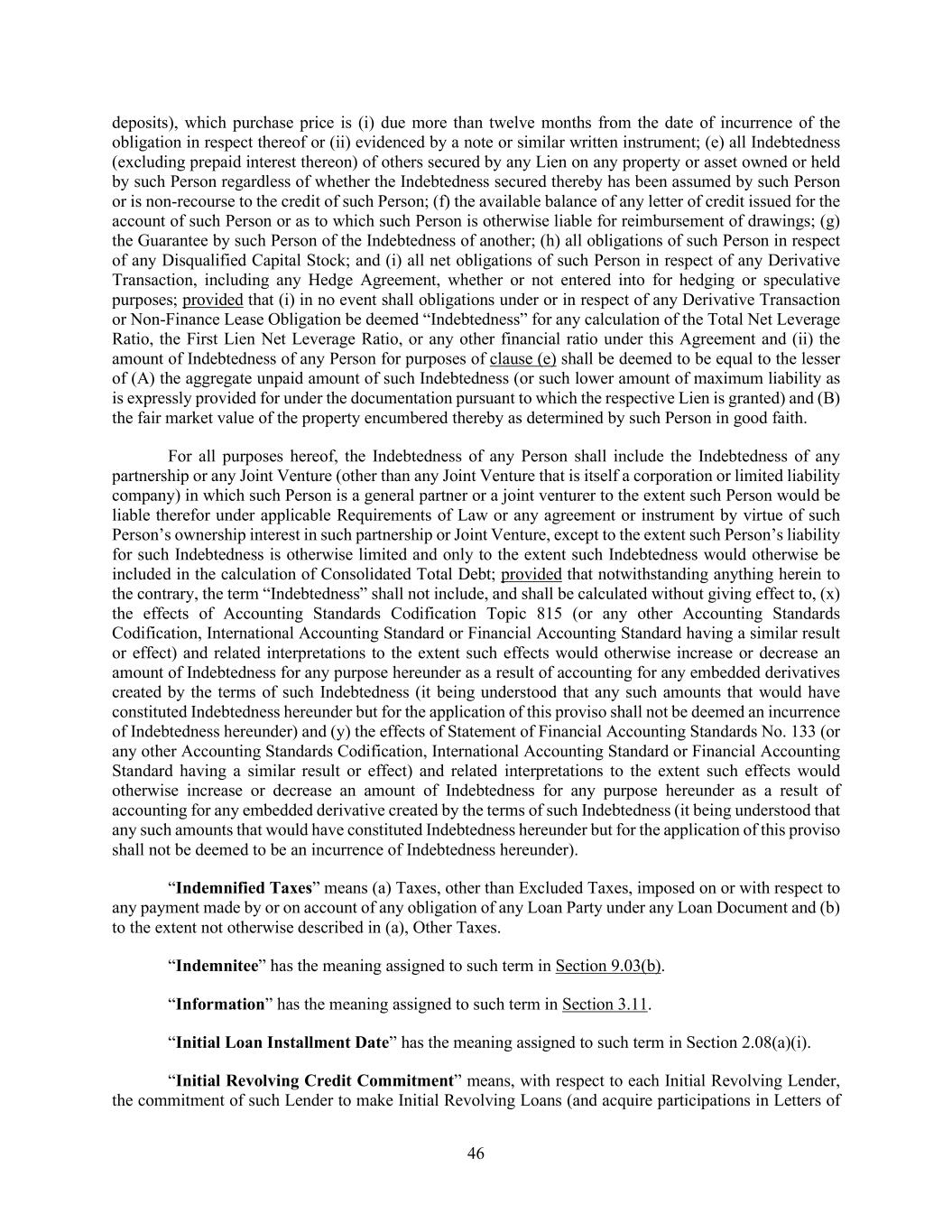 46 deposits), which purchase price is (i) due more than twelve months from the date of incurrence of the obligation in respect thereof or (ii) evidenced by a note or similar written instrument; (e) all Indebtedness (excluding prepaid interest thereon) of others secured by any Lien on any property or asset owned or held by such Person regardless of whether the Indebtedness secured thereby has been assumed by such Person or is non-recourse to the credit of such Person; (f) the available balance of any letter of credit issued for the account of such Person or as to which such Person is otherwise liable for reimbursement of drawings; (g) the Guarantee by such Person of the Indebtedness of another; (h) all obligations of such Person in respect of any Disqualified Capital Stock; and (i) all net obligations of such Person in respect of any Derivative Transaction, including any Hedge Agreement, whether or not entered into for hedging or speculative purposes; provided that (i) in no event shall obligations under or in respect of any Derivative Transaction or Non-Finance Lease Obligation be deemed “Indebtedness” for any calculation of the Total Net Leverage Ratio, the First Lien Net Leverage Ratio, or any other financial ratio under this Agreement and (ii) the amount of Indebtedness of any Person for purposes of clause (e) shall be deemed to be equal to the lesser of (A) the aggregate unpaid amount of such Indebtedness (or such lower amount of maximum liability as is expressly provided for under the documentation pursuant to which the respective Lien is granted) and (B) the fair market value of the property encumbered thereby as determined by such Person in good faith. For all purposes hereof, the Indebtedness of any Person shall include the Indebtedness of any partnership or any Joint Venture (other than any Joint Venture that is itself a corporation or limited liability company) in which such Person is a general partner or a joint venturer to the extent such Person would be liable therefor under applicable Requirements of Law or any agreement or instrument by virtue of such Person’s ownership interest in such partnership or Joint Venture, except to the extent such Person’s liability for such Indebtedness is otherwise limited and only to the extent such Indebtedness would otherwise be included in the calculation of Consolidated Total Debt; provided that notwithstanding anything herein to the contrary, the term “Indebtedness” shall not include, and shall be calculated without giving effect to, (x) the effects of Accounting Standards Codification Topic 815 (or any other Accounting Standards Codification, International Accounting Standard or Financial Accounting Standard having a similar result or effect) and related interpretations to the extent such effects would otherwise increase or decrease an amount of Indebtedness for any purpose hereunder as a result of accounting for any embedded derivatives created by the terms of such Indebtedness (it being understood that any such amounts that would have constituted Indebtedness hereunder but for the application of this proviso shall not be deemed an incurrence of Indebtedness hereunder) and (y) the effects of Statement of Financial Accounting Standards No. 133 (or any other Accounting Standards Codification, International Accounting Standard or Financial Accounting Standard having a similar result or effect) and related interpretations to the extent such effects would otherwise increase or decrease an amount of Indebtedness for any purpose hereunder as a result of accounting for any embedded derivative created by the terms of such Indebtedness (it being understood that any such amounts that would have constituted Indebtedness hereunder but for the application of this proviso shall not be deemed to be an incurrence of Indebtedness hereunder). “Indemnified Taxes” means (a) Taxes, other than Excluded Taxes, imposed on or with respect to any payment made by or on account of any obligation of any Loan Party under any Loan Document and (b) to the extent not otherwise described in (a), Other Taxes. “Indemnitee” has the meaning assigned to such term in Section 9.03(b). “Information” has the meaning assigned to such term in Section 3.11. “Initial Loan Installment Date” has the meaning assigned to such term in Section 2.08(a)(i). “Initial Revolving Credit Commitment” means, with respect to each Initial Revolving Lender, the commitment of such Lender to make Initial Revolving Loans (and acquire participations in Letters of