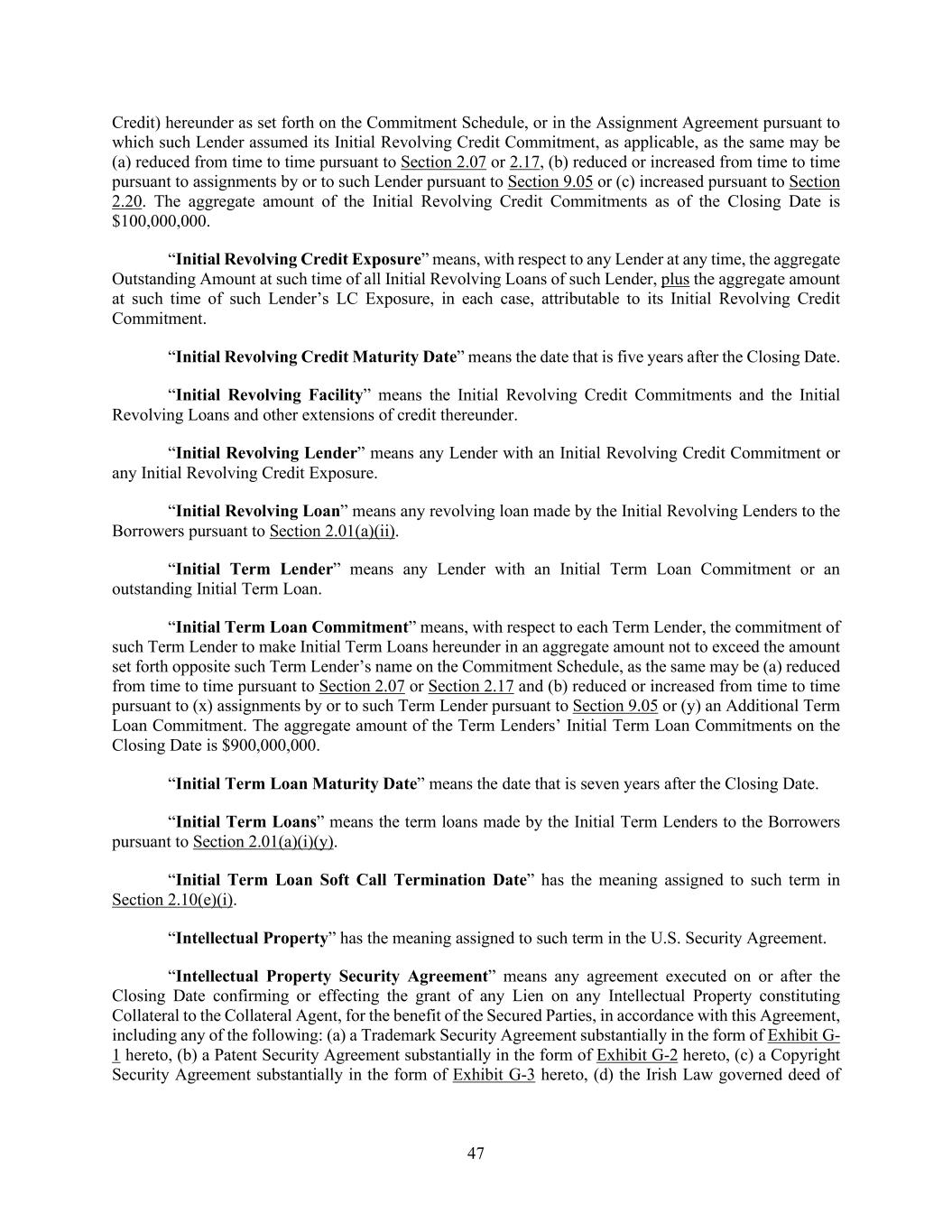 47 Credit) hereunder as set forth on the Commitment Schedule, or in the Assignment Agreement pursuant to which such Lender assumed its Initial Revolving Credit Commitment, as applicable, as the same may be (a) reduced from time to time pursuant to Section 2.07 or 2.17, (b) reduced or increased from time to time pursuant to assignments by or to such Lender pursuant to Section 9.05 or (c) increased pursuant to Section 2.20. The aggregate amount of the Initial Revolving Credit Commitments as of the Closing Date is $100,000,000. “Initial Revolving Credit Exposure” means, with respect to any Lender at any time, the aggregate Outstanding Amount at such time of all Initial Revolving Loans of such Lender, plus the aggregate amount at such time of such Lender’s LC Exposure, in each case, attributable to its Initial Revolving Credit Commitment. “Initial Revolving Credit Maturity Date” means the date that is five years after the Closing Date. “Initial Revolving Facility” means the Initial Revolving Credit Commitments and the Initial Revolving Loans and other extensions of credit thereunder. “Initial Revolving Lender” means any Lender with an Initial Revolving Credit Commitment or any Initial Revolving Credit Exposure. “Initial Revolving Loan” means any revolving loan made by the Initial Revolving Lenders to the Borrowers pursuant to Section 2.01(a)(ii). “Initial Term Lender” means any Lender with an Initial Term Loan Commitment or an outstanding Initial Term Loan. “Initial Term Loan Commitment” means, with respect to each Term Lender, the commitment of such Term Lender to make Initial Term Loans hereunder in an aggregate amount not to exceed the amount set forth opposite such Term Lender’s name on the Commitment Schedule, as the same may be (a) reduced from time to time pursuant to Section 2.07 or Section 2.17 and (b) reduced or increased from time to time pursuant to (x) assignments by or to such Term Lender pursuant to Section 9.05 or (y) an Additional Term Loan Commitment. The aggregate amount of the Term Lenders’ Initial Term Loan Commitments on the Closing Date is $900,000,000. “Initial Term Loan Maturity Date” means the date that is seven years after the Closing Date. “Initial Term Loans” means the term loans made by the Initial Term Lenders to the Borrowers pursuant to Section 2.01(a)(i)(y). “Initial Term Loan Soft Call Termination Date” has the meaning assigned to such term in Section 2.10(e)(i). “Intellectual Property” has the meaning assigned to such term in the U.S. Security Agreement. “Intellectual Property Security Agreement” means any agreement executed on or after the Closing Date confirming or effecting the grant of any Lien on any Intellectual Property constituting Collateral to the Collateral Agent, for the benefit of the Secured Parties, in accordance with this Agreement, including any of the following: (a) a Trademark Security Agreement substantially in the form of Exhibit G- 1 hereto, (b) a Patent Security Agreement substantially in the form of Exhibit G-2 hereto, (c) a Copyright Security Agreement substantially in the form of Exhibit G-3 hereto, (d) the Irish Law governed deed of