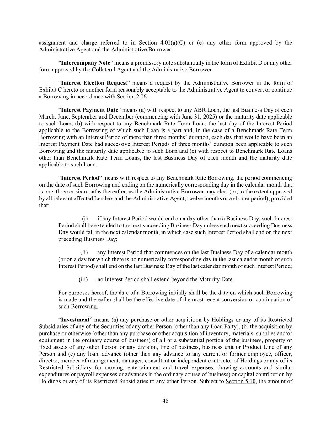 48 assignment and charge referred to in Section 4.01(a)(C) or (e) any other form approved by the Administrative Agent and the Administrative Borrower. “Intercompany Note” means a promissory note substantially in the form of Exhibit D or any other form approved by the Collateral Agent and the Administrative Borrower. “Interest Election Request” means a request by the Administrative Borrower in the form of Exhibit C hereto or another form reasonably acceptable to the Administrative Agent to convert or continue a Borrowing in accordance with Section 2.06. “Interest Payment Date” means (a) with respect to any ABR Loan, the last Business Day of each March, June, September and December (commencing with June 31, 2025) or the maturity date applicable to such Loan, (b) with respect to any Benchmark Rate Term Loan, the last day of the Interest Period applicable to the Borrowing of which such Loan is a part and, in the case of a Benchmark Rate Term Borrowing with an Interest Period of more than three months’ duration, each day that would have been an Interest Payment Date had successive Interest Periods of three months’ duration been applicable to such Borrowing and the maturity date applicable to such Loan and (c) with respect to Benchmark Rate Loans other than Benchmark Rate Term Loans, the last Business Day of each month and the maturity date applicable to such Loan. “Interest Period” means with respect to any Benchmark Rate Borrowing, the period commencing on the date of such Borrowing and ending on the numerically corresponding day in the calendar month that is one, three or six months thereafter, as the Administrative Borrower may elect (or, to the extent approved by all relevant affected Lenders and the Administrative Agent, twelve months or a shorter period); provided that: (i) if any Interest Period would end on a day other than a Business Day, such Interest Period shall be extended to the next succeeding Business Day unless such next succeeding Business Day would fall in the next calendar month, in which case such Interest Period shall end on the next preceding Business Day; (ii) any Interest Period that commences on the last Business Day of a calendar month (or on a day for which there is no numerically corresponding day in the last calendar month of such Interest Period) shall end on the last Business Day of the last calendar month of such Interest Period; (iii) no Interest Period shall extend beyond the Maturity Date. For purposes hereof, the date of a Borrowing initially shall be the date on which such Borrowing is made and thereafter shall be the effective date of the most recent conversion or continuation of such Borrowing. “Investment” means (a) any purchase or other acquisition by Holdings or any of its Restricted Subsidiaries of any of the Securities of any other Person (other than any Loan Party), (b) the acquisition by purchase or otherwise (other than any purchase or other acquisition of inventory, materials, supplies and/or equipment in the ordinary course of business) of all or a substantial portion of the business, property or fixed assets of any other Person or any division, line of business, business unit or Product Line of any Person and (c) any loan, advance (other than any advance to any current or former employee, officer, director, member of management, manager, consultant or independent contractor of Holdings or any of its Restricted Subsidiary for moving, entertainment and travel expenses, drawing accounts and similar expenditures or payroll expenses or advances in the ordinary course of business) or capital contribution by Holdings or any of its Restricted Subsidiaries to any other Person. Subject to Section 5.10, the amount of
