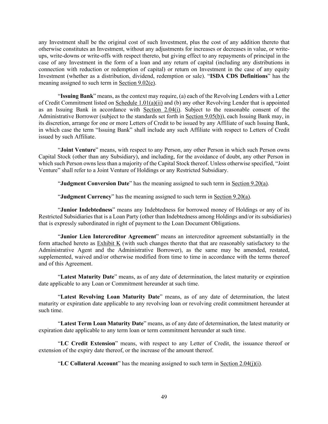 49 any Investment shall be the original cost of such Investment, plus the cost of any addition thereto that otherwise constitutes an Investment, without any adjustments for increases or decreases in value, or write- ups, write-downs or write-offs with respect thereto, but giving effect to any repayments of principal in the case of any Investment in the form of a loan and any return of capital (including any distributions in connection with reduction or redemption of capital) or return on Investment in the case of any equity Investment (whether as a distribution, dividend, redemption or sale). “ISDA CDS Definitions” has the meaning assigned to such term in Section 9.02(e). “Issuing Bank” means, as the context may require, (a) each of the Revolving Lenders with a Letter of Credit Commitment listed on Schedule 1.01(a)(ii) and (b) any other Revolving Lender that is appointed as an Issuing Bank in accordance with Section 2.04(i). Subject to the reasonable consent of the Administrative Borrower (subject to the standards set forth in Section 9.05(b)), each Issuing Bank may, in its discretion, arrange for one or more Letters of Credit to be issued by any Affiliate of such Issuing Bank, in which case the term “Issuing Bank” shall include any such Affiliate with respect to Letters of Credit issued by such Affiliate. “Joint Venture” means, with respect to any Person, any other Person in which such Person owns Capital Stock (other than any Subsidiary), and including, for the avoidance of doubt, any other Person in which such Person owns less than a majority of the Capital Stock thereof. Unless otherwise specified, “Joint Venture” shall refer to a Joint Venture of Holdings or any Restricted Subsidiary. “Judgment Conversion Date” has the meaning assigned to such term in Section 9.20(a). “Judgment Currency” has the meaning assigned to such term in Section 9.20(a). “Junior Indebtedness” means any Indebtedness for borrowed money of Holdings or any of its Restricted Subsidiaries that is a Loan Party (other than Indebtedness among Holdings and/or its subsidiaries) that is expressly subordinated in right of payment to the Loan Document Obligations. “Junior Lien Intercreditor Agreement” means an intercreditor agreement substantially in the form attached hereto as Exhibit K (with such changes thereto that that are reasonably satisfactory to the Administrative Agent and the Administrative Borrower), as the same may be amended, restated, supplemented, waived and/or otherwise modified from time to time in accordance with the terms thereof and of this Agreement. “Latest Maturity Date” means, as of any date of determination, the latest maturity or expiration date applicable to any Loan or Commitment hereunder at such time. “Latest Revolving Loan Maturity Date” means, as of any date of determination, the latest maturity or expiration date applicable to any revolving loan or revolving credit commitment hereunder at such time. “Latest Term Loan Maturity Date” means, as of any date of determination, the latest maturity or expiration date applicable to any term loan or term commitment hereunder at such time. “LC Credit Extension” means, with respect to any Letter of Credit, the issuance thereof or extension of the expiry date thereof, or the increase of the amount thereof. “LC Collateral Account” has the meaning assigned to such term in Section 2.04(j)(i).