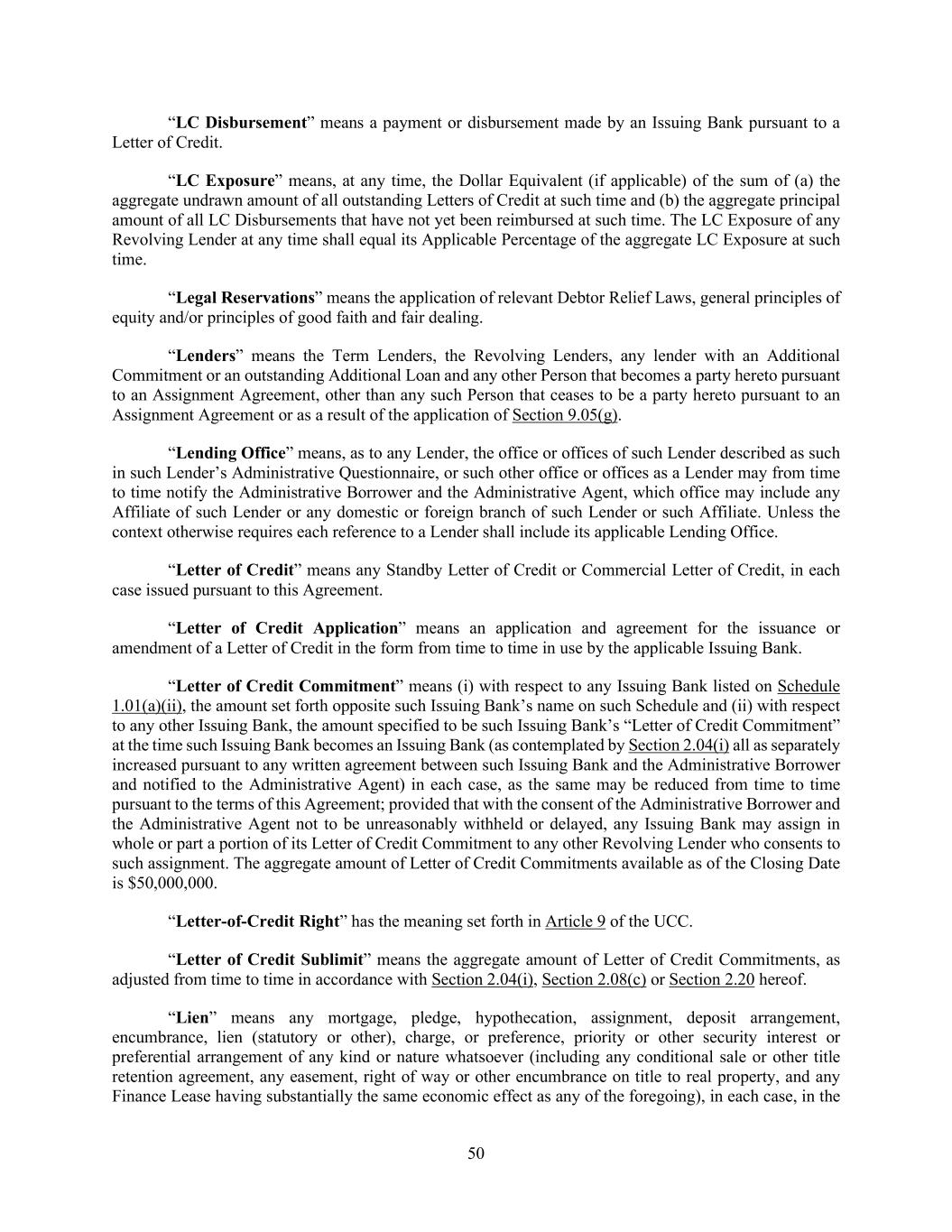 50 “LC Disbursement” means a payment or disbursement made by an Issuing Bank pursuant to a Letter of Credit. “LC Exposure” means, at any time, the Dollar Equivalent (if applicable) of the sum of (a) the aggregate undrawn amount of all outstanding Letters of Credit at such time and (b) the aggregate principal amount of all LC Disbursements that have not yet been reimbursed at such time. The LC Exposure of any Revolving Lender at any time shall equal its Applicable Percentage of the aggregate LC Exposure at such time. “Legal Reservations” means the application of relevant Debtor Relief Laws, general principles of equity and/or principles of good faith and fair dealing. “Lenders” means the Term Lenders, the Revolving Lenders, any lender with an Additional Commitment or an outstanding Additional Loan and any other Person that becomes a party hereto pursuant to an Assignment Agreement, other than any such Person that ceases to be a party hereto pursuant to an Assignment Agreement or as a result of the application of Section 9.05(g). “Lending Office” means, as to any Lender, the office or offices of such Lender described as such in such Lender’s Administrative Questionnaire, or such other office or offices as a Lender may from time to time notify the Administrative Borrower and the Administrative Agent, which office may include any Affiliate of such Lender or any domestic or foreign branch of such Lender or such Affiliate. Unless the context otherwise requires each reference to a Lender shall include its applicable Lending Office. “Letter of Credit” means any Standby Letter of Credit or Commercial Letter of Credit, in each case issued pursuant to this Agreement. “Letter of Credit Application” means an application and agreement for the issuance or amendment of a Letter of Credit in the form from time to time in use by the applicable Issuing Bank. “Letter of Credit Commitment” means (i) with respect to any Issuing Bank listed on Schedule 1.01(a)(ii), the amount set forth opposite such Issuing Bank’s name on such Schedule and (ii) with respect to any other Issuing Bank, the amount specified to be such Issuing Bank’s “Letter of Credit Commitment” at the time such Issuing Bank becomes an Issuing Bank (as contemplated by Section 2.04(i) all as separately increased pursuant to any written agreement between such Issuing Bank and the Administrative Borrower and notified to the Administrative Agent) in each case, as the same may be reduced from time to time pursuant to the terms of this Agreement; provided that with the consent of the Administrative Borrower and the Administrative Agent not to be unreasonably withheld or delayed, any Issuing Bank may assign in whole or part a portion of its Letter of Credit Commitment to any other Revolving Lender who consents to such assignment. The aggregate amount of Letter of Credit Commitments available as of the Closing Date is $50,000,000. “Letter-of-Credit Right” has the meaning set forth in Article 9 of the UCC. “Letter of Credit Sublimit” means the aggregate amount of Letter of Credit Commitments, as adjusted from time to time in accordance with Section 2.04(i), Section 2.08(c) or Section 2.20 hereof. “Lien” means any mortgage, pledge, hypothecation, assignment, deposit arrangement, encumbrance, lien (statutory or other), charge, or preference, priority or other security interest or preferential arrangement of any kind or nature whatsoever (including any conditional sale or other title retention agreement, any easement, right of way or other encumbrance on title to real property, and any Finance Lease having substantially the same economic effect as any of the foregoing), in each case, in the