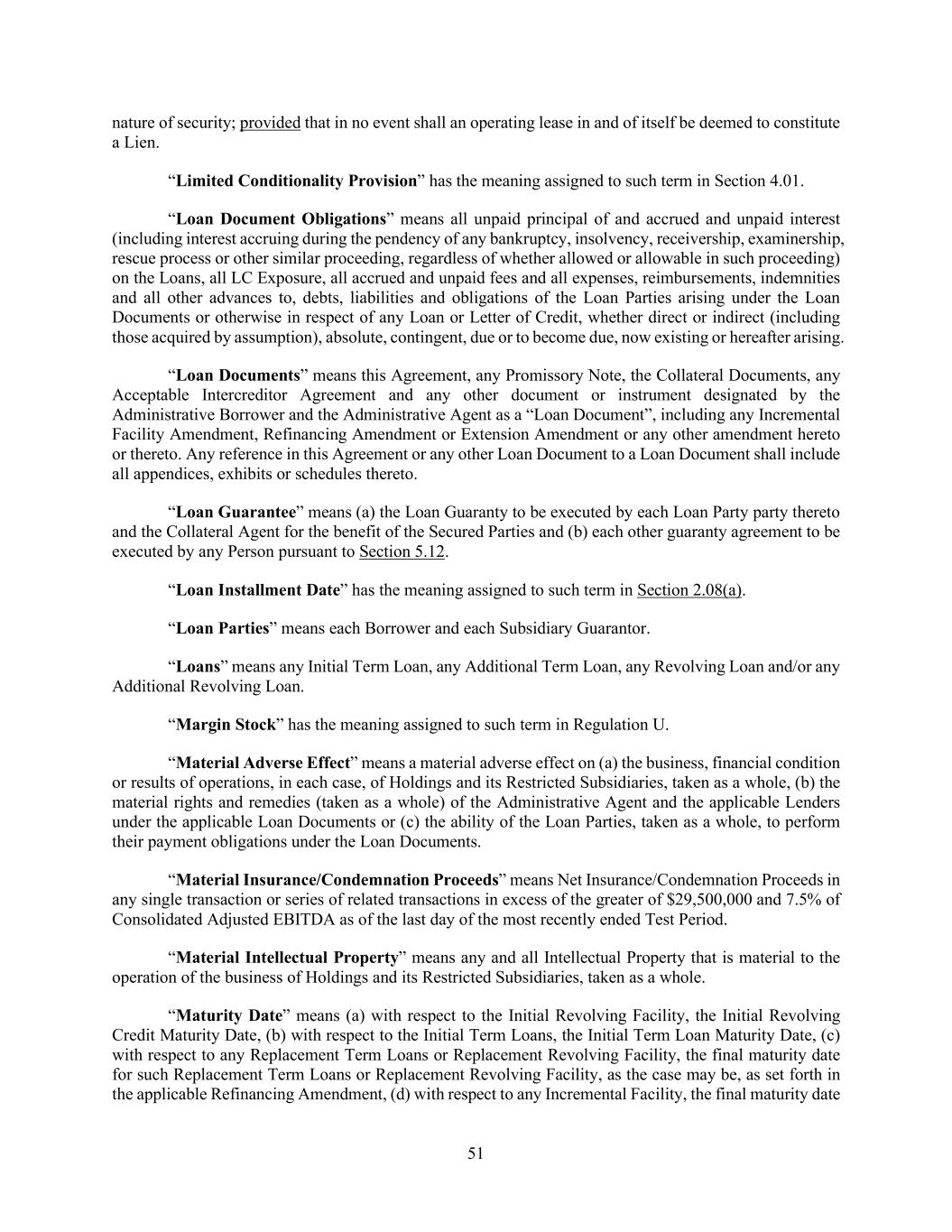 51 nature of security; provided that in no event shall an operating lease in and of itself be deemed to constitute a Lien. “Limited Conditionality Provision” has the meaning assigned to such term in Section 4.01. “Loan Document Obligations” means all unpaid principal of and accrued and unpaid interest (including interest accruing during the pendency of any bankruptcy, insolvency, receivership, examinership, rescue process or other similar proceeding, regardless of whether allowed or allowable in such proceeding) on the Loans, all LC Exposure, all accrued and unpaid fees and all expenses, reimbursements, indemnities and all other advances to, debts, liabilities and obligations of the Loan Parties arising under the Loan Documents or otherwise in respect of any Loan or Letter of Credit, whether direct or indirect (including those acquired by assumption), absolute, contingent, due or to become due, now existing or hereafter arising. “Loan Documents” means this Agreement, any Promissory Note, the Collateral Documents, any Acceptable Intercreditor Agreement and any other document or instrument designated by the Administrative Borrower and the Administrative Agent as a “Loan Document”, including any Incremental Facility Amendment, Refinancing Amendment or Extension Amendment or any other amendment hereto or thereto. Any reference in this Agreement or any other Loan Document to a Loan Document shall include all appendices, exhibits or schedules thereto. “Loan Guarantee” means (a) the Loan Guaranty to be executed by each Loan Party party thereto and the Collateral Agent for the benefit of the Secured Parties and (b) each other guaranty agreement to be executed by any Person pursuant to Section 5.12. “Loan Installment Date” has the meaning assigned to such term in Section 2.08(a). “Loan Parties” means each Borrower and each Subsidiary Guarantor. “Loans” means any Initial Term Loan, any Additional Term Loan, any Revolving Loan and/or any Additional Revolving Loan. “Margin Stock” has the meaning assigned to such term in Regulation U. “Material Adverse Effect” means a material adverse effect on (a) the business, financial condition or results of operations, in each case, of Holdings and its Restricted Subsidiaries, taken as a whole, (b) the material rights and remedies (taken as a whole) of the Administrative Agent and the applicable Lenders under the applicable Loan Documents or (c) the ability of the Loan Parties, taken as a whole, to perform their payment obligations under the Loan Documents. “Material Insurance/Condemnation Proceeds” means Net Insurance/Condemnation Proceeds in any single transaction or series of related transactions in excess of the greater of $29,500,000 and 7.5% of Consolidated Adjusted EBITDA as of the last day of the most recently ended Test Period. “Material Intellectual Property” means any and all Intellectual Property that is material to the operation of the business of Holdings and its Restricted Subsidiaries, taken as a whole. “Maturity Date” means (a) with respect to the Initial Revolving Facility, the Initial Revolving Credit Maturity Date, (b) with respect to the Initial Term Loans, the Initial Term Loan Maturity Date, (c) with respect to any Replacement Term Loans or Replacement Revolving Facility, the final maturity date for such Replacement Term Loans or Replacement Revolving Facility, as the case may be, as set forth in the applicable Refinancing Amendment, (d) with respect to any Incremental Facility, the final maturity date