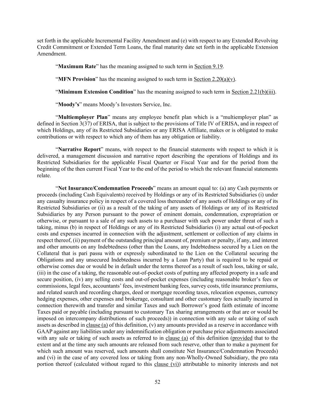 52 set forth in the applicable Incremental Facility Amendment and (e) with respect to any Extended Revolving Credit Commitment or Extended Term Loans, the final maturity date set forth in the applicable Extension Amendment. “Maximum Rate” has the meaning assigned to such term in Section 9.19. “MFN Provision” has the meaning assigned to such term in Section 2.20(a)(v). “Minimum Extension Condition” has the meaning assigned to such term in Section 2.21(b)(iii). “Moody’s” means Moody’s Investors Service, Inc. “Multiemployer Plan” means any employee benefit plan which is a “multiemployer plan” as defined in Section 3(37) of ERISA, that is subject to the provisions of Title IV of ERISA, and in respect of which Holdings, any of its Restricted Subsidiaries or any ERISA Affiliate, makes or is obligated to make contributions or with respect to which any of them has any obligation or liability. “Narrative Report” means, with respect to the financial statements with respect to which it is delivered, a management discussion and narrative report describing the operations of Holdings and its Restricted Subsidiaries for the applicable Fiscal Quarter or Fiscal Year and for the period from the beginning of the then current Fiscal Year to the end of the period to which the relevant financial statements relate. “Net Insurance/Condemnation Proceeds” means an amount equal to: (a) any Cash payments or proceeds (including Cash Equivalents) received by Holdings or any of its Restricted Subsidiaries (i) under any casualty insurance policy in respect of a covered loss thereunder of any assets of Holdings or any of its Restricted Subsidiaries or (ii) as a result of the taking of any assets of Holdings or any of its Restricted Subsidiaries by any Person pursuant to the power of eminent domain, condemnation, expropriation or otherwise, or pursuant to a sale of any such assets to a purchaser with such power under threat of such a taking, minus (b) in respect of Holdings or any of its Restricted Subsidiaries (i) any actual out-of-pocket costs and expenses incurred in connection with the adjustment, settlement or collection of any claims in respect thereof, (ii) payment of the outstanding principal amount of, premium or penalty, if any, and interest and other amounts on any Indebtedness (other than the Loans, any Indebtedness secured by a Lien on the Collateral that is pari passu with or expressly subordinated to the Lien on the Collateral securing the Obligations and any unsecured Indebtedness incurred by a Loan Party) that is required to be repaid or otherwise comes due or would be in default under the terms thereof as a result of such loss, taking or sale, (iii) in the case of a taking, the reasonable out-of-pocket costs of putting any affected property in a safe and secure position, (iv) any selling costs and out-of-pocket expenses (including reasonable broker’s fees or commissions, legal fees, accountants’ fees, investment banking fees, survey costs, title insurance premiums, and related search and recording charges, deed or mortgage recording taxes, relocation expenses, currency hedging expenses, other expenses and brokerage, consultant and other customary fees actually incurred in connection therewith and transfer and similar Taxes and such Borrower’s good faith estimate of income Taxes paid or payable (including pursuant to customary Tax sharing arrangements or that are or would be imposed on intercompany distributions of such proceeds)) in connection with any sale or taking of such assets as described in clause (a) of this definition, (v) any amounts provided as a reserve in accordance with GAAP against any liabilities under any indemnification obligation or purchase price adjustments associated with any sale or taking of such assets as referred to in clause (a) of this definition (provided that to the extent and at the time any such amounts are released from such reserve, other than to make a payment for which such amount was reserved, such amounts shall constitute Net Insurance/Condemnation Proceeds) and (vi) in the case of any covered loss or taking from any non-Wholly-Owned Subsidiary, the pro rata portion thereof (calculated without regard to this clause (vi)) attributable to minority interests and not