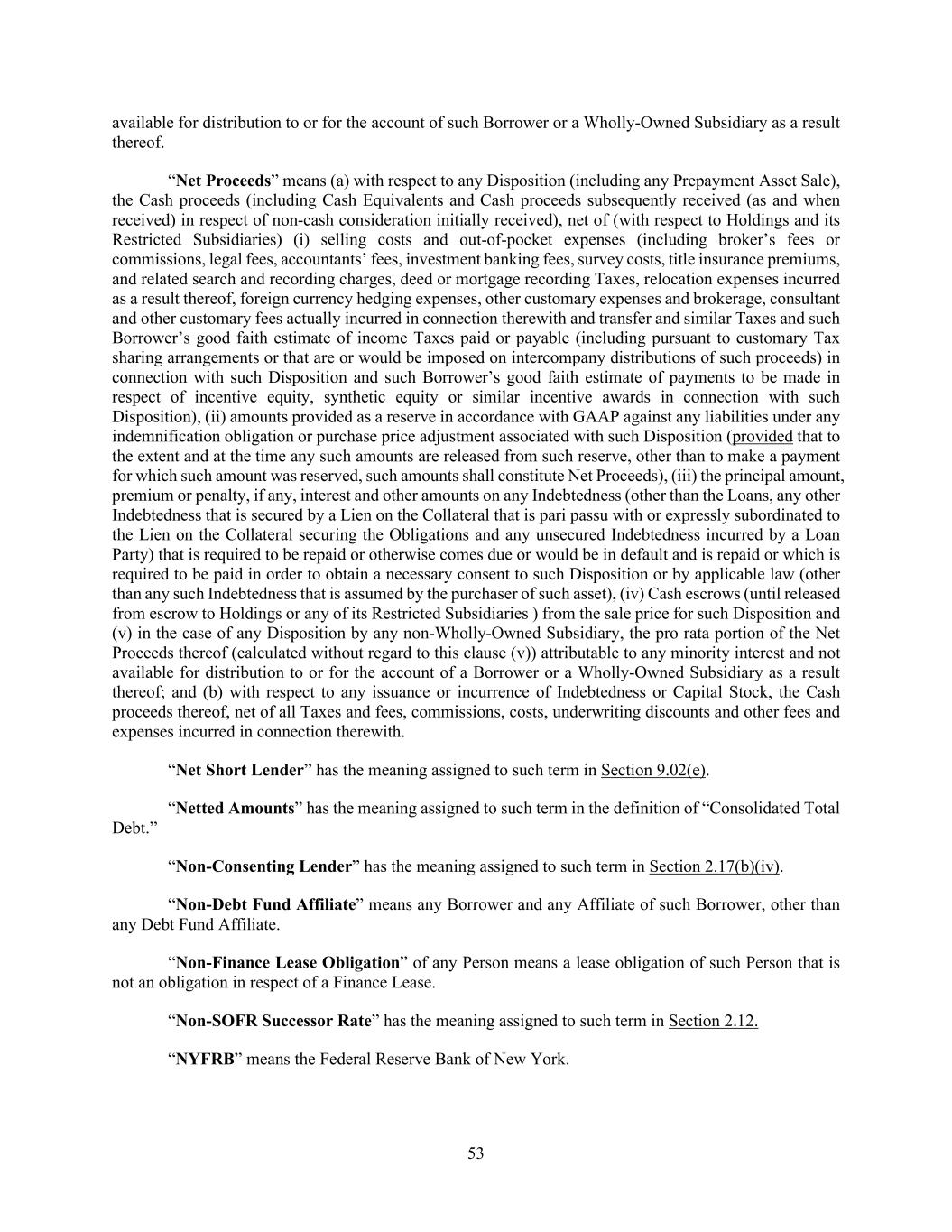 53 available for distribution to or for the account of such Borrower or a Wholly-Owned Subsidiary as a result thereof. “Net Proceeds” means (a) with respect to any Disposition (including any Prepayment Asset Sale), the Cash proceeds (including Cash Equivalents and Cash proceeds subsequently received (as and when received) in respect of non-cash consideration initially received), net of (with respect to Holdings and its Restricted Subsidiaries) (i) selling costs and out-of-pocket expenses (including broker’s fees or commissions, legal fees, accountants’ fees, investment banking fees, survey costs, title insurance premiums, and related search and recording charges, deed or mortgage recording Taxes, relocation expenses incurred as a result thereof, foreign currency hedging expenses, other customary expenses and brokerage, consultant and other customary fees actually incurred in connection therewith and transfer and similar Taxes and such Borrower’s good faith estimate of income Taxes paid or payable (including pursuant to customary Tax sharing arrangements or that are or would be imposed on intercompany distributions of such proceeds) in connection with such Disposition and such Borrower’s good faith estimate of payments to be made in respect of incentive equity, synthetic equity or similar incentive awards in connection with such Disposition), (ii) amounts provided as a reserve in accordance with GAAP against any liabilities under any indemnification obligation or purchase price adjustment associated with such Disposition (provided that to the extent and at the time any such amounts are released from such reserve, other than to make a payment for which such amount was reserved, such amounts shall constitute Net Proceeds), (iii) the principal amount, premium or penalty, if any, interest and other amounts on any Indebtedness (other than the Loans, any other Indebtedness that is secured by a Lien on the Collateral that is pari passu with or expressly subordinated to the Lien on the Collateral securing the Obligations and any unsecured Indebtedness incurred by a Loan Party) that is required to be repaid or otherwise comes due or would be in default and is repaid or which is required to be paid in order to obtain a necessary consent to such Disposition or by applicable law (other than any such Indebtedness that is assumed by the purchaser of such asset), (iv) Cash escrows (until released from escrow to Holdings or any of its Restricted Subsidiaries ) from the sale price for such Disposition and (v) in the case of any Disposition by any non-Wholly-Owned Subsidiary, the pro rata portion of the Net Proceeds thereof (calculated without regard to this clause (v)) attributable to any minority interest and not available for distribution to or for the account of a Borrower or a Wholly-Owned Subsidiary as a result thereof; and (b) with respect to any issuance or incurrence of Indebtedness or Capital Stock, the Cash proceeds thereof, net of all Taxes and fees, commissions, costs, underwriting discounts and other fees and expenses incurred in connection therewith. “Net Short Lender” has the meaning assigned to such term in Section 9.02(e). “Netted Amounts” has the meaning assigned to such term in the definition of “Consolidated Total Debt.” “Non-Consenting Lender” has the meaning assigned to such term in Section 2.17(b)(iv). “Non-Debt Fund Affiliate” means any Borrower and any Affiliate of such Borrower, other than any Debt Fund Affiliate. “Non-Finance Lease Obligation” of any Person means a lease obligation of such Person that is not an obligation in respect of a Finance Lease. “Non-SOFR Successor Rate” has the meaning assigned to such term in Section 2.12. “NYFRB” means the Federal Reserve Bank of New York.