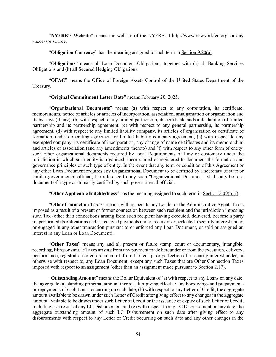 54 “NYFRB’s Website” means the website of the NYFRB at http://www.newyorkfed.org, or any successor source. “Obligation Currency” has the meaning assigned to such term in Section 9.20(a). “Obligations” means all Loan Document Obligations, together with (a) all Banking Services Obligations and (b) all Secured Hedging Obligations. “OFAC” means the Office of Foreign Assets Control of the United States Department of the Treasury. “Original Commitment Letter Date” means February 20, 2025. “Organizational Documents” means (a) with respect to any corporation, its certificate, memorandum, notice of articles or articles of incorporation, association, amalgamation or organization and its by-laws (if any), (b) with respect to any limited partnership, its certificate and/or declaration of limited partnership and its partnership agreement, (c) with respect to any general partnership, its partnership agreement, (d) with respect to any limited liability company, its articles of organization or certificate of formation, and its operating agreement or limited liability company agreement, (e) with respect to any exempted company, its certificate of incorporation, any change of name certificates and its memorandum and articles of association (and any amendments thereto) and (f) with respect to any other form of entity, such other organizational documents required by local Requirements of Law or customary under the jurisdiction in which such entity is organized, incorporated or registered to document the formation and governance principles of such type of entity. In the event that any term or condition of this Agreement or any other Loan Document requires any Organizational Document to be certified by a secretary of state or similar governmental official, the reference to any such “Organizational Document” shall only be to a document of a type customarily certified by such governmental official. “Other Applicable Indebtedness” has the meaning assigned to such term in Section 2.09(b)(i). “Other Connection Taxes” means, with respect to any Lender or the Administrative Agent, Taxes imposed as a result of a present or former connection between such recipient and the jurisdiction imposing such Tax (other than connections arising from such recipient having executed, delivered, become a party to, performed its obligations under, received payments under, received or perfected a security interest under, or engaged in any other transaction pursuant to or enforced any Loan Document, or sold or assigned an interest in any Loan or Loan Document). “Other Taxes” means any and all present or future stamp, court or documentary, intangible, recording, filing or similar Taxes arising from any payment made hereunder or from the execution, delivery, performance, registration or enforcement of, from the receipt or perfection of a security interest under, or otherwise with respect to, any Loan Document, except any such Taxes that are Other Connection Taxes imposed with respect to an assignment (other than an assignment made pursuant to Section 2.17). “Outstanding Amount” means the Dollar Equivalent of (a) with respect to any Loans on any date, the aggregate outstanding principal amount thereof after giving effect to any borrowings and prepayments or repayments of such Loans occurring on such date, (b) with respect to any Letter of Credit, the aggregate amount available to be drawn under such Letter of Credit after giving effect to any changes in the aggregate amount available to be drawn under such Letter of Credit or the issuance or expiry of such Letter of Credit, including as a result of any LC Disbursement and (c) with respect to any LC Disbursement on any date, the aggregate outstanding amount of such LC Disbursement on such date after giving effect to any disbursements with respect to any Letter of Credit occurring on such date and any other changes in the