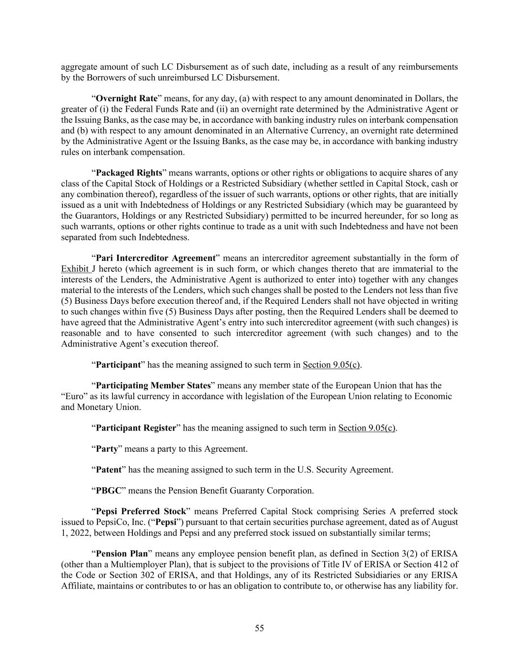 55 aggregate amount of such LC Disbursement as of such date, including as a result of any reimbursements by the Borrowers of such unreimbursed LC Disbursement. “Overnight Rate” means, for any day, (a) with respect to any amount denominated in Dollars, the greater of (i) the Federal Funds Rate and (ii) an overnight rate determined by the Administrative Agent or the Issuing Banks, as the case may be, in accordance with banking industry rules on interbank compensation and (b) with respect to any amount denominated in an Alternative Currency, an overnight rate determined by the Administrative Agent or the Issuing Banks, as the case may be, in accordance with banking industry rules on interbank compensation. “Packaged Rights” means warrants, options or other rights or obligations to acquire shares of any class of the Capital Stock of Holdings or a Restricted Subsidiary (whether settled in Capital Stock, cash or any combination thereof), regardless of the issuer of such warrants, options or other rights, that are initially issued as a unit with Indebtedness of Holdings or any Restricted Subsidiary (which may be guaranteed by the Guarantors, Holdings or any Restricted Subsidiary) permitted to be incurred hereunder, for so long as such warrants, options or other rights continue to trade as a unit with such Indebtedness and have not been separated from such Indebtedness. “Pari Intercreditor Agreement” means an intercreditor agreement substantially in the form of Exhibit J hereto (which agreement is in such form, or which changes thereto that are immaterial to the interests of the Lenders, the Administrative Agent is authorized to enter into) together with any changes material to the interests of the Lenders, which such changes shall be posted to the Lenders not less than five (5) Business Days before execution thereof and, if the Required Lenders shall not have objected in writing to such changes within five (5) Business Days after posting, then the Required Lenders shall be deemed to have agreed that the Administrative Agent’s entry into such intercreditor agreement (with such changes) is reasonable and to have consented to such intercreditor agreement (with such changes) and to the Administrative Agent’s execution thereof. “Participant” has the meaning assigned to such term in Section 9.05(c). “Participating Member States” means any member state of the European Union that has the “Euro” as its lawful currency in accordance with legislation of the European Union relating to Economic and Monetary Union. “Participant Register” has the meaning assigned to such term in Section 9.05(c). “Party” means a party to this Agreement. “Patent” has the meaning assigned to such term in the U.S. Security Agreement. “PBGC” means the Pension Benefit Guaranty Corporation. “Pepsi Preferred Stock” means Preferred Capital Stock comprising Series A preferred stock issued to PepsiCo, Inc. (“Pepsi”) pursuant to that certain securities purchase agreement, dated as of August 1, 2022, between Holdings and Pepsi and any preferred stock issued on substantially similar terms; “Pension Plan” means any employee pension benefit plan, as defined in Section 3(2) of ERISA (other than a Multiemployer Plan), that is subject to the provisions of Title IV of ERISA or Section 412 of the Code or Section 302 of ERISA, and that Holdings, any of its Restricted Subsidiaries or any ERISA Affiliate, maintains or contributes to or has an obligation to contribute to, or otherwise has any liability for.