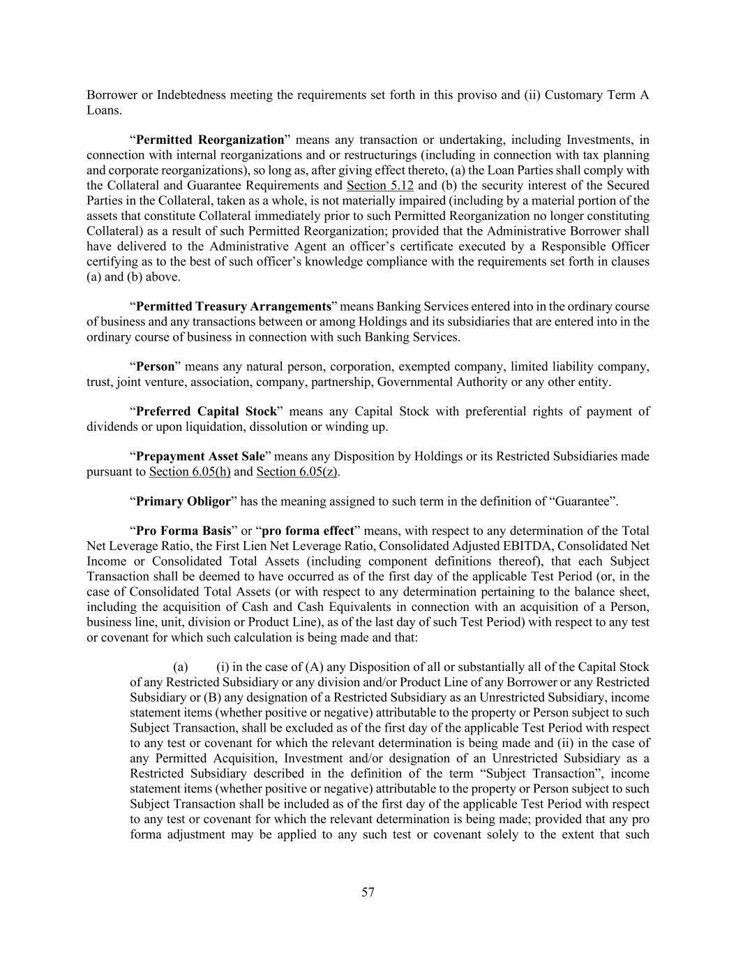 57 Borrower or Indebtedness meeting the requirements set forth in this proviso and (ii) Customary Term A Loans. “Permitted Reorganization” means any transaction or undertaking, including Investments, in connection with internal reorganizations and or restructurings (including in connection with tax planning and corporate reorganizations), so long as, after giving effect thereto, (a) the Loan Parties shall comply with the Collateral and Guarantee Requirements and Section 5.12 and (b) the security interest of the Secured Parties in the Collateral, taken as a whole, is not materially impaired (including by a material portion of the assets that constitute Collateral immediately prior to such Permitted Reorganization no longer constituting Collateral) as a result of such Permitted Reorganization; provided that the Administrative Borrower shall have delivered to the Administrative Agent an officer’s certificate executed by a Responsible Officer certifying as to the best of such officer’s knowledge compliance with the requirements set forth in clauses (a) and (b) above. “Permitted Treasury Arrangements” means Banking Services entered into in the ordinary course of business and any transactions between or among Holdings and its subsidiaries that are entered into in the ordinary course of business in connection with such Banking Services. “Person” means any natural person, corporation, exempted company, limited liability company, trust, joint venture, association, company, partnership, Governmental Authority or any other entity. “Preferred Capital Stock” means any Capital Stock with preferential rights of payment of dividends or upon liquidation, dissolution or winding up. “Prepayment Asset Sale” means any Disposition by Holdings or its Restricted Subsidiaries made pursuant to Section 6.05(h) and Section 6.05(z). “Primary Obligor” has the meaning assigned to such term in the definition of “Guarantee”. “Pro Forma Basis” or “pro forma effect” means, with respect to any determination of the Total Net Leverage Ratio, the First Lien Net Leverage Ratio, Consolidated Adjusted EBITDA, Consolidated Net Income or Consolidated Total Assets (including component definitions thereof), that each Subject Transaction shall be deemed to have occurred as of the first day of the applicable Test Period (or, in the case of Consolidated Total Assets (or with respect to any determination pertaining to the balance sheet, including the acquisition of Cash and Cash Equivalents in connection with an acquisition of a Person, business line, unit, division or Product Line), as of the last day of such Test Period) with respect to any test or covenant for which such calculation is being made and that: (a) (i) in the case of (A) any Disposition of all or substantially all of the Capital Stock of any Restricted Subsidiary or any division and/or Product Line of any Borrower or any Restricted Subsidiary or (B) any designation of a Restricted Subsidiary as an Unrestricted Subsidiary, income statement items (whether positive or negative) attributable to the property or Person subject to such Subject Transaction, shall be excluded as of the first day of the applicable Test Period with respect to any test or covenant for which the relevant determination is being made and (ii) in the case of any Permitted Acquisition, Investment and/or designation of an Unrestricted Subsidiary as a Restricted Subsidiary described in the definition of the term “Subject Transaction”, income statement items (whether positive or negative) attributable to the property or Person subject to such Subject Transaction shall be included as of the first day of the applicable Test Period with respect to any test or covenant for which the relevant determination is being made; provided that any pro forma adjustment may be applied to any such test or covenant solely to the extent that such