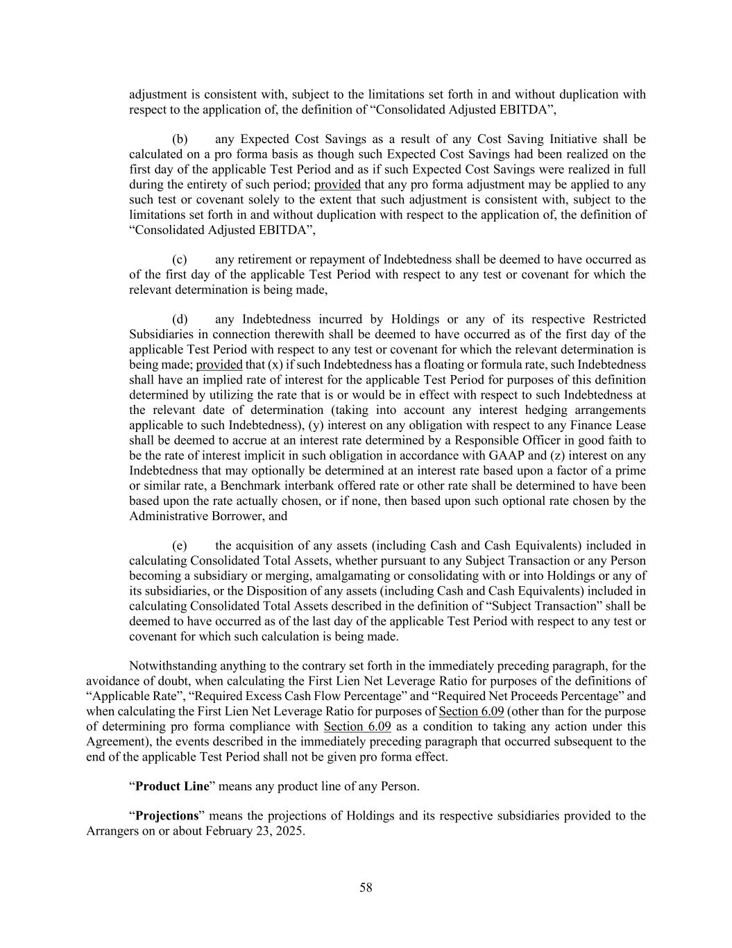 58 adjustment is consistent with, subject to the limitations set forth in and without duplication with respect to the application of, the definition of “Consolidated Adjusted EBITDA”, (b) any Expected Cost Savings as a result of any Cost Saving Initiative shall be calculated on a pro forma basis as though such Expected Cost Savings had been realized on the first day of the applicable Test Period and as if such Expected Cost Savings were realized in full during the entirety of such period; provided that any pro forma adjustment may be applied to any such test or covenant solely to the extent that such adjustment is consistent with, subject to the limitations set forth in and without duplication with respect to the application of, the definition of “Consolidated Adjusted EBITDA”, (c) any retirement or repayment of Indebtedness shall be deemed to have occurred as of the first day of the applicable Test Period with respect to any test or covenant for which the relevant determination is being made, (d) any Indebtedness incurred by Holdings or any of its respective Restricted Subsidiaries in connection therewith shall be deemed to have occurred as of the first day of the applicable Test Period with respect to any test or covenant for which the relevant determination is being made; provided that (x) if such Indebtedness has a floating or formula rate, such Indebtedness shall have an implied rate of interest for the applicable Test Period for purposes of this definition determined by utilizing the rate that is or would be in effect with respect to such Indebtedness at the relevant date of determination (taking into account any interest hedging arrangements applicable to such Indebtedness), (y) interest on any obligation with respect to any Finance Lease shall be deemed to accrue at an interest rate determined by a Responsible Officer in good faith to be the rate of interest implicit in such obligation in accordance with GAAP and (z) interest on any Indebtedness that may optionally be determined at an interest rate based upon a factor of a prime or similar rate, a Benchmark interbank offered rate or other rate shall be determined to have been based upon the rate actually chosen, or if none, then based upon such optional rate chosen by the Administrative Borrower, and (e) the acquisition of any assets (including Cash and Cash Equivalents) included in calculating Consolidated Total Assets, whether pursuant to any Subject Transaction or any Person becoming a subsidiary or merging, amalgamating or consolidating with or into Holdings or any of its subsidiaries, or the Disposition of any assets (including Cash and Cash Equivalents) included in calculating Consolidated Total Assets described in the definition of “Subject Transaction” shall be deemed to have occurred as of the last day of the applicable Test Period with respect to any test or covenant for which such calculation is being made. Notwithstanding anything to the contrary set forth in the immediately preceding paragraph, for the avoidance of doubt, when calculating the First Lien Net Leverage Ratio for purposes of the definitions of “Applicable Rate”, “Required Excess Cash Flow Percentage” and “Required Net Proceeds Percentage” and when calculating the First Lien Net Leverage Ratio for purposes of Section 6.09 (other than for the purpose of determining pro forma compliance with Section 6.09 as a condition to taking any action under this Agreement), the events described in the immediately preceding paragraph that occurred subsequent to the end of the applicable Test Period shall not be given pro forma effect. “Product Line” means any product line of any Person. “Projections” means the projections of Holdings and its respective subsidiaries provided to the Arrangers on or about February 23, 2025.