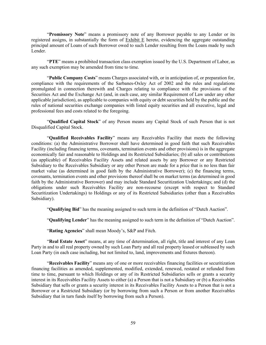 59 “Promissory Note” means a promissory note of any Borrower payable to any Lender or its registered assigns, in substantially the form of Exhibit E hereto, evidencing the aggregate outstanding principal amount of Loans of such Borrower owed to such Lender resulting from the Loans made by such Lender. “PTE” means a prohibited transaction class exemption issued by the U.S. Department of Labor, as any such exemption may be amended from time to time. “Public Company Costs” means Charges associated with, or in anticipation of, or preparation for, compliance with the requirements of the Sarbanes-Oxley Act of 2002 and the rules and regulations promulgated in connection therewith and Charges relating to compliance with the provisions of the Securities Act and the Exchange Act (and, in each case, any similar Requirement of Law under any other applicable jurisdiction), as applicable to companies with equity or debt securities held by the public and the rules of national securities exchange companies with listed equity securities and all executive, legal and professional fees and costs related to the foregoing. “Qualified Capital Stock” of any Person means any Capital Stock of such Person that is not Disqualified Capital Stock. “Qualified Receivables Facility” means any Receivables Facility that meets the following conditions: (a) the Administrative Borrower shall have determined in good faith that such Receivables Facility (including financing terms, covenants, termination events and other provisions) is in the aggregate economically fair and reasonable to Holdings and its Restricted Subsidiaries; (b) all sales or contributions (as applicable) of Receivables Facility Assets and related assets by any Borrower or any Restricted Subsidiary to the Receivables Subsidiary or any other Person are made for a price that is no less than fair market value (as determined in good faith by the Administrative Borrower); (c) the financing terms, covenants, termination events and other provisions thereof shall be on market terms (as determined in good faith by the Administrative Borrower) and may include Standard Securitization Undertakings; and (d) the obligations under such Receivables Facility are non-recourse (except with respect to Standard Securitization Undertakings) to Holdings or any of its Restricted Subsidiaries (other than a Receivables Subsidiary). “Qualifying Bid” has the meaning assigned to such term in the definition of “Dutch Auction”. “Qualifying Lender” has the meaning assigned to such term in the definition of “Dutch Auction”. “Rating Agencies” shall mean Moody’s, S&P and Fitch. “Real Estate Asset” means, at any time of determination, all right, title and interest of any Loan Party in and to all real property owned by such Loan Party and all real property leased or subleased by such Loan Party (in each case including, but not limited to, land, improvements and fixtures thereon). “Receivables Facility” means any of one or more receivables financing facilities or securitization financing facilities as amended, supplemented, modified, extended, renewed, restated or refunded from time to time, pursuant to which Holdings or any of its Restricted Subsidiaries sells or grants a security interest in its Receivables Facility Assets to either (a) a Person that is not a Subsidiary or (b) a Receivables Subsidiary that sells or grants a security interest in its Receivables Facility Assets to a Person that is not a Borrower or a Restricted Subsidiary (or by borrowing from such a Person or from another Receivables Subsidiary that in turn funds itself by borrowing from such a Person).