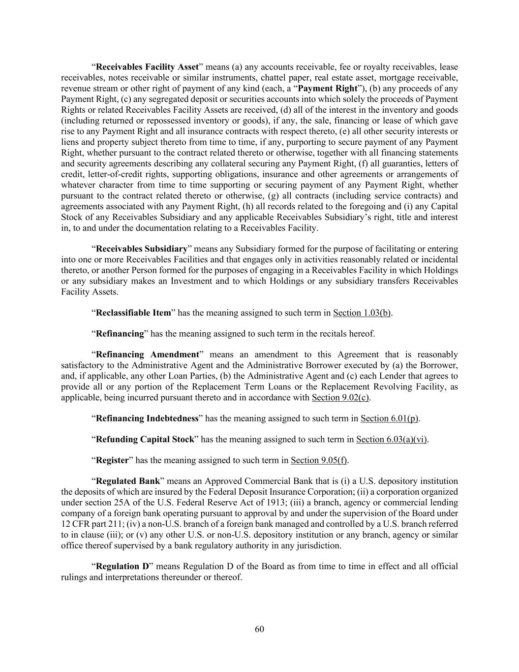60 “Receivables Facility Asset” means (a) any accounts receivable, fee or royalty receivables, lease receivables, notes receivable or similar instruments, chattel paper, real estate asset, mortgage receivable, revenue stream or other right of payment of any kind (each, a “Payment Right”), (b) any proceeds of any Payment Right, (c) any segregated deposit or securities accounts into which solely the proceeds of Payment Rights or related Receivables Facility Assets are received, (d) all of the interest in the inventory and goods (including returned or repossessed inventory or goods), if any, the sale, financing or lease of which gave rise to any Payment Right and all insurance contracts with respect thereto, (e) all other security interests or liens and property subject thereto from time to time, if any, purporting to secure payment of any Payment Right, whether pursuant to the contract related thereto or otherwise, together with all financing statements and security agreements describing any collateral securing any Payment Right, (f) all guaranties, letters of credit, letter-of-credit rights, supporting obligations, insurance and other agreements or arrangements of whatever character from time to time supporting or securing payment of any Payment Right, whether pursuant to the contract related thereto or otherwise, (g) all contracts (including service contracts) and agreements associated with any Payment Right, (h) all records related to the foregoing and (i) any Capital Stock of any Receivables Subsidiary and any applicable Receivables Subsidiary’s right, title and interest in, to and under the documentation relating to a Receivables Facility. “Receivables Subsidiary” means any Subsidiary formed for the purpose of facilitating or entering into one or more Receivables Facilities and that engages only in activities reasonably related or incidental thereto, or another Person formed for the purposes of engaging in a Receivables Facility in which Holdings or any subsidiary makes an Investment and to which Holdings or any subsidiary transfers Receivables Facility Assets. “Reclassifiable Item” has the meaning assigned to such term in Section 1.03(b). “Refinancing” has the meaning assigned to such term in the recitals hereof. “Refinancing Amendment” means an amendment to this Agreement that is reasonably satisfactory to the Administrative Agent and the Administrative Borrower executed by (a) the Borrower, and, if applicable, any other Loan Parties, (b) the Administrative Agent and (c) each Lender that agrees to provide all or any portion of the Replacement Term Loans or the Replacement Revolving Facility, as applicable, being incurred pursuant thereto and in accordance with Section 9.02(c). “Refinancing Indebtedness” has the meaning assigned to such term in Section 6.01(p). “Refunding Capital Stock” has the meaning assigned to such term in Section 6.03(a)(vi). “Register” has the meaning assigned to such term in Section 9.05(f). “Regulated Bank” means an Approved Commercial Bank that is (i) a U.S. depository institution the deposits of which are insured by the Federal Deposit Insurance Corporation; (ii) a corporation organized under section 25A of the U.S. Federal Reserve Act of 1913; (iii) a branch, agency or commercial lending company of a foreign bank operating pursuant to approval by and under the supervision of the Board under 12 CFR part 211; (iv) a non-U.S. branch of a foreign bank managed and controlled by a U.S. branch referred to in clause (iii); or (v) any other U.S. or non-U.S. depository institution or any branch, agency or similar office thereof supervised by a bank regulatory authority in any jurisdiction. “Regulation D” means Regulation D of the Board as from time to time in effect and all official rulings and interpretations thereunder or thereof.