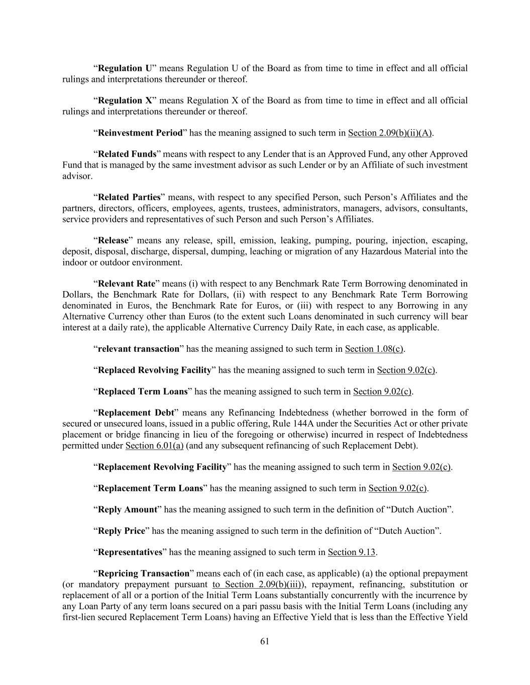 61 “Regulation U” means Regulation U of the Board as from time to time in effect and all official rulings and interpretations thereunder or thereof. “Regulation X” means Regulation X of the Board as from time to time in effect and all official rulings and interpretations thereunder or thereof. “Reinvestment Period” has the meaning assigned to such term in Section 2.09(b)(ii)(A). “Related Funds” means with respect to any Lender that is an Approved Fund, any other Approved Fund that is managed by the same investment advisor as such Lender or by an Affiliate of such investment advisor. “Related Parties” means, with respect to any specified Person, such Person’s Affiliates and the partners, directors, officers, employees, agents, trustees, administrators, managers, advisors, consultants, service providers and representatives of such Person and such Person’s Affiliates. “Release” means any release, spill, emission, leaking, pumping, pouring, injection, escaping, deposit, disposal, discharge, dispersal, dumping, leaching or migration of any Hazardous Material into the indoor or outdoor environment. “Relevant Rate” means (i) with respect to any Benchmark Rate Term Borrowing denominated in Dollars, the Benchmark Rate for Dollars, (ii) with respect to any Benchmark Rate Term Borrowing denominated in Euros, the Benchmark Rate for Euros, or (iii) with respect to any Borrowing in any Alternative Currency other than Euros (to the extent such Loans denominated in such currency will bear interest at a daily rate), the applicable Alternative Currency Daily Rate, in each case, as applicable. “relevant transaction” has the meaning assigned to such term in Section 1.08(c). “Replaced Revolving Facility” has the meaning assigned to such term in Section 9.02(c). “Replaced Term Loans” has the meaning assigned to such term in Section 9.02(c). “Replacement Debt” means any Refinancing Indebtedness (whether borrowed in the form of secured or unsecured loans, issued in a public offering, Rule 144A under the Securities Act or other private placement or bridge financing in lieu of the foregoing or otherwise) incurred in respect of Indebtedness permitted under Section 6.01(a) (and any subsequent refinancing of such Replacement Debt). “Replacement Revolving Facility” has the meaning assigned to such term in Section 9.02(c). “Replacement Term Loans” has the meaning assigned to such term in Section 9.02(c). “Reply Amount” has the meaning assigned to such term in the definition of “Dutch Auction”. “Reply Price” has the meaning assigned to such term in the definition of “Dutch Auction”. “Representatives” has the meaning assigned to such term in Section 9.13. “Repricing Transaction” means each of (in each case, as applicable) (a) the optional prepayment (or mandatory prepayment pursuant to Section 2.09(b)(iii)), repayment, refinancing, substitution or replacement of all or a portion of the Initial Term Loans substantially concurrently with the incurrence by any Loan Party of any term loans secured on a pari passu basis with the Initial Term Loans (including any first-lien secured Replacement Term Loans) having an Effective Yield that is less than the Effective Yield