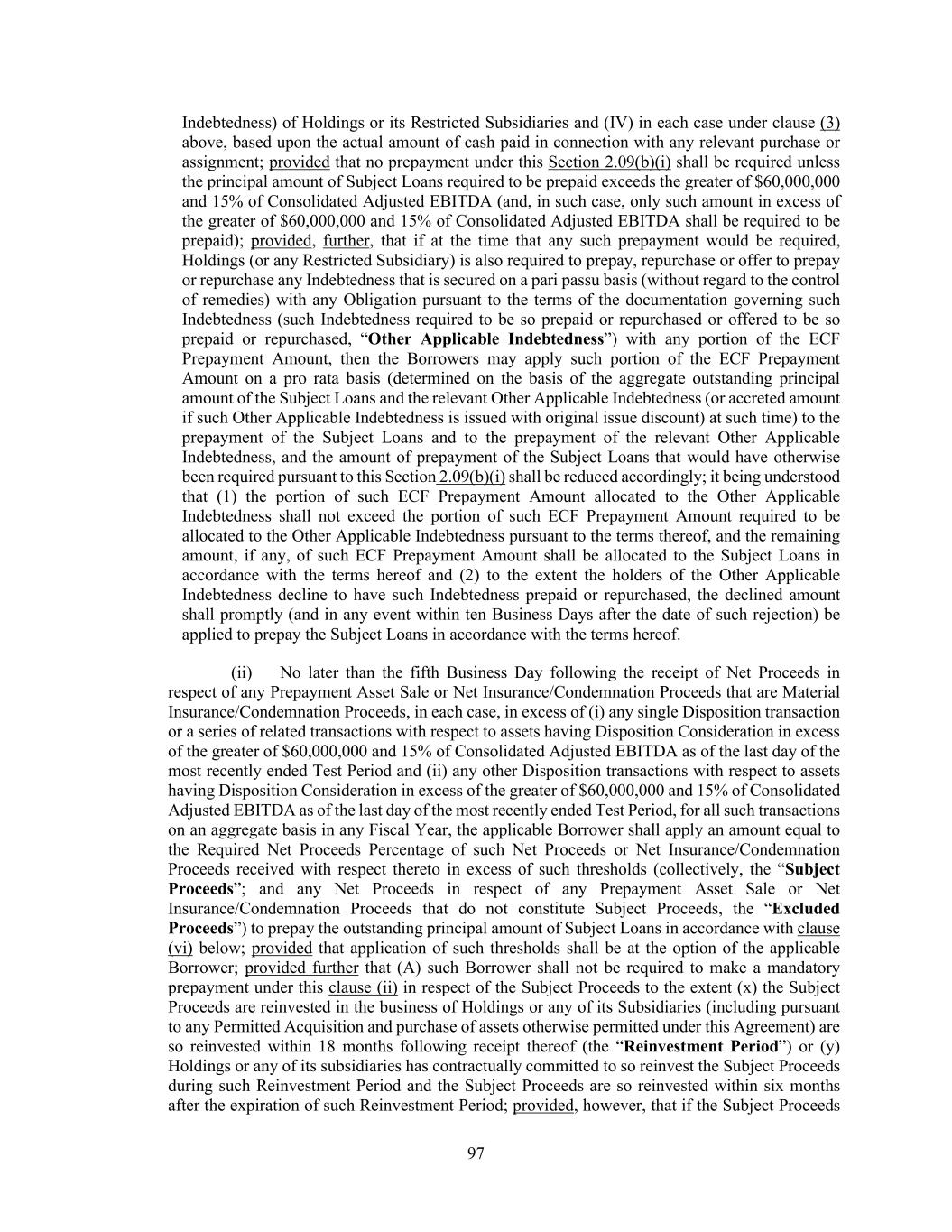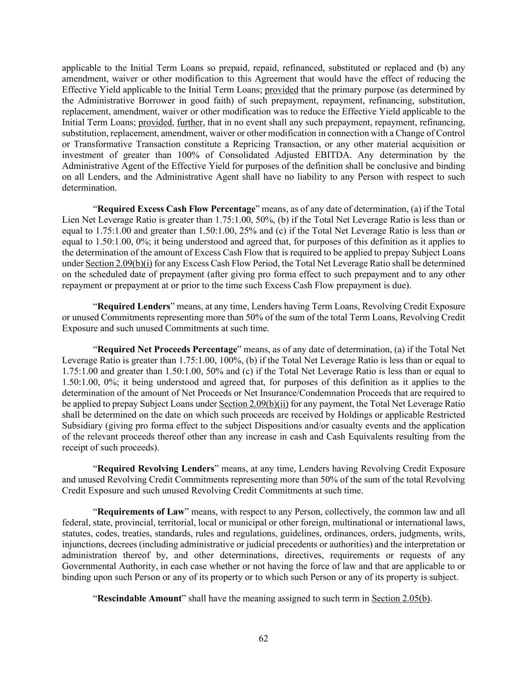 62 applicable to the Initial Term Loans so prepaid, repaid, refinanced, substituted or replaced and (b) any amendment, waiver or other modification to this Agreement that would have the effect of reducing the Effective Yield applicable to the Initial Term Loans; provided that the primary purpose (as determined by the Administrative Borrower in good faith) of such prepayment, repayment, refinancing, substitution, replacement, amendment, waiver or other modification was to reduce the Effective Yield applicable to the Initial Term Loans; provided, further, that in no event shall any such prepayment, repayment, refinancing, substitution, replacement, amendment, waiver or other modification in connection with a Change of Control or Transformative Transaction constitute a Repricing Transaction, or any other material acquisition or investment of greater than 100% of Consolidated Adjusted EBITDA. Any determination by the Administrative Agent of the Effective Yield for purposes of the definition shall be conclusive and binding on all Lenders, and the Administrative Agent shall have no liability to any Person with respect to such determination. “Required Excess Cash Flow Percentage” means, as of any date of determination, (a) if the Total Lien Net Leverage Ratio is greater than 1.75:1.00, 50%, (b) if the Total Net Leverage Ratio is less than or equal to 1.75:1.00 and greater than 1.50:1.00, 25% and (c) if the Total Net Leverage Ratio is less than or equal to 1.50:1.00, 0%; it being understood and agreed that, for purposes of this definition as it applies to the determination of the amount of Excess Cash Flow that is required to be applied to prepay Subject Loans under Section 2.09(b)(i) for any Excess Cash Flow Period, the Total Net Leverage Ratio shall be determined on the scheduled date of prepayment (after giving pro forma effect to such prepayment and to any other repayment or prepayment at or prior to the time such Excess Cash Flow prepayment is due). “Required Lenders” means, at any time, Lenders having Term Loans, Revolving Credit Exposure or unused Commitments representing more than 50% of the sum of the total Term Loans, Revolving Credit Exposure and such unused Commitments at such time. “Required Net Proceeds Percentage” means, as of any date of determination, (a) if the Total Net Leverage Ratio is greater than 1.75:1.00, 100%, (b) if the Total Net Leverage Ratio is less than or equal to 1.75:1.00 and greater than 1.50:1.00, 50% and (c) if the Total Net Leverage Ratio is less than or equal to 1.50:1.00, 0%; it being understood and agreed that, for purposes of this definition as it applies to the determination of the amount of Net Proceeds or Net Insurance/Condemnation Proceeds that are required to be applied to prepay Subject Loans under Section 2.09(b)(ii) for any payment, the Total Net Leverage Ratio shall be determined on the date on which such proceeds are received by Holdings or applicable Restricted Subsidiary (giving pro forma effect to the subject Dispositions and/or casualty events and the application of the relevant proceeds thereof other than any increase in cash and Cash Equivalents resulting from the receipt of such proceeds). “Required Revolving Lenders” means, at any time, Lenders having Revolving Credit Exposure and unused Revolving Credit Commitments representing more than 50% of the sum of the total Revolving Credit Exposure and such unused Revolving Credit Commitments at such time. “Requirements of Law” means, with respect to any Person, collectively, the common law and all federal, state, provincial, territorial, local or municipal or other foreign, multinational or international laws, statutes, codes, treaties, standards, rules and regulations, guidelines, ordinances, orders, judgments, writs, injunctions, decrees (including administrative or judicial precedents or authorities) and the interpretation or administration thereof by, and other determinations, directives, requirements or requests of any Governmental Authority, in each case whether or not having the force of law and that are applicable to or binding upon such Person or any of its property or to which such Person or any of its property is subject. “Rescindable Amount” shall have the meaning assigned to such term in Section 2.05(b).