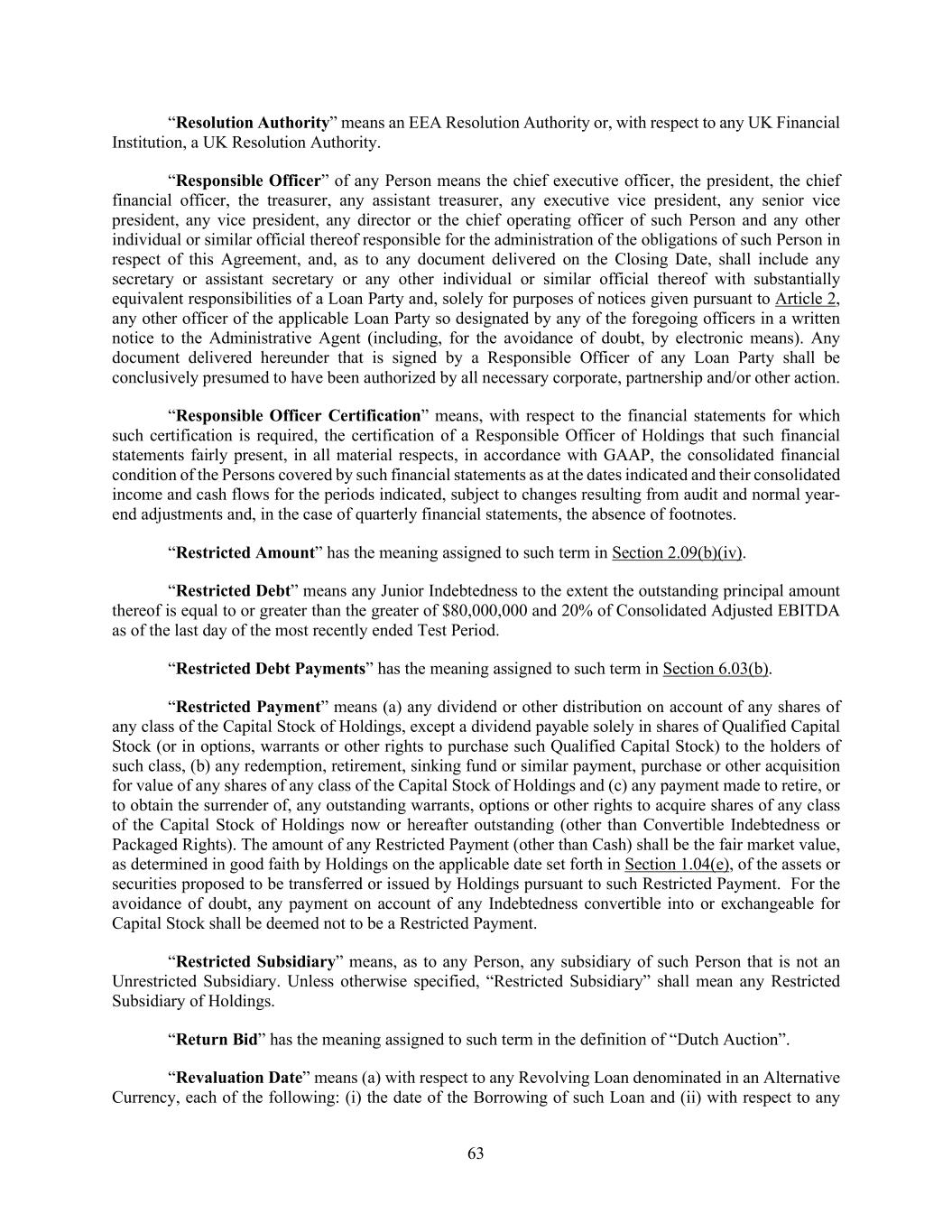 63 “Resolution Authority” means an EEA Resolution Authority or, with respect to any UK Financial Institution, a UK Resolution Authority. “Responsible Officer” of any Person means the chief executive officer, the president, the chief financial officer, the treasurer, any assistant treasurer, any executive vice president, any senior vice president, any vice president, any director or the chief operating officer of such Person and any other individual or similar official thereof responsible for the administration of the obligations of such Person in respect of this Agreement, and, as to any document delivered on the Closing Date, shall include any secretary or assistant secretary or any other individual or similar official thereof with substantially equivalent responsibilities of a Loan Party and, solely for purposes of notices given pursuant to Article 2, any other officer of the applicable Loan Party so designated by any of the foregoing officers in a written notice to the Administrative Agent (including, for the avoidance of doubt, by electronic means). Any document delivered hereunder that is signed by a Responsible Officer of any Loan Party shall be conclusively presumed to have been authorized by all necessary corporate, partnership and/or other action. “Responsible Officer Certification” means, with respect to the financial statements for which such certification is required, the certification of a Responsible Officer of Holdings that such financial statements fairly present, in all material respects, in accordance with GAAP, the consolidated financial condition of the Persons covered by such financial statements as at the dates indicated and their consolidated income and cash flows for the periods indicated, subject to changes resulting from audit and normal year- end adjustments and, in the case of quarterly financial statements, the absence of footnotes. “Restricted Amount” has the meaning assigned to such term in Section 2.09(b)(iv). “Restricted Debt” means any Junior Indebtedness to the extent the outstanding principal amount thereof is equal to or greater than the greater of $80,000,000 and 20% of Consolidated Adjusted EBITDA as of the last day of the most recently ended Test Period. “Restricted Debt Payments” has the meaning assigned to such term in Section 6.03(b). “Restricted Payment” means (a) any dividend or other distribution on account of any shares of any class of the Capital Stock of Holdings, except a dividend payable solely in shares of Qualified Capital Stock (or in options, warrants or other rights to purchase such Qualified Capital Stock) to the holders of such class, (b) any redemption, retirement, sinking fund or similar payment, purchase or other acquisition for value of any shares of any class of the Capital Stock of Holdings and (c) any payment made to retire, or to obtain the surrender of, any outstanding warrants, options or other rights to acquire shares of any class of the Capital Stock of Holdings now or hereafter outstanding (other than Convertible Indebtedness or Packaged Rights). The amount of any Restricted Payment (other than Cash) shall be the fair market value, as determined in good faith by Holdings on the applicable date set forth in Section 1.04(e), of the assets or securities proposed to be transferred or issued by Holdings pursuant to such Restricted Payment. For the avoidance of doubt, any payment on account of any Indebtedness convertible into or exchangeable for Capital Stock shall be deemed not to be a Restricted Payment. “Restricted Subsidiary” means, as to any Person, any subsidiary of such Person that is not an Unrestricted Subsidiary. Unless otherwise specified, “Restricted Subsidiary” shall mean any Restricted Subsidiary of Holdings. “Return Bid” has the meaning assigned to such term in the definition of “Dutch Auction”. “Revaluation Date” means (a) with respect to any Revolving Loan denominated in an Alternative Currency, each of the following: (i) the date of the Borrowing of such Loan and (ii) with respect to any