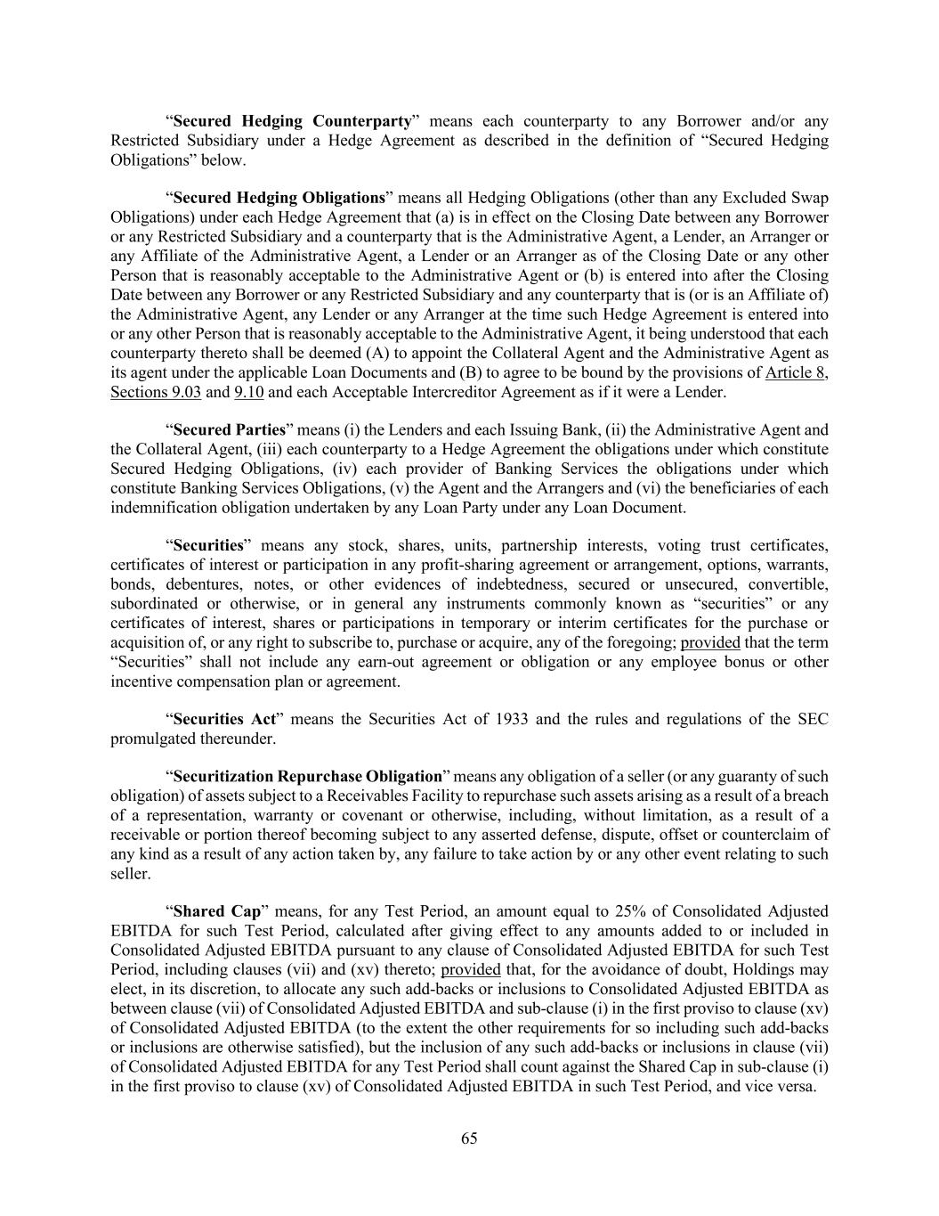 65 “Secured Hedging Counterparty” means each counterparty to any Borrower and/or any Restricted Subsidiary under a Hedge Agreement as described in the definition of “Secured Hedging Obligations” below. “Secured Hedging Obligations” means all Hedging Obligations (other than any Excluded Swap Obligations) under each Hedge Agreement that (a) is in effect on the Closing Date between any Borrower or any Restricted Subsidiary and a counterparty that is the Administrative Agent, a Lender, an Arranger or any Affiliate of the Administrative Agent, a Lender or an Arranger as of the Closing Date or any other Person that is reasonably acceptable to the Administrative Agent or (b) is entered into after the Closing Date between any Borrower or any Restricted Subsidiary and any counterparty that is (or is an Affiliate of) the Administrative Agent, any Lender or any Arranger at the time such Hedge Agreement is entered into or any other Person that is reasonably acceptable to the Administrative Agent, it being understood that each counterparty thereto shall be deemed (A) to appoint the Collateral Agent and the Administrative Agent as its agent under the applicable Loan Documents and (B) to agree to be bound by the provisions of Article 8, Sections 9.03 and 9.10 and each Acceptable Intercreditor Agreement as if it were a Lender. “Secured Parties” means (i) the Lenders and each Issuing Bank, (ii) the Administrative Agent and the Collateral Agent, (iii) each counterparty to a Hedge Agreement the obligations under which constitute Secured Hedging Obligations, (iv) each provider of Banking Services the obligations under which constitute Banking Services Obligations, (v) the Agent and the Arrangers and (vi) the beneficiaries of each indemnification obligation undertaken by any Loan Party under any Loan Document. “Securities” means any stock, shares, units, partnership interests, voting trust certificates, certificates of interest or participation in any profit-sharing agreement or arrangement, options, warrants, bonds, debentures, notes, or other evidences of indebtedness, secured or unsecured, convertible, subordinated or otherwise, or in general any instruments commonly known as “securities” or any certificates of interest, shares or participations in temporary or interim certificates for the purchase or acquisition of, or any right to subscribe to, purchase or acquire, any of the foregoing; provided that the term “Securities” shall not include any earn-out agreement or obligation or any employee bonus or other incentive compensation plan or agreement. “Securities Act” means the Securities Act of 1933 and the rules and regulations of the SEC promulgated thereunder. “Securitization Repurchase Obligation” means any obligation of a seller (or any guaranty of such obligation) of assets subject to a Receivables Facility to repurchase such assets arising as a result of a breach of a representation, warranty or covenant or otherwise, including, without limitation, as a result of a receivable or portion thereof becoming subject to any asserted defense, dispute, offset or counterclaim of any kind as a result of any action taken by, any failure to take action by or any other event relating to such seller. “Shared Cap” means, for any Test Period, an amount equal to 25% of Consolidated Adjusted EBITDA for such Test Period, calculated after giving effect to any amounts added to or included in Consolidated Adjusted EBITDA pursuant to any clause of Consolidated Adjusted EBITDA for such Test Period, including clauses (vii) and (xv) thereto; provided that, for the avoidance of doubt, Holdings may elect, in its discretion, to allocate any such add-backs or inclusions to Consolidated Adjusted EBITDA as between clause (vii) of Consolidated Adjusted EBITDA and sub-clause (i) in the first proviso to clause (xv) of Consolidated Adjusted EBITDA (to the extent the other requirements for so including such add-backs or inclusions are otherwise satisfied), but the inclusion of any such add-backs or inclusions in clause (vii) of Consolidated Adjusted EBITDA for any Test Period shall count against the Shared Cap in sub-clause (i) in the first proviso to clause (xv) of Consolidated Adjusted EBITDA in such Test Period, and vice versa.
