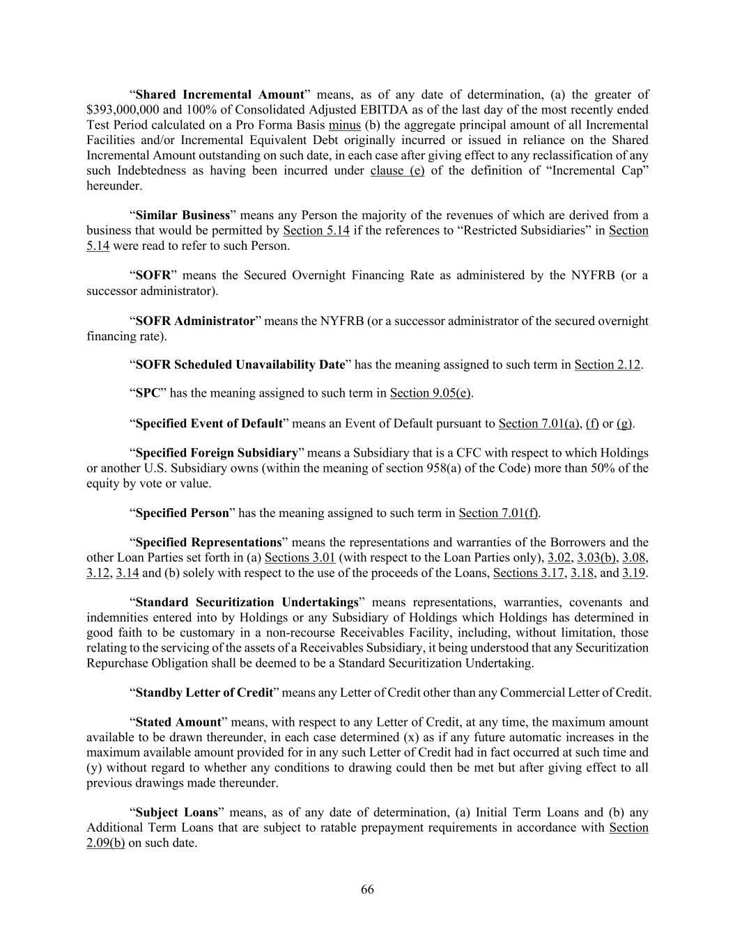 66 “Shared Incremental Amount” means, as of any date of determination, (a) the greater of $393,000,000 and 100% of Consolidated Adjusted EBITDA as of the last day of the most recently ended Test Period calculated on a Pro Forma Basis minus (b) the aggregate principal amount of all Incremental Facilities and/or Incremental Equivalent Debt originally incurred or issued in reliance on the Shared Incremental Amount outstanding on such date, in each case after giving effect to any reclassification of any such Indebtedness as having been incurred under clause (e) of the definition of “Incremental Cap” hereunder. “Similar Business” means any Person the majority of the revenues of which are derived from a business that would be permitted by Section 5.14 if the references to “Restricted Subsidiaries” in Section 5.14 were read to refer to such Person. “SOFR” means the Secured Overnight Financing Rate as administered by the NYFRB (or a successor administrator). “SOFR Administrator” means the NYFRB (or a successor administrator of the secured overnight financing rate). “SOFR Scheduled Unavailability Date” has the meaning assigned to such term in Section 2.12. “SPC” has the meaning assigned to such term in Section 9.05(e). “Specified Event of Default” means an Event of Default pursuant to Section 7.01(a), (f) or (g). “Specified Foreign Subsidiary” means a Subsidiary that is a CFC with respect to which Holdings or another U.S. Subsidiary owns (within the meaning of section 958(a) of the Code) more than 50% of the equity by vote or value. “Specified Person” has the meaning assigned to such term in Section 7.01(f). “Specified Representations” means the representations and warranties of the Borrowers and the other Loan Parties set forth in (a) Sections 3.01 (with respect to the Loan Parties only), 3.02, 3.03(b), 3.08, 3.12, 3.14 and (b) solely with respect to the use of the proceeds of the Loans, Sections 3.17, 3.18, and 3.19. “Standard Securitization Undertakings” means representations, warranties, covenants and indemnities entered into by Holdings or any Subsidiary of Holdings which Holdings has determined in good faith to be customary in a non-recourse Receivables Facility, including, without limitation, those relating to the servicing of the assets of a Receivables Subsidiary, it being understood that any Securitization Repurchase Obligation shall be deemed to be a Standard Securitization Undertaking. “Standby Letter of Credit” means any Letter of Credit other than any Commercial Letter of Credit. “Stated Amount” means, with respect to any Letter of Credit, at any time, the maximum amount available to be drawn thereunder, in each case determined (x) as if any future automatic increases in the maximum available amount provided for in any such Letter of Credit had in fact occurred at such time and (y) without regard to whether any conditions to drawing could then be met but after giving effect to all previous drawings made thereunder. “Subject Loans” means, as of any date of determination, (a) Initial Term Loans and (b) any Additional Term Loans that are subject to ratable prepayment requirements in accordance with Section 2.09(b) on such date.