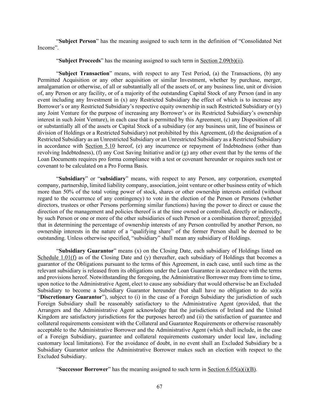67 “Subject Person” has the meaning assigned to such term in the definition of “Consolidated Net Income”. “Subject Proceeds” has the meaning assigned to such term in Section 2.09(b)(ii). “Subject Transaction” means, with respect to any Test Period, (a) the Transactions, (b) any Permitted Acquisition or any other acquisition or similar Investment, whether by purchase, merger, amalgamation or otherwise, of all or substantially all of the assets of, or any business line, unit or division of, any Person or any facility, or of a majority of the outstanding Capital Stock of any Person (and in any event including any Investment in (x) any Restricted Subsidiary the effect of which is to increase any Borrower’s or any Restricted Subsidiary’s respective equity ownership in such Restricted Subsidiary or (y) any Joint Venture for the purpose of increasing any Borrower’s or its Restricted Subsidiary’s ownership interest in such Joint Venture), in each case that is permitted by this Agreement, (c) any Disposition of all or substantially all of the assets or Capital Stock of a subsidiary (or any business unit, line of business or division of Holdings or a Restricted Subsidiary) not prohibited by this Agreement, (d) the designation of a Restricted Subsidiary as an Unrestricted Subsidiary or an Unrestricted Subsidiary as a Restricted Subsidiary in accordance with Section 5.10 hereof, (e) any incurrence or repayment of Indebtedness (other than revolving Indebtedness), (f) any Cost Saving Initiative and/or (g) any other event that by the terms of the Loan Documents requires pro forma compliance with a test or covenant hereunder or requires such test or covenant to be calculated on a Pro Forma Basis. “Subsidiary” or “subsidiary” means, with respect to any Person, any corporation, exempted company, partnership, limited liability company, association, joint venture or other business entity of which more than 50% of the total voting power of stock, shares or other ownership interests entitled (without regard to the occurrence of any contingency) to vote in the election of the Person or Persons (whether directors, trustees or other Persons performing similar functions) having the power to direct or cause the direction of the management and policies thereof is at the time owned or controlled, directly or indirectly, by such Person or one or more of the other subsidiaries of such Person or a combination thereof; provided that in determining the percentage of ownership interests of any Person controlled by another Person, no ownership interests in the nature of a “qualifying share” of the former Person shall be deemed to be outstanding. Unless otherwise specified, “subsidiary” shall mean any subsidiary of Holdings. “Subsidiary Guarantor” means (x) on the Closing Date, each subsidiary of Holdings listed on Schedule 1.01(f) as of the Closing Date and (y) thereafter, each subsidiary of Holdings that becomes a guarantor of the Obligations pursuant to the terms of this Agreement, in each case, until such time as the relevant subsidiary is released from its obligations under the Loan Guarantee in accordance with the terms and provisions hereof. Notwithstanding the foregoing, the Administrative Borrower may from time to time, upon notice to the Administrative Agent, elect to cause any subsidiary that would otherwise be an Excluded Subsidiary to become a Subsidiary Guarantor hereunder (but shall have no obligation to do so)(a “Discretionary Guarantor”), subject to (i) in the case of a Foreign Subsidiary the jurisdiction of such Foreign Subsidiary shall be reasonably satisfactory to the Administrative Agent (provided, that the Arrangers and the Administrative Agent acknowledge that the jurisdictions of Ireland and the United Kingdom are satisfactory jurisdictions for the purposes hereof) and (ii) the satisfaction of guarantee and collateral requirements consistent with the Collateral and Guarantee Requirements or otherwise reasonably acceptable to the Administrative Borrower and the Administrative Agent (which shall include, in the case of a Foreign Subsidiary, guarantee and collateral requirements customary under local law, including customary local limitations). For the avoidance of doubt, in no event shall an Excluded Subsidiary be a Subsidiary Guarantor unless the Administrative Borrower makes such an election with respect to the Excluded Subsidiary. “Successor Borrower” has the meaning assigned to such term in Section 6.05(a)(i)(B).