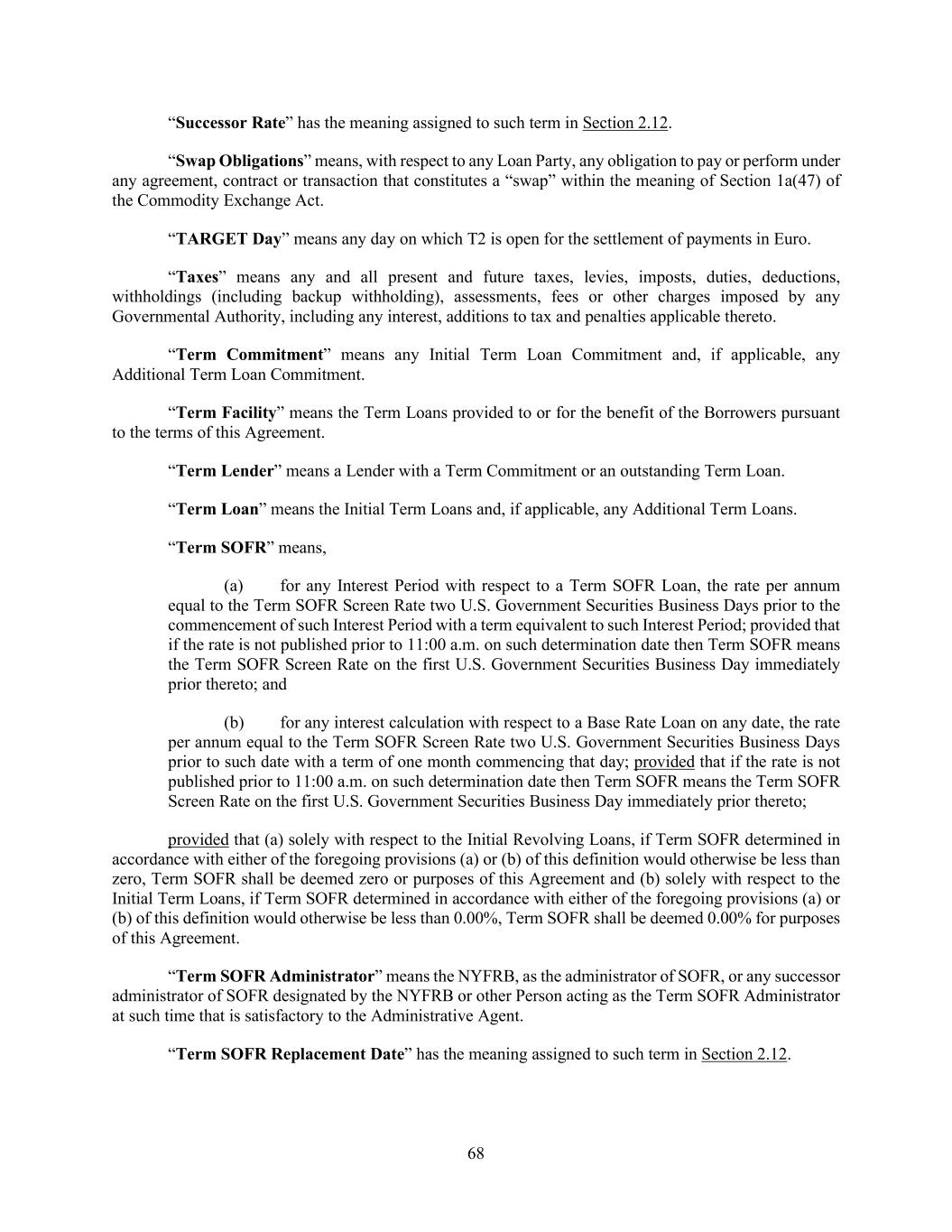 68 “Successor Rate” has the meaning assigned to such term in Section 2.12. “Swap Obligations” means, with respect to any Loan Party, any obligation to pay or perform under any agreement, contract or transaction that constitutes a “swap” within the meaning of Section 1a(47) of the Commodity Exchange Act. “TARGET Day” means any day on which T2 is open for the settlement of payments in Euro. “Taxes” means any and all present and future taxes, levies, imposts, duties, deductions, withholdings (including backup withholding), assessments, fees or other charges imposed by any Governmental Authority, including any interest, additions to tax and penalties applicable thereto. “Term Commitment” means any Initial Term Loan Commitment and, if applicable, any Additional Term Loan Commitment. “Term Facility” means the Term Loans provided to or for the benefit of the Borrowers pursuant to the terms of this Agreement. “Term Lender” means a Lender with a Term Commitment or an outstanding Term Loan. “Term Loan” means the Initial Term Loans and, if applicable, any Additional Term Loans. “Term SOFR” means, (a) for any Interest Period with respect to a Term SOFR Loan, the rate per annum equal to the Term SOFR Screen Rate two U.S. Government Securities Business Days prior to the commencement of such Interest Period with a term equivalent to such Interest Period; provided that if the rate is not published prior to 11:00 a.m. on such determination date then Term SOFR means the Term SOFR Screen Rate on the first U.S. Government Securities Business Day immediately prior thereto; and (b) for any interest calculation with respect to a Base Rate Loan on any date, the rate per annum equal to the Term SOFR Screen Rate two U.S. Government Securities Business Days prior to such date with a term of one month commencing that day; provided that if the rate is not published prior to 11:00 a.m. on such determination date then Term SOFR means the Term SOFR Screen Rate on the first U.S. Government Securities Business Day immediately prior thereto; provided that (a) solely with respect to the Initial Revolving Loans, if Term SOFR determined in accordance with either of the foregoing provisions (a) or (b) of this definition would otherwise be less than zero, Term SOFR shall be deemed zero or purposes of this Agreement and (b) solely with respect to the Initial Term Loans, if Term SOFR determined in accordance with either of the foregoing provisions (a) or (b) of this definition would otherwise be less than 0.00%, Term SOFR shall be deemed 0.00% for purposes of this Agreement. “Term SOFR Administrator” means the NYFRB, as the administrator of SOFR, or any successor administrator of SOFR designated by the NYFRB or other Person acting as the Term SOFR Administrator at such time that is satisfactory to the Administrative Agent. “Term SOFR Replacement Date” has the meaning assigned to such term in Section 2.12.