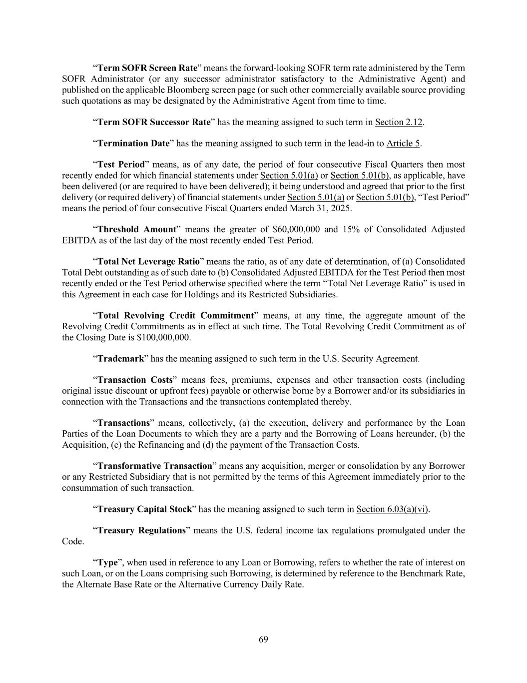 69 “Term SOFR Screen Rate” means the forward-looking SOFR term rate administered by the Term SOFR Administrator (or any successor administrator satisfactory to the Administrative Agent) and published on the applicable Bloomberg screen page (or such other commercially available source providing such quotations as may be designated by the Administrative Agent from time to time. “Term SOFR Successor Rate” has the meaning assigned to such term in Section 2.12. “Termination Date” has the meaning assigned to such term in the lead-in to Article 5. “Test Period” means, as of any date, the period of four consecutive Fiscal Quarters then most recently ended for which financial statements under Section 5.01(a) or Section 5.01(b), as applicable, have been delivered (or are required to have been delivered); it being understood and agreed that prior to the first delivery (or required delivery) of financial statements under Section 5.01(a) or Section 5.01(b), “Test Period” means the period of four consecutive Fiscal Quarters ended March 31, 2025. “Threshold Amount” means the greater of $60,000,000 and 15% of Consolidated Adjusted EBITDA as of the last day of the most recently ended Test Period. “Total Net Leverage Ratio” means the ratio, as of any date of determination, of (a) Consolidated Total Debt outstanding as of such date to (b) Consolidated Adjusted EBITDA for the Test Period then most recently ended or the Test Period otherwise specified where the term “Total Net Leverage Ratio” is used in this Agreement in each case for Holdings and its Restricted Subsidiaries. “Total Revolving Credit Commitment” means, at any time, the aggregate amount of the Revolving Credit Commitments as in effect at such time. The Total Revolving Credit Commitment as of the Closing Date is $100,000,000. “Trademark” has the meaning assigned to such term in the U.S. Security Agreement. “Transaction Costs” means fees, premiums, expenses and other transaction costs (including original issue discount or upfront fees) payable or otherwise borne by a Borrower and/or its subsidiaries in connection with the Transactions and the transactions contemplated thereby. “Transactions” means, collectively, (a) the execution, delivery and performance by the Loan Parties of the Loan Documents to which they are a party and the Borrowing of Loans hereunder, (b) the Acquisition, (c) the Refinancing and (d) the payment of the Transaction Costs. “Transformative Transaction” means any acquisition, merger or consolidation by any Borrower or any Restricted Subsidiary that is not permitted by the terms of this Agreement immediately prior to the consummation of such transaction. “Treasury Capital Stock” has the meaning assigned to such term in Section 6.03(a)(vi). “Treasury Regulations” means the U.S. federal income tax regulations promulgated under the Code. “Type”, when used in reference to any Loan or Borrowing, refers to whether the rate of interest on such Loan, or on the Loans comprising such Borrowing, is determined by reference to the Benchmark Rate, the Alternate Base Rate or the Alternative Currency Daily Rate.