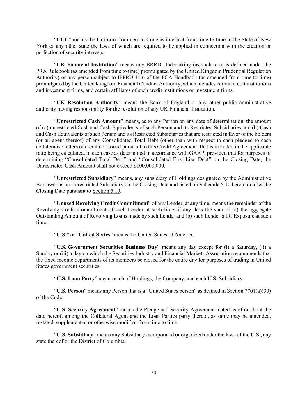 70 “UCC” means the Uniform Commercial Code as in effect from time to time in the State of New York or any other state the laws of which are required to be applied in connection with the creation or perfection of security interests. “UK Financial Institution” means any BRRD Undertaking (as such term is defined under the PRA Rulebook (as amended from time to time) promulgated by the United Kingdom Prudential Regulation Authority) or any person subject to IFPRU 11.6 of the FCA Handbook (as amended from time to time) promulgated by the United Kingdom Financial Conduct Authority, which includes certain credit institutions and investment firms, and certain affiliates of such credit institutions or investment firms. “UK Resolution Authority” means the Bank of England or any other public administrative authority having responsibility for the resolution of any UK Financial Institution. “Unrestricted Cash Amount” means, as to any Person on any date of determination, the amount of (a) unrestricted Cash and Cash Equivalents of such Person and its Restricted Subsidiaries and (b) Cash and Cash Equivalents of such Person and its Restricted Subsidiaries that are restricted in favor of the holders (or an agent thereof) of any Consolidated Total Debt (other than with respect to cash pledged to cash collateralize letters of credit not issued pursuant to this Credit Agreement) that is included in the applicable ratio being calculated, in each case as determined in accordance with GAAP; provided that for purposes of determining “Consolidated Total Debt” and “Consolidated First Lien Debt” on the Closing Date, the Unrestricted Cash Amount shall not exceed $100,000,000. “Unrestricted Subsidiary” means, any subsidiary of Holdings designated by the Administrative Borrower as an Unrestricted Subsidiary on the Closing Date and listed on Schedule 5.10 hereto or after the Closing Date pursuant to Section 5.10. “Unused Revolving Credit Commitment” of any Lender, at any time, means the remainder of the Revolving Credit Commitment of such Lender at such time, if any, less the sum of (a) the aggregate Outstanding Amount of Revolving Loans made by such Lender and (b) such Lender’s LC Exposure at such time. “U.S.” or “United States” means the United States of America. “U.S. Government Securities Business Day” means any day except for (i) a Saturday, (ii) a Sunday or (iii) a day on which the Securities Industry and Financial Markets Association recommends that the fixed income departments of its members be closed for the entire day for purposes of trading in United States government securities. “U.S. Loan Party” means each of Holdings, the Company, and each U.S. Subsidiary. “U.S. Person” means any Person that is a “United States person” as defined in Section 7701(a)(30) of the Code. “U.S. Security Agreement” means the Pledge and Security Agreement, dated as of or about the date hereof, among the Collateral Agent and the Loan Parties party thereto, as same may be amended, restated, supplemented or otherwise modified from time to time. “U.S. Subsidiary” means any Subsidiary incorporated or organized under the laws of the U.S., any state thereof or the District of Columbia.