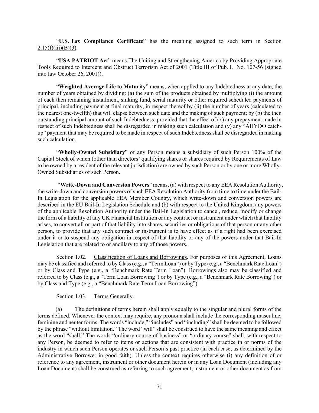 71 “U.S. Tax Compliance Certificate” has the meaning assigned to such term in Section 2.15(f)(iii)(B)(3). “USA PATRIOT Act” means The Uniting and Strengthening America by Providing Appropriate Tools Required to Intercept and Obstruct Terrorism Act of 2001 (Title III of Pub. L. No. 107-56 (signed into law October 26, 2001)). “Weighted Average Life to Maturity” means, when applied to any Indebtedness at any date, the number of years obtained by dividing: (a) the sum of the products obtained by multiplying (i) the amount of each then remaining installment, sinking fund, serial maturity or other required scheduled payments of principal, including payment at final maturity, in respect thereof by (ii) the number of years (calculated to the nearest one-twelfth) that will elapse between such date and the making of such payment; by (b) the then outstanding principal amount of such Indebtedness; provided that the effect of (x) any prepayment made in respect of such Indebtedness shall be disregarded in making such calculation and (y) any “AHYDO catch- up” payment that may be required to be made in respect of such Indebtedness shall be disregarded in making such calculation. “Wholly-Owned Subsidiary” of any Person means a subsidiary of such Person 100% of the Capital Stock of which (other than directors’ qualifying shares or shares required by Requirements of Law to be owned by a resident of the relevant jurisdiction) are owned by such Person or by one or more Wholly- Owned Subsidiaries of such Person. “Write-Down and Conversion Powers” means, (a) with respect to any EEA Resolution Authority, the write-down and conversion powers of such EEA Resolution Authority from time to time under the Bail- In Legislation for the applicable EEA Member Country, which write-down and conversion powers are described in the EU Bail-In Legislation Schedule and (b) with respect to the United Kingdom, any powers of the applicable Resolution Authority under the Bail-In Legislation to cancel, reduce, modify or change the form of a liability of any UK Financial Institution or any contract or instrument under which that liability arises, to convert all or part of that liability into shares, securities or obligations of that person or any other person, to provide that any such contract or instrument is to have effect as if a right had been exercised under it or to suspend any obligation in respect of that liability or any of the powers under that Bail-In Legislation that are related to or ancillary to any of those powers. Section 1.02. Classification of Loans and Borrowings. For purposes of this Agreement, Loans may be classified and referred to by Class (e.g., a “Term Loan”) or by Type (e.g., a “Benchmark Rate Loan”) or by Class and Type (e.g., a “Benchmark Rate Term Loan”). Borrowings also may be classified and referred to by Class (e.g., a “Term Loan Borrowing”) or by Type (e.g., a “Benchmark Rate Borrowing”) or by Class and Type (e.g., a “Benchmark Rate Term Loan Borrowing”). Section 1.03. Terms Generally. (a) The definitions of terms herein shall apply equally to the singular and plural forms of the terms defined. Whenever the context may require, any pronoun shall include the corresponding masculine, feminine and neuter forms. The words “include,” “includes” and “including” shall be deemed to be followed by the phrase “without limitation.” The word “will” shall be construed to have the same meaning and effect as the word “shall.” The words “ordinary course of business” or “ordinary course” shall, with respect to any Person, be deemed to refer to items or actions that are consistent with practice in or norms of the industry in which such Person operates or such Person’s past practice (in each case, as determined by the Administrative Borrower in good faith). Unless the context requires otherwise (i) any definition of or reference to any agreement, instrument or other document herein or in any Loan Document (including any Loan Document) shall be construed as referring to such agreement, instrument or other document as from