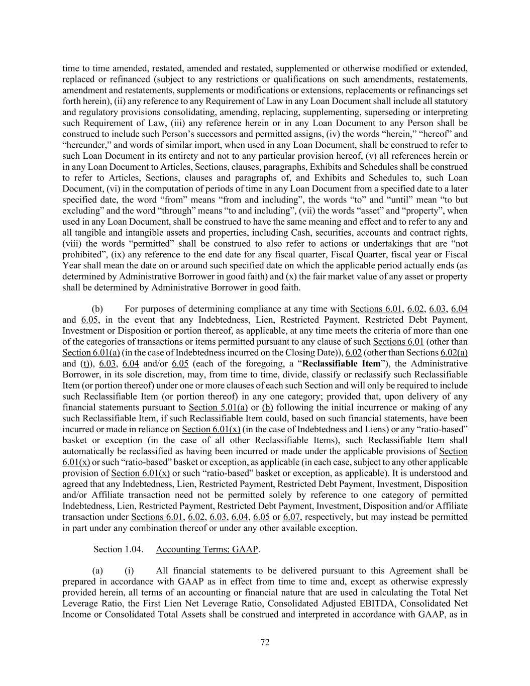 72 time to time amended, restated, amended and restated, supplemented or otherwise modified or extended, replaced or refinanced (subject to any restrictions or qualifications on such amendments, restatements, amendment and restatements, supplements or modifications or extensions, replacements or refinancings set forth herein), (ii) any reference to any Requirement of Law in any Loan Document shall include all statutory and regulatory provisions consolidating, amending, replacing, supplementing, superseding or interpreting such Requirement of Law, (iii) any reference herein or in any Loan Document to any Person shall be construed to include such Person’s successors and permitted assigns, (iv) the words “herein,” “hereof” and “hereunder,” and words of similar import, when used in any Loan Document, shall be construed to refer to such Loan Document in its entirety and not to any particular provision hereof, (v) all references herein or in any Loan Document to Articles, Sections, clauses, paragraphs, Exhibits and Schedules shall be construed to refer to Articles, Sections, clauses and paragraphs of, and Exhibits and Schedules to, such Loan Document, (vi) in the computation of periods of time in any Loan Document from a specified date to a later specified date, the word “from” means “from and including”, the words “to” and “until” mean “to but excluding” and the word “through” means “to and including”, (vii) the words “asset” and “property”, when used in any Loan Document, shall be construed to have the same meaning and effect and to refer to any and all tangible and intangible assets and properties, including Cash, securities, accounts and contract rights, (viii) the words “permitted” shall be construed to also refer to actions or undertakings that are “not prohibited”, (ix) any reference to the end date for any fiscal quarter, Fiscal Quarter, fiscal year or Fiscal Year shall mean the date on or around such specified date on which the applicable period actually ends (as determined by Administrative Borrower in good faith) and (x) the fair market value of any asset or property shall be determined by Administrative Borrower in good faith. (b) For purposes of determining compliance at any time with Sections 6.01, 6.02, 6.03, 6.04 and 6.05, in the event that any Indebtedness, Lien, Restricted Payment, Restricted Debt Payment, Investment or Disposition or portion thereof, as applicable, at any time meets the criteria of more than one of the categories of transactions or items permitted pursuant to any clause of such Sections 6.01 (other than Section 6.01(a) (in the case of Indebtedness incurred on the Closing Date)), 6.02 (other than Sections 6.02(a) and (t)), 6.03, 6.04 and/or 6.05 (each of the foregoing, a “Reclassifiable Item”), the Administrative Borrower, in its sole discretion, may, from time to time, divide, classify or reclassify such Reclassifiable Item (or portion thereof) under one or more clauses of each such Section and will only be required to include such Reclassifiable Item (or portion thereof) in any one category; provided that, upon delivery of any financial statements pursuant to Section 5.01(a) or (b) following the initial incurrence or making of any such Reclassifiable Item, if such Reclassifiable Item could, based on such financial statements, have been incurred or made in reliance on Section 6.01(x) (in the case of Indebtedness and Liens) or any “ratio-based” basket or exception (in the case of all other Reclassifiable Items), such Reclassifiable Item shall automatically be reclassified as having been incurred or made under the applicable provisions of Section 6.01(x) or such “ratio-based” basket or exception, as applicable (in each case, subject to any other applicable provision of Section 6.01(x) or such “ratio-based” basket or exception, as applicable). It is understood and agreed that any Indebtedness, Lien, Restricted Payment, Restricted Debt Payment, Investment, Disposition and/or Affiliate transaction need not be permitted solely by reference to one category of permitted Indebtedness, Lien, Restricted Payment, Restricted Debt Payment, Investment, Disposition and/or Affiliate transaction under Sections 6.01, 6.02, 6.03, 6.04, 6.05 or 6.07, respectively, but may instead be permitted in part under any combination thereof or under any other available exception. Section 1.04. Accounting Terms; GAAP. (a) (i) All financial statements to be delivered pursuant to this Agreement shall be prepared in accordance with GAAP as in effect from time to time and, except as otherwise expressly provided herein, all terms of an accounting or financial nature that are used in calculating the Total Net Leverage Ratio, the First Lien Net Leverage Ratio, Consolidated Adjusted EBITDA, Consolidated Net Income or Consolidated Total Assets shall be construed and interpreted in accordance with GAAP, as in