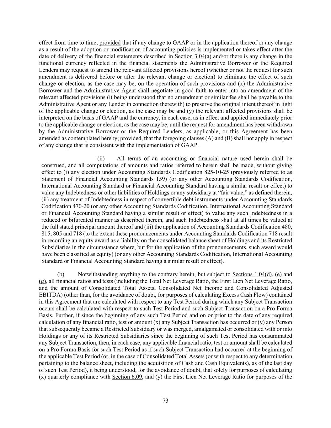 73 effect from time to time; provided that if any change to GAAP or in the application thereof or any change as a result of the adoption or modification of accounting policies is implemented or takes effect after the date of delivery of the financial statements described in Section 3.04(a) and/or there is any change in the functional currency reflected in the financial statements the Administrative Borrower or the Required Lenders may request to amend the relevant affected provisions hereof (whether or not the request for such amendment is delivered before or after the relevant change or election) to eliminate the effect of such change or election, as the case may be, on the operation of such provisions and (x) the Administrative Borrower and the Administrative Agent shall negotiate in good faith to enter into an amendment of the relevant affected provisions (it being understood that no amendment or similar fee shall be payable to the Administrative Agent or any Lender in connection therewith) to preserve the original intent thereof in light of the applicable change or election, as the case may be and (y) the relevant affected provisions shall be interpreted on the basis of GAAP and the currency, in each case, as in effect and applied immediately prior to the applicable change or election, as the case may be, until the request for amendment has been withdrawn by the Administrative Borrower or the Required Lenders, as applicable, or this Agreement has been amended as contemplated hereby; provided, that the foregoing clauses (A) and (B) shall not apply in respect of any change that is consistent with the implementation of GAAP. (ii) All terms of an accounting or financial nature used herein shall be construed, and all computations of amounts and ratios referred to herein shall be made, without giving effect to (i) any election under Accounting Standards Codification 825-10-25 (previously referred to as Statement of Financial Accounting Standards 159) (or any other Accounting Standards Codification, International Accounting Standard or Financial Accounting Standard having a similar result or effect) to value any Indebtedness or other liabilities of Holdings or any subsidiary at “fair value,” as defined therein, (ii) any treatment of Indebtedness in respect of convertible debt instruments under Accounting Standards Codification 470-20 (or any other Accounting Standards Codification, International Accounting Standard or Financial Accounting Standard having a similar result or effect) to value any such Indebtedness in a reduced or bifurcated manner as described therein, and such Indebtedness shall at all times be valued at the full stated principal amount thereof and (iii) the application of Accounting Standards Codification 480, 815, 805 and 718 (to the extent these pronouncements under Accounting Standards Codification 718 result in recording an equity award as a liability on the consolidated balance sheet of Holdings and its Restricted Subsidiaries in the circumstance where, but for the application of the pronouncements, such award would have been classified as equity) (or any other Accounting Standards Codification, International Accounting Standard or Financial Accounting Standard having a similar result or effect). (b) Notwithstanding anything to the contrary herein, but subject to Sections 1.04(d), (e) and (g), all financial ratios and tests (including the Total Net Leverage Ratio, the First Lien Net Leverage Ratio, and the amount of Consolidated Total Assets, Consolidated Net Income and Consolidated Adjusted EBITDA) (other than, for the avoidance of doubt, for purposes of calculating Excess Cash Flow) contained in this Agreement that are calculated with respect to any Test Period during which any Subject Transaction occurs shall be calculated with respect to such Test Period and such Subject Transaction on a Pro Forma Basis. Further, if since the beginning of any such Test Period and on or prior to the date of any required calculation of any financial ratio, test or amount (x) any Subject Transaction has occurred or (y) any Person that subsequently became a Restricted Subsidiary or was merged, amalgamated or consolidated with or into Holdings or any of its Restricted Subsidiaries since the beginning of such Test Period has consummated any Subject Transaction, then, in each case, any applicable financial ratio, test or amount shall be calculated on a Pro Forma Basis for such Test Period as if such Subject Transaction had occurred at the beginning of the applicable Test Period (or, in the case of Consolidated Total Assets (or with respect to any determination pertaining to the balance sheet, including the acquisition of Cash and Cash Equivalents), as of the last day of such Test Period), it being understood, for the avoidance of doubt, that solely for purposes of calculating (x) quarterly compliance with Section 6.09, and (y) the First Lien Net Leverage Ratio for purposes of the