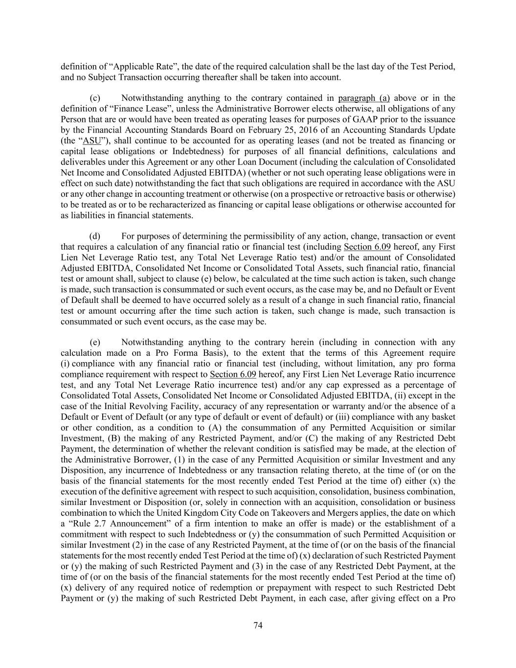 74 definition of “Applicable Rate”, the date of the required calculation shall be the last day of the Test Period, and no Subject Transaction occurring thereafter shall be taken into account. (c) Notwithstanding anything to the contrary contained in paragraph (a) above or in the definition of “Finance Lease”, unless the Administrative Borrower elects otherwise, all obligations of any Person that are or would have been treated as operating leases for purposes of GAAP prior to the issuance by the Financial Accounting Standards Board on February 25, 2016 of an Accounting Standards Update (the “ASU”), shall continue to be accounted for as operating leases (and not be treated as financing or capital lease obligations or Indebtedness) for purposes of all financial definitions, calculations and deliverables under this Agreement or any other Loan Document (including the calculation of Consolidated Net Income and Consolidated Adjusted EBITDA) (whether or not such operating lease obligations were in effect on such date) notwithstanding the fact that such obligations are required in accordance with the ASU or any other change in accounting treatment or otherwise (on a prospective or retroactive basis or otherwise) to be treated as or to be recharacterized as financing or capital lease obligations or otherwise accounted for as liabilities in financial statements. (d) For purposes of determining the permissibility of any action, change, transaction or event that requires a calculation of any financial ratio or financial test (including Section 6.09 hereof, any First Lien Net Leverage Ratio test, any Total Net Leverage Ratio test) and/or the amount of Consolidated Adjusted EBITDA, Consolidated Net Income or Consolidated Total Assets, such financial ratio, financial test or amount shall, subject to clause (e) below, be calculated at the time such action is taken, such change is made, such transaction is consummated or such event occurs, as the case may be, and no Default or Event of Default shall be deemed to have occurred solely as a result of a change in such financial ratio, financial test or amount occurring after the time such action is taken, such change is made, such transaction is consummated or such event occurs, as the case may be. (e) Notwithstanding anything to the contrary herein (including in connection with any calculation made on a Pro Forma Basis), to the extent that the terms of this Agreement require (i) compliance with any financial ratio or financial test (including, without limitation, any pro forma compliance requirement with respect to Section 6.09 hereof, any First Lien Net Leverage Ratio incurrence test, and any Total Net Leverage Ratio incurrence test) and/or any cap expressed as a percentage of Consolidated Total Assets, Consolidated Net Income or Consolidated Adjusted EBITDA, (ii) except in the case of the Initial Revolving Facility, accuracy of any representation or warranty and/or the absence of a Default or Event of Default (or any type of default or event of default) or (iii) compliance with any basket or other condition, as a condition to (A) the consummation of any Permitted Acquisition or similar Investment, (B) the making of any Restricted Payment, and/or (C) the making of any Restricted Debt Payment, the determination of whether the relevant condition is satisfied may be made, at the election of the Administrative Borrower, (1) in the case of any Permitted Acquisition or similar Investment and any Disposition, any incurrence of Indebtedness or any transaction relating thereto, at the time of (or on the basis of the financial statements for the most recently ended Test Period at the time of) either (x) the execution of the definitive agreement with respect to such acquisition, consolidation, business combination, similar Investment or Disposition (or, solely in connection with an acquisition, consolidation or business combination to which the United Kingdom City Code on Takeovers and Mergers applies, the date on which a “Rule 2.7 Announcement” of a firm intention to make an offer is made) or the establishment of a commitment with respect to such Indebtedness or (y) the consummation of such Permitted Acquisition or similar Investment (2) in the case of any Restricted Payment, at the time of (or on the basis of the financial statements for the most recently ended Test Period at the time of) (x) declaration of such Restricted Payment or (y) the making of such Restricted Payment and (3) in the case of any Restricted Debt Payment, at the time of (or on the basis of the financial statements for the most recently ended Test Period at the time of) (x) delivery of any required notice of redemption or prepayment with respect to such Restricted Debt Payment or (y) the making of such Restricted Debt Payment, in each case, after giving effect on a Pro