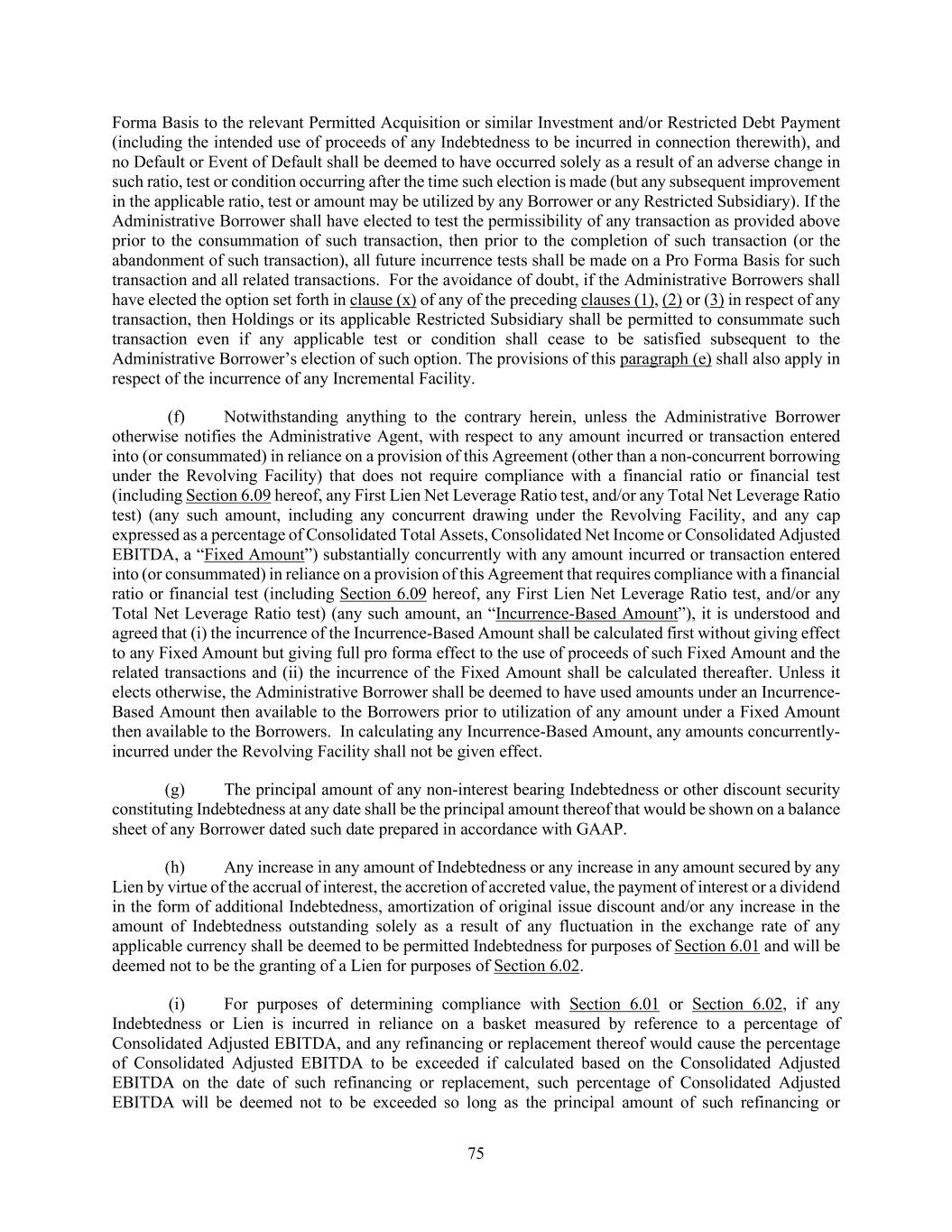 75 Forma Basis to the relevant Permitted Acquisition or similar Investment and/or Restricted Debt Payment (including the intended use of proceeds of any Indebtedness to be incurred in connection therewith), and no Default or Event of Default shall be deemed to have occurred solely as a result of an adverse change in such ratio, test or condition occurring after the time such election is made (but any subsequent improvement in the applicable ratio, test or amount may be utilized by any Borrower or any Restricted Subsidiary). If the Administrative Borrower shall have elected to test the permissibility of any transaction as provided above prior to the consummation of such transaction, then prior to the completion of such transaction (or the abandonment of such transaction), all future incurrence tests shall be made on a Pro Forma Basis for such transaction and all related transactions. For the avoidance of doubt, if the Administrative Borrowers shall have elected the option set forth in clause (x) of any of the preceding clauses (1), (2) or (3) in respect of any transaction, then Holdings or its applicable Restricted Subsidiary shall be permitted to consummate such transaction even if any applicable test or condition shall cease to be satisfied subsequent to the Administrative Borrower’s election of such option. The provisions of this paragraph (e) shall also apply in respect of the incurrence of any Incremental Facility. (f) Notwithstanding anything to the contrary herein, unless the Administrative Borrower otherwise notifies the Administrative Agent, with respect to any amount incurred or transaction entered into (or consummated) in reliance on a provision of this Agreement (other than a non-concurrent borrowing under the Revolving Facility) that does not require compliance with a financial ratio or financial test (including Section 6.09 hereof, any First Lien Net Leverage Ratio test, and/or any Total Net Leverage Ratio test) (any such amount, including any concurrent drawing under the Revolving Facility, and any cap expressed as a percentage of Consolidated Total Assets, Consolidated Net Income or Consolidated Adjusted EBITDA, a “Fixed Amount”) substantially concurrently with any amount incurred or transaction entered into (or consummated) in reliance on a provision of this Agreement that requires compliance with a financial ratio or financial test (including Section 6.09 hereof, any First Lien Net Leverage Ratio test, and/or any Total Net Leverage Ratio test) (any such amount, an “Incurrence-Based Amount”), it is understood and agreed that (i) the incurrence of the Incurrence-Based Amount shall be calculated first without giving effect to any Fixed Amount but giving full pro forma effect to the use of proceeds of such Fixed Amount and the related transactions and (ii) the incurrence of the Fixed Amount shall be calculated thereafter. Unless it elects otherwise, the Administrative Borrower shall be deemed to have used amounts under an Incurrence- Based Amount then available to the Borrowers prior to utilization of any amount under a Fixed Amount then available to the Borrowers. In calculating any Incurrence-Based Amount, any amounts concurrently- incurred under the Revolving Facility shall not be given effect. (g) The principal amount of any non-interest bearing Indebtedness or other discount security constituting Indebtedness at any date shall be the principal amount thereof that would be shown on a balance sheet of any Borrower dated such date prepared in accordance with GAAP. (h) Any increase in any amount of Indebtedness or any increase in any amount secured by any Lien by virtue of the accrual of interest, the accretion of accreted value, the payment of interest or a dividend in the form of additional Indebtedness, amortization of original issue discount and/or any increase in the amount of Indebtedness outstanding solely as a result of any fluctuation in the exchange rate of any applicable currency shall be deemed to be permitted Indebtedness for purposes of Section 6.01 and will be deemed not to be the granting of a Lien for purposes of Section 6.02. (i) For purposes of determining compliance with Section 6.01 or Section 6.02, if any Indebtedness or Lien is incurred in reliance on a basket measured by reference to a percentage of Consolidated Adjusted EBITDA, and any refinancing or replacement thereof would cause the percentage of Consolidated Adjusted EBITDA to be exceeded if calculated based on the Consolidated Adjusted EBITDA on the date of such refinancing or replacement, such percentage of Consolidated Adjusted EBITDA will be deemed not to be exceeded so long as the principal amount of such refinancing or