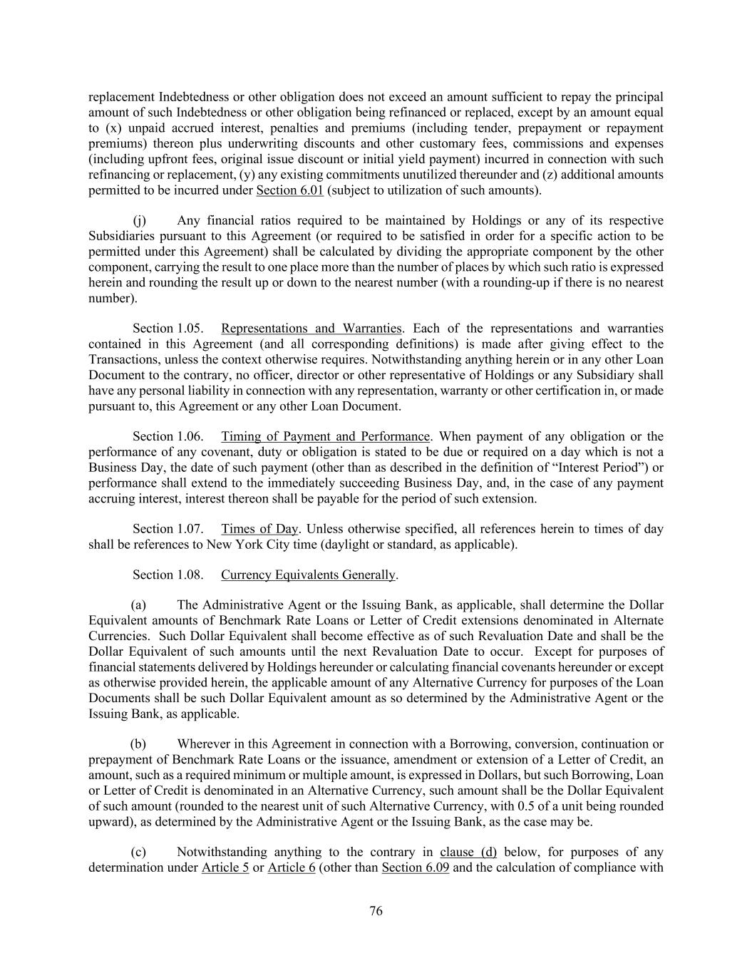 76 replacement Indebtedness or other obligation does not exceed an amount sufficient to repay the principal amount of such Indebtedness or other obligation being refinanced or replaced, except by an amount equal to (x) unpaid accrued interest, penalties and premiums (including tender, prepayment or repayment premiums) thereon plus underwriting discounts and other customary fees, commissions and expenses (including upfront fees, original issue discount or initial yield payment) incurred in connection with such refinancing or replacement, (y) any existing commitments unutilized thereunder and (z) additional amounts permitted to be incurred under Section 6.01 (subject to utilization of such amounts). (j) Any financial ratios required to be maintained by Holdings or any of its respective Subsidiaries pursuant to this Agreement (or required to be satisfied in order for a specific action to be permitted under this Agreement) shall be calculated by dividing the appropriate component by the other component, carrying the result to one place more than the number of places by which such ratio is expressed herein and rounding the result up or down to the nearest number (with a rounding-up if there is no nearest number). Section 1.05. Representations and Warranties. Each of the representations and warranties contained in this Agreement (and all corresponding definitions) is made after giving effect to the Transactions, unless the context otherwise requires. Notwithstanding anything herein or in any other Loan Document to the contrary, no officer, director or other representative of Holdings or any Subsidiary shall have any personal liability in connection with any representation, warranty or other certification in, or made pursuant to, this Agreement or any other Loan Document. Section 1.06. Timing of Payment and Performance. When payment of any obligation or the performance of any covenant, duty or obligation is stated to be due or required on a day which is not a Business Day, the date of such payment (other than as described in the definition of “Interest Period”) or performance shall extend to the immediately succeeding Business Day, and, in the case of any payment accruing interest, interest thereon shall be payable for the period of such extension. Section 1.07. Times of Day. Unless otherwise specified, all references herein to times of day shall be references to New York City time (daylight or standard, as applicable). Section 1.08. Currency Equivalents Generally. (a) The Administrative Agent or the Issuing Bank, as applicable, shall determine the Dollar Equivalent amounts of Benchmark Rate Loans or Letter of Credit extensions denominated in Alternate Currencies. Such Dollar Equivalent shall become effective as of such Revaluation Date and shall be the Dollar Equivalent of such amounts until the next Revaluation Date to occur. Except for purposes of financial statements delivered by Holdings hereunder or calculating financial covenants hereunder or except as otherwise provided herein, the applicable amount of any Alternative Currency for purposes of the Loan Documents shall be such Dollar Equivalent amount as so determined by the Administrative Agent or the Issuing Bank, as applicable. (b) Wherever in this Agreement in connection with a Borrowing, conversion, continuation or prepayment of Benchmark Rate Loans or the issuance, amendment or extension of a Letter of Credit, an amount, such as a required minimum or multiple amount, is expressed in Dollars, but such Borrowing, Loan or Letter of Credit is denominated in an Alternative Currency, such amount shall be the Dollar Equivalent of such amount (rounded to the nearest unit of such Alternative Currency, with 0.5 of a unit being rounded upward), as determined by the Administrative Agent or the Issuing Bank, as the case may be. (c) Notwithstanding anything to the contrary in clause (d) below, for purposes of any determination under Article 5 or Article 6 (other than Section 6.09 and the calculation of compliance with