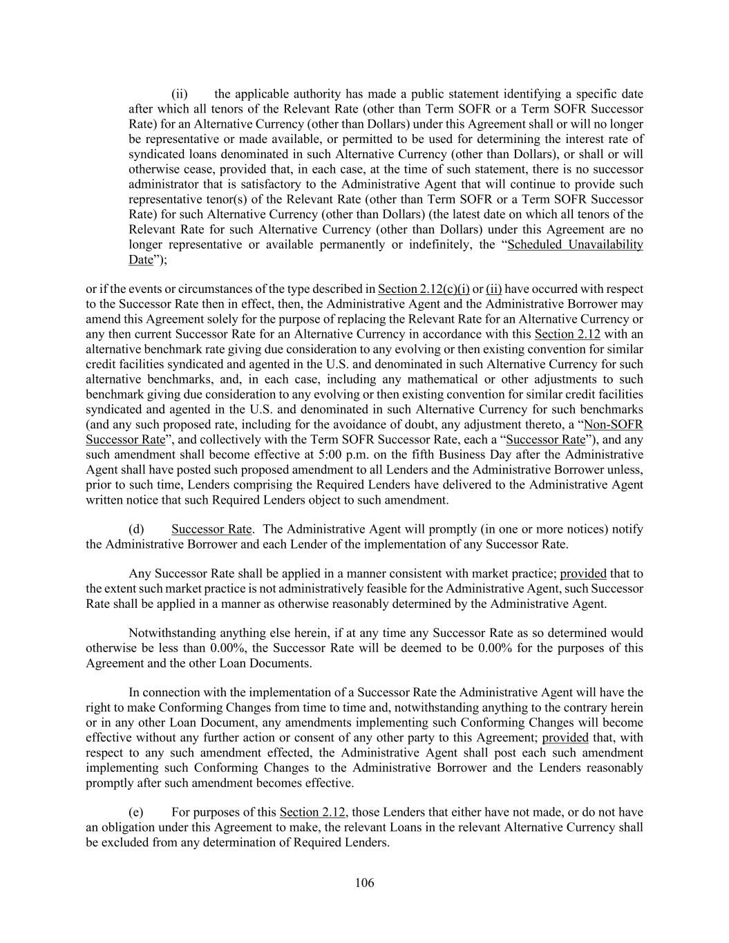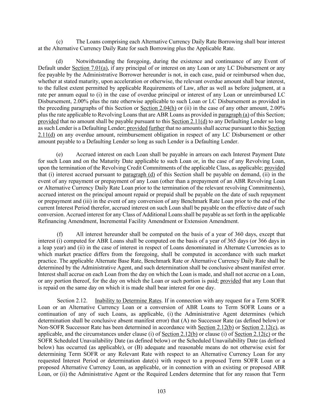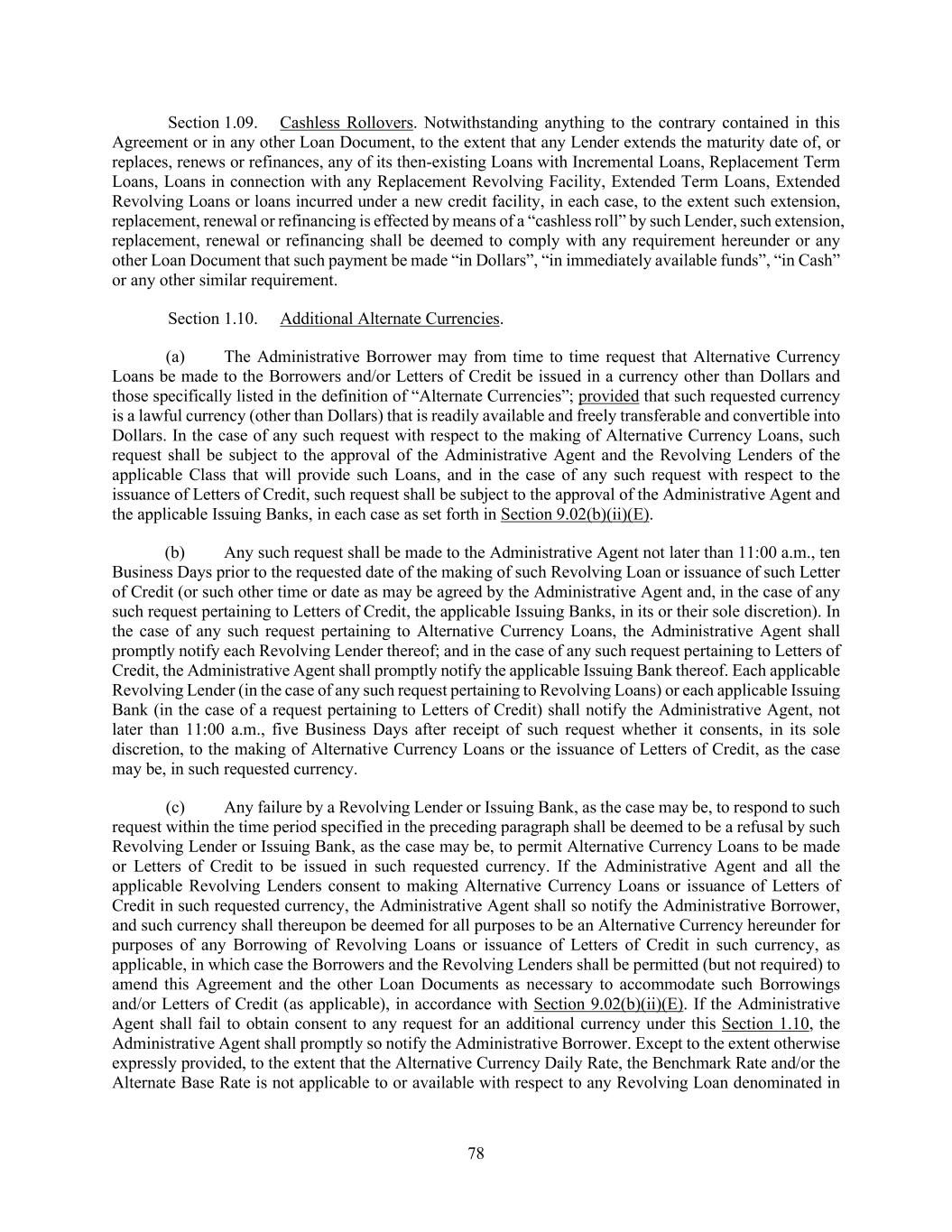 78 Section 1.09. Cashless Rollovers. Notwithstanding anything to the contrary contained in this Agreement or in any other Loan Document, to the extent that any Lender extends the maturity date of, or replaces, renews or refinances, any of its then-existing Loans with Incremental Loans, Replacement Term Loans, Loans in connection with any Replacement Revolving Facility, Extended Term Loans, Extended Revolving Loans or loans incurred under a new credit facility, in each case, to the extent such extension, replacement, renewal or refinancing is effected by means of a “cashless roll” by such Lender, such extension, replacement, renewal or refinancing shall be deemed to comply with any requirement hereunder or any other Loan Document that such payment be made “in Dollars”, “in immediately available funds”, “in Cash” or any other similar requirement. Section 1.10. Additional Alternate Currencies. (a) The Administrative Borrower may from time to time request that Alternative Currency Loans be made to the Borrowers and/or Letters of Credit be issued in a currency other than Dollars and those specifically listed in the definition of “Alternate Currencies”; provided that such requested currency is a lawful currency (other than Dollars) that is readily available and freely transferable and convertible into Dollars. In the case of any such request with respect to the making of Alternative Currency Loans, such request shall be subject to the approval of the Administrative Agent and the Revolving Lenders of the applicable Class that will provide such Loans, and in the case of any such request with respect to the issuance of Letters of Credit, such request shall be subject to the approval of the Administrative Agent and the applicable Issuing Banks, in each case as set forth in Section 9.02(b)(ii)(E). (b) Any such request shall be made to the Administrative Agent not later than 11:00 a.m., ten Business Days prior to the requested date of the making of such Revolving Loan or issuance of such Letter of Credit (or such other time or date as may be agreed by the Administrative Agent and, in the case of any such request pertaining to Letters of Credit, the applicable Issuing Banks, in its or their sole discretion). In the case of any such request pertaining to Alternative Currency Loans, the Administrative Agent shall promptly notify each Revolving Lender thereof; and in the case of any such request pertaining to Letters of Credit, the Administrative Agent shall promptly notify the applicable Issuing Bank thereof. Each applicable Revolving Lender (in the case of any such request pertaining to Revolving Loans) or each applicable Issuing Bank (in the case of a request pertaining to Letters of Credit) shall notify the Administrative Agent, not later than 11:00 a.m., five Business Days after receipt of such request whether it consents, in its sole discretion, to the making of Alternative Currency Loans or the issuance of Letters of Credit, as the case may be, in such requested currency. (c) Any failure by a Revolving Lender or Issuing Bank, as the case may be, to respond to such request within the time period specified in the preceding paragraph shall be deemed to be a refusal by such Revolving Lender or Issuing Bank, as the case may be, to permit Alternative Currency Loans to be made or Letters of Credit to be issued in such requested currency. If the Administrative Agent and all the applicable Revolving Lenders consent to making Alternative Currency Loans or issuance of Letters of Credit in such requested currency, the Administrative Agent shall so notify the Administrative Borrower, and such currency shall thereupon be deemed for all purposes to be an Alternative Currency hereunder for purposes of any Borrowing of Revolving Loans or issuance of Letters of Credit in such currency, as applicable, in which case the Borrowers and the Revolving Lenders shall be permitted (but not required) to amend this Agreement and the other Loan Documents as necessary to accommodate such Borrowings and/or Letters of Credit (as applicable), in accordance with Section 9.02(b)(ii)(E). If the Administrative Agent shall fail to obtain consent to any request for an additional currency under this Section 1.10, the Administrative Agent shall promptly so notify the Administrative Borrower. Except to the extent otherwise expressly provided, to the extent that the Alternative Currency Daily Rate, the Benchmark Rate and/or the Alternate Base Rate is not applicable to or available with respect to any Revolving Loan denominated in