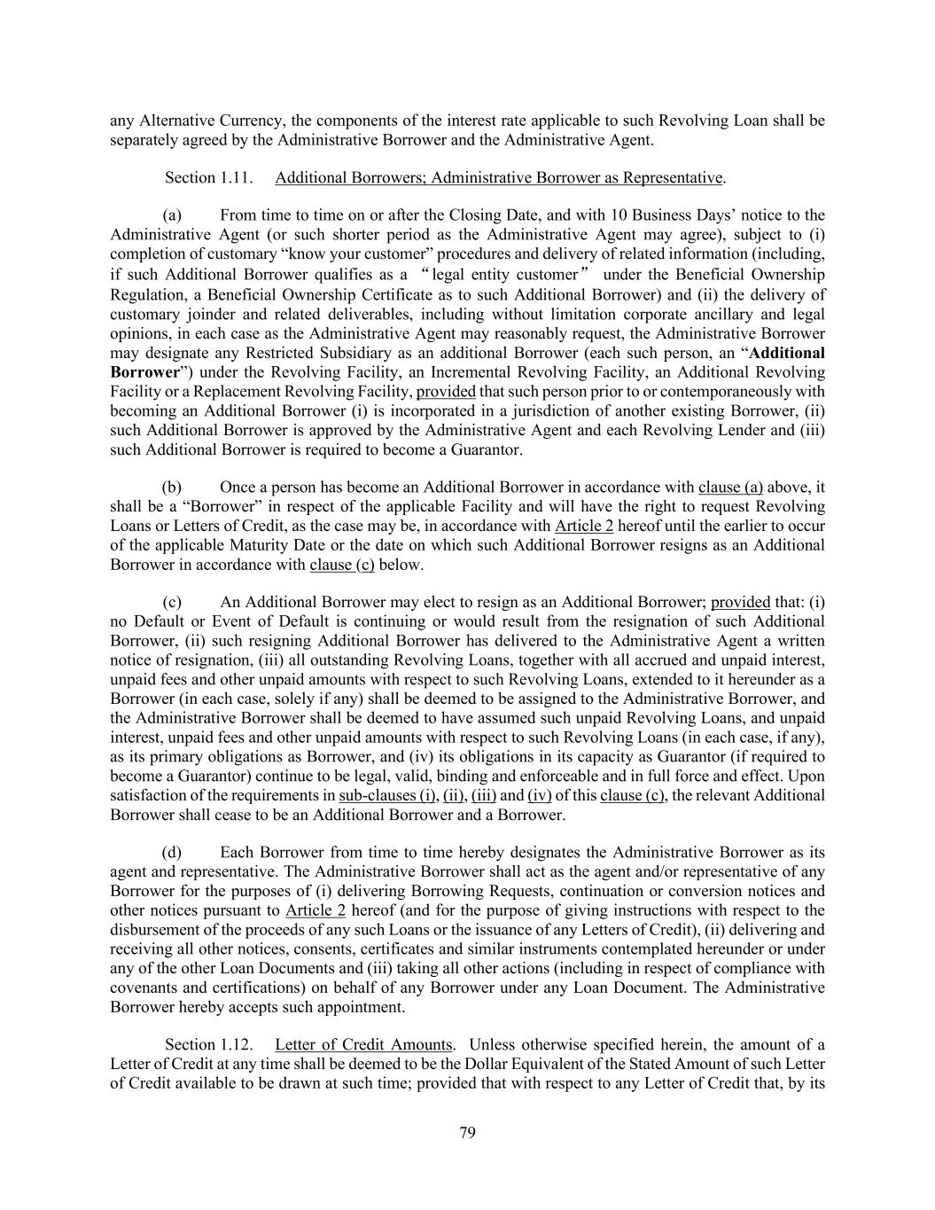 79 any Alternative Currency, the components of the interest rate applicable to such Revolving Loan shall be separately agreed by the Administrative Borrower and the Administrative Agent. Section 1.11. Additional Borrowers; Administrative Borrower as Representative. (a) From time to time on or after the Closing Date, and with 10 Business Days’ notice to the Administrative Agent (or such shorter period as the Administrative Agent may agree), subject to (i) completion of customary “know your customer” procedures and delivery of related information (including, if such Additional Borrower qualifies as a “legal entity customer” under the Beneficial Ownership Regulation, a Beneficial Ownership Certificate as to such Additional Borrower) and (ii) the delivery of customary joinder and related deliverables, including without limitation corporate ancillary and legal opinions, in each case as the Administrative Agent may reasonably request, the Administrative Borrower may designate any Restricted Subsidiary as an additional Borrower (each such person, an “Additional Borrower”) under the Revolving Facility, an Incremental Revolving Facility, an Additional Revolving Facility or a Replacement Revolving Facility, provided that such person prior to or contemporaneously with becoming an Additional Borrower (i) is incorporated in a jurisdiction of another existing Borrower, (ii) such Additional Borrower is approved by the Administrative Agent and each Revolving Lender and (iii) such Additional Borrower is required to become a Guarantor. (b) Once a person has become an Additional Borrower in accordance with clause (a) above, it shall be a “Borrower” in respect of the applicable Facility and will have the right to request Revolving Loans or Letters of Credit, as the case may be, in accordance with Article 2 hereof until the earlier to occur of the applicable Maturity Date or the date on which such Additional Borrower resigns as an Additional Borrower in accordance with clause (c) below. (c) An Additional Borrower may elect to resign as an Additional Borrower; provided that: (i) no Default or Event of Default is continuing or would result from the resignation of such Additional Borrower, (ii) such resigning Additional Borrower has delivered to the Administrative Agent a written notice of resignation, (iii) all outstanding Revolving Loans, together with all accrued and unpaid interest, unpaid fees and other unpaid amounts with respect to such Revolving Loans, extended to it hereunder as a Borrower (in each case, solely if any) shall be deemed to be assigned to the Administrative Borrower, and the Administrative Borrower shall be deemed to have assumed such unpaid Revolving Loans, and unpaid interest, unpaid fees and other unpaid amounts with respect to such Revolving Loans (in each case, if any), as its primary obligations as Borrower, and (iv) its obligations in its capacity as Guarantor (if required to become a Guarantor) continue to be legal, valid, binding and enforceable and in full force and effect. Upon satisfaction of the requirements in sub-clauses (i), (ii), (iii) and (iv) of this clause (c), the relevant Additional Borrower shall cease to be an Additional Borrower and a Borrower. (d) Each Borrower from time to time hereby designates the Administrative Borrower as its agent and representative. The Administrative Borrower shall act as the agent and/or representative of any Borrower for the purposes of (i) delivering Borrowing Requests, continuation or conversion notices and other notices pursuant to Article 2 hereof (and for the purpose of giving instructions with respect to the disbursement of the proceeds of any such Loans or the issuance of any Letters of Credit), (ii) delivering and receiving all other notices, consents, certificates and similar instruments contemplated hereunder or under any of the other Loan Documents and (iii) taking all other actions (including in respect of compliance with covenants and certifications) on behalf of any Borrower under any Loan Document. The Administrative Borrower hereby accepts such appointment. Section 1.12. Letter of Credit Amounts. Unless otherwise specified herein, the amount of a Letter of Credit at any time shall be deemed to be the Dollar Equivalent of the Stated Amount of such Letter of Credit available to be drawn at such time; provided that with respect to any Letter of Credit that, by its