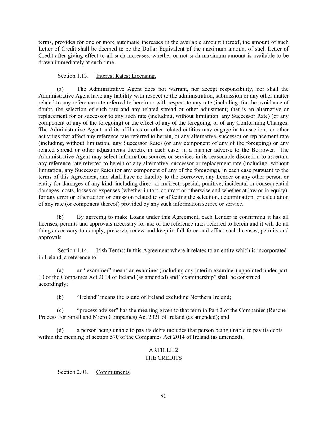 80 terms, provides for one or more automatic increases in the available amount thereof, the amount of such Letter of Credit shall be deemed to be the Dollar Equivalent of the maximum amount of such Letter of Credit after giving effect to all such increases, whether or not such maximum amount is available to be drawn immediately at such time. Section 1.13. Interest Rates; Licensing. (a) The Administrative Agent does not warrant, nor accept responsibility, nor shall the Administrative Agent have any liability with respect to the administration, submission or any other matter related to any reference rate referred to herein or with respect to any rate (including, for the avoidance of doubt, the selection of such rate and any related spread or other adjustment) that is an alternative or replacement for or successor to any such rate (including, without limitation, any Successor Rate) (or any component of any of the foregoing) or the effect of any of the foregoing, or of any Conforming Changes. The Administrative Agent and its affiliates or other related entities may engage in transactions or other activities that affect any reference rate referred to herein, or any alternative, successor or replacement rate (including, without limitation, any Successor Rate) (or any component of any of the foregoing) or any related spread or other adjustments thereto, in each case, in a manner adverse to the Borrower. The Administrative Agent may select information sources or services in its reasonable discretion to ascertain any reference rate referred to herein or any alternative, successor or replacement rate (including, without limitation, any Successor Rate) (or any component of any of the foregoing), in each case pursuant to the terms of this Agreement, and shall have no liability to the Borrower, any Lender or any other person or entity for damages of any kind, including direct or indirect, special, punitive, incidental or consequential damages, costs, losses or expenses (whether in tort, contract or otherwise and whether at law or in equity), for any error or other action or omission related to or affecting the selection, determination, or calculation of any rate (or component thereof) provided by any such information source or service. (b) By agreeing to make Loans under this Agreement, each Lender is confirming it has all licenses, permits and approvals necessary for use of the reference rates referred to herein and it will do all things necessary to comply, preserve, renew and keep in full force and effect such licenses, permits and approvals. Section 1.14. Irish Terms: In this Agreement where it relates to an entity which is incorporated in Ireland, a reference to: (a) an “examiner” means an examiner (including any interim examiner) appointed under part 10 of the Companies Act 2014 of Ireland (as amended) and “examinership” shall be construed accordingly; (b) “Ireland” means the island of Ireland excluding Northern Ireland; (c) “process adviser” has the meaning given to that term in Part 2 of the Companies (Rescue Process For Small and Micro Companies) Act 2021 of Ireland (as amended); and (d) a person being unable to pay its debts includes that person being unable to pay its debts within the meaning of section 570 of the Companies Act 2014 of Ireland (as amended). ARTICLE 2 THE CREDITS Section 2.01. Commitments.