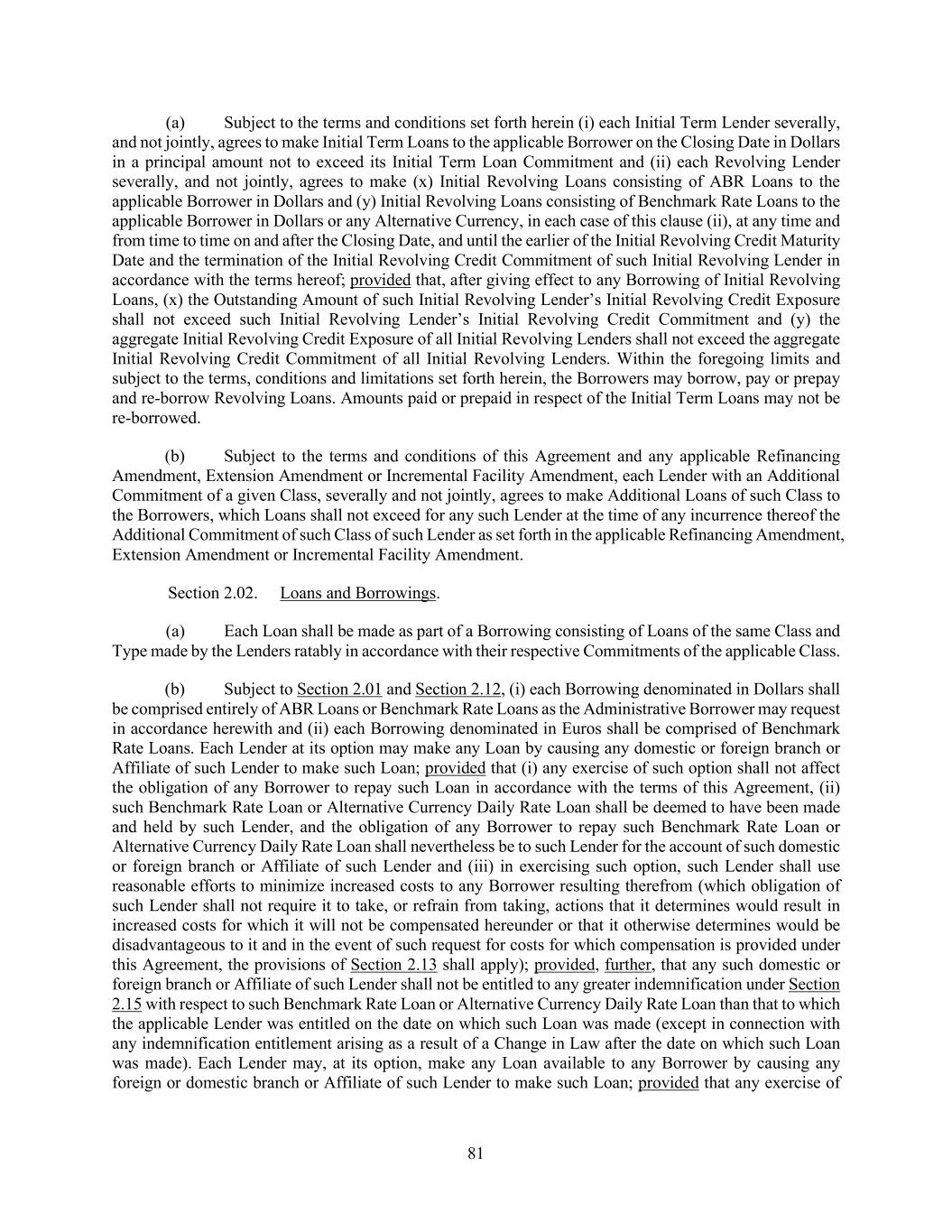 81 (a) Subject to the terms and conditions set forth herein (i) each Initial Term Lender severally, and not jointly, agrees to make Initial Term Loans to the applicable Borrower on the Closing Date in Dollars in a principal amount not to exceed its Initial Term Loan Commitment and (ii) each Revolving Lender severally, and not jointly, agrees to make (x) Initial Revolving Loans consisting of ABR Loans to the applicable Borrower in Dollars and (y) Initial Revolving Loans consisting of Benchmark Rate Loans to the applicable Borrower in Dollars or any Alternative Currency, in each case of this clause (ii), at any time and from time to time on and after the Closing Date, and until the earlier of the Initial Revolving Credit Maturity Date and the termination of the Initial Revolving Credit Commitment of such Initial Revolving Lender in accordance with the terms hereof; provided that, after giving effect to any Borrowing of Initial Revolving Loans, (x) the Outstanding Amount of such Initial Revolving Lender’s Initial Revolving Credit Exposure shall not exceed such Initial Revolving Lender’s Initial Revolving Credit Commitment and (y) the aggregate Initial Revolving Credit Exposure of all Initial Revolving Lenders shall not exceed the aggregate Initial Revolving Credit Commitment of all Initial Revolving Lenders. Within the foregoing limits and subject to the terms, conditions and limitations set forth herein, the Borrowers may borrow, pay or prepay and re-borrow Revolving Loans. Amounts paid or prepaid in respect of the Initial Term Loans may not be re-borrowed. (b) Subject to the terms and conditions of this Agreement and any applicable Refinancing Amendment, Extension Amendment or Incremental Facility Amendment, each Lender with an Additional Commitment of a given Class, severally and not jointly, agrees to make Additional Loans of such Class to the Borrowers, which Loans shall not exceed for any such Lender at the time of any incurrence thereof the Additional Commitment of such Class of such Lender as set forth in the applicable Refinancing Amendment, Extension Amendment or Incremental Facility Amendment. Section 2.02. Loans and Borrowings. (a) Each Loan shall be made as part of a Borrowing consisting of Loans of the same Class and Type made by the Lenders ratably in accordance with their respective Commitments of the applicable Class. (b) Subject to Section 2.01 and Section 2.12, (i) each Borrowing denominated in Dollars shall be comprised entirely of ABR Loans or Benchmark Rate Loans as the Administrative Borrower may request in accordance herewith and (ii) each Borrowing denominated in Euros shall be comprised of Benchmark Rate Loans. Each Lender at its option may make any Loan by causing any domestic or foreign branch or Affiliate of such Lender to make such Loan; provided that (i) any exercise of such option shall not affect the obligation of any Borrower to repay such Loan in accordance with the terms of this Agreement, (ii) such Benchmark Rate Loan or Alternative Currency Daily Rate Loan shall be deemed to have been made and held by such Lender, and the obligation of any Borrower to repay such Benchmark Rate Loan or Alternative Currency Daily Rate Loan shall nevertheless be to such Lender for the account of such domestic or foreign branch or Affiliate of such Lender and (iii) in exercising such option, such Lender shall use reasonable efforts to minimize increased costs to any Borrower resulting therefrom (which obligation of such Lender shall not require it to take, or refrain from taking, actions that it determines would result in increased costs for which it will not be compensated hereunder or that it otherwise determines would be disadvantageous to it and in the event of such request for costs for which compensation is provided under this Agreement, the provisions of Section 2.13 shall apply); provided, further, that any such domestic or foreign branch or Affiliate of such Lender shall not be entitled to any greater indemnification under Section 2.15 with respect to such Benchmark Rate Loan or Alternative Currency Daily Rate Loan than that to which the applicable Lender was entitled on the date on which such Loan was made (except in connection with any indemnification entitlement arising as a result of a Change in Law after the date on which such Loan was made). Each Lender may, at its option, make any Loan available to any Borrower by causing any foreign or domestic branch or Affiliate of such Lender to make such Loan; provided that any exercise of