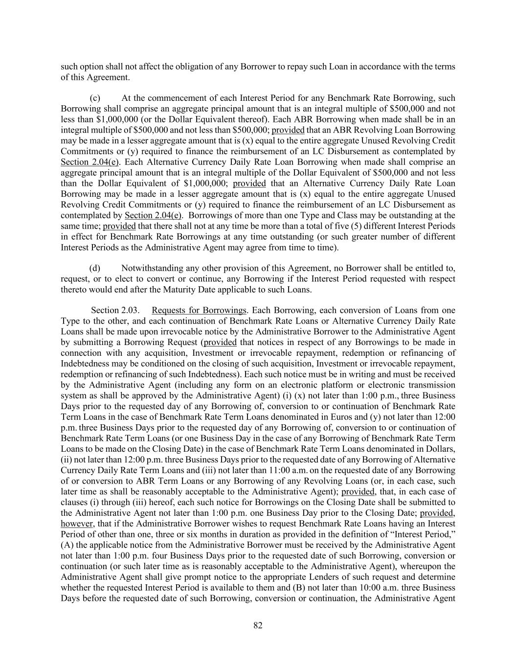82 such option shall not affect the obligation of any Borrower to repay such Loan in accordance with the terms of this Agreement. (c) At the commencement of each Interest Period for any Benchmark Rate Borrowing, such Borrowing shall comprise an aggregate principal amount that is an integral multiple of $500,000 and not less than $1,000,000 (or the Dollar Equivalent thereof). Each ABR Borrowing when made shall be in an integral multiple of $500,000 and not less than $500,000; provided that an ABR Revolving Loan Borrowing may be made in a lesser aggregate amount that is (x) equal to the entire aggregate Unused Revolving Credit Commitments or (y) required to finance the reimbursement of an LC Disbursement as contemplated by Section 2.04(e). Each Alternative Currency Daily Rate Loan Borrowing when made shall comprise an aggregate principal amount that is an integral multiple of the Dollar Equivalent of $500,000 and not less than the Dollar Equivalent of $1,000,000; provided that an Alternative Currency Daily Rate Loan Borrowing may be made in a lesser aggregate amount that is (x) equal to the entire aggregate Unused Revolving Credit Commitments or (y) required to finance the reimbursement of an LC Disbursement as contemplated by Section 2.04(e). Borrowings of more than one Type and Class may be outstanding at the same time; provided that there shall not at any time be more than a total of five (5) different Interest Periods in effect for Benchmark Rate Borrowings at any time outstanding (or such greater number of different Interest Periods as the Administrative Agent may agree from time to time). (d) Notwithstanding any other provision of this Agreement, no Borrower shall be entitled to, request, or to elect to convert or continue, any Borrowing if the Interest Period requested with respect thereto would end after the Maturity Date applicable to such Loans. Section 2.03. Requests for Borrowings. Each Borrowing, each conversion of Loans from one Type to the other, and each continuation of Benchmark Rate Loans or Alternative Currency Daily Rate Loans shall be made upon irrevocable notice by the Administrative Borrower to the Administrative Agent by submitting a Borrowing Request (provided that notices in respect of any Borrowings to be made in connection with any acquisition, Investment or irrevocable repayment, redemption or refinancing of Indebtedness may be conditioned on the closing of such acquisition, Investment or irrevocable repayment, redemption or refinancing of such Indebtedness). Each such notice must be in writing and must be received by the Administrative Agent (including any form on an electronic platform or electronic transmission system as shall be approved by the Administrative Agent) (i) (x) not later than 1:00 p.m., three Business Days prior to the requested day of any Borrowing of, conversion to or continuation of Benchmark Rate Term Loans in the case of Benchmark Rate Term Loans denominated in Euros and (y) not later than 12:00 p.m. three Business Days prior to the requested day of any Borrowing of, conversion to or continuation of Benchmark Rate Term Loans (or one Business Day in the case of any Borrowing of Benchmark Rate Term Loans to be made on the Closing Date) in the case of Benchmark Rate Term Loans denominated in Dollars, (ii) not later than 12:00 p.m. three Business Days prior to the requested date of any Borrowing of Alternative Currency Daily Rate Term Loans and (iii) not later than 11:00 a.m. on the requested date of any Borrowing of or conversion to ABR Term Loans or any Borrowing of any Revolving Loans (or, in each case, such later time as shall be reasonably acceptable to the Administrative Agent); provided, that, in each case of clauses (i) through (iii) hereof, each such notice for Borrowings on the Closing Date shall be submitted to the Administrative Agent not later than 1:00 p.m. one Business Day prior to the Closing Date; provided, however, that if the Administrative Borrower wishes to request Benchmark Rate Loans having an Interest Period of other than one, three or six months in duration as provided in the definition of “Interest Period,” (A) the applicable notice from the Administrative Borrower must be received by the Administrative Agent not later than 1:00 p.m. four Business Days prior to the requested date of such Borrowing, conversion or continuation (or such later time as is reasonably acceptable to the Administrative Agent), whereupon the Administrative Agent shall give prompt notice to the appropriate Lenders of such request and determine whether the requested Interest Period is available to them and (B) not later than 10:00 a.m. three Business Days before the requested date of such Borrowing, conversion or continuation, the Administrative Agent