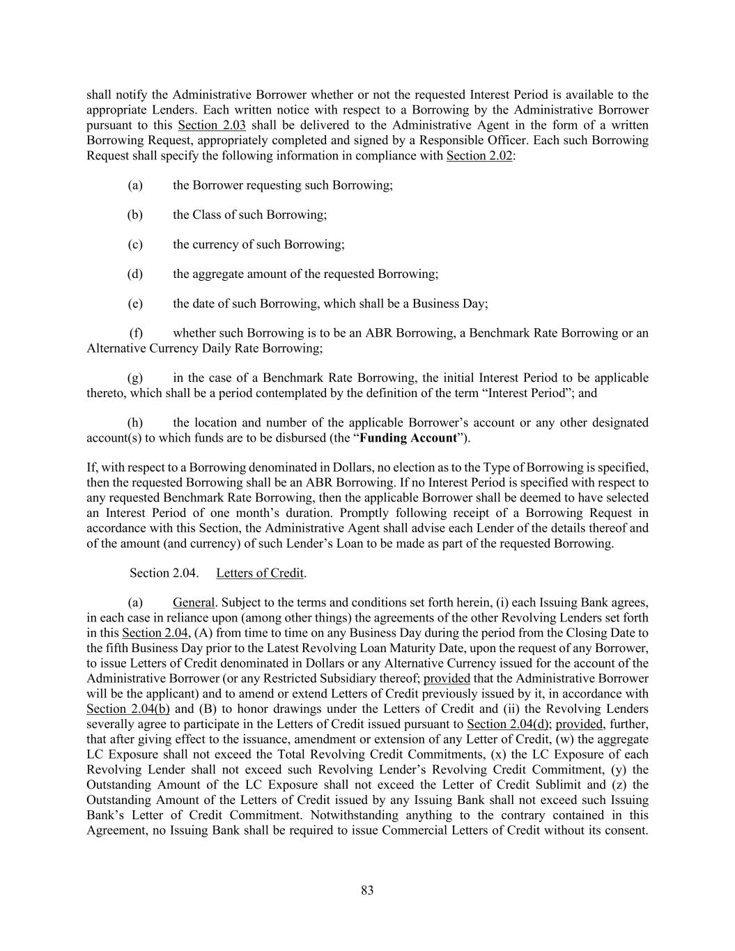 83 shall notify the Administrative Borrower whether or not the requested Interest Period is available to the appropriate Lenders. Each written notice with respect to a Borrowing by the Administrative Borrower pursuant to this Section 2.03 shall be delivered to the Administrative Agent in the form of a written Borrowing Request, appropriately completed and signed by a Responsible Officer. Each such Borrowing Request shall specify the following information in compliance with Section 2.02: (a) the Borrower requesting such Borrowing; (b) the Class of such Borrowing; (c) the currency of such Borrowing; (d) the aggregate amount of the requested Borrowing; (e) the date of such Borrowing, which shall be a Business Day; (f) whether such Borrowing is to be an ABR Borrowing, a Benchmark Rate Borrowing or an Alternative Currency Daily Rate Borrowing; (g) in the case of a Benchmark Rate Borrowing, the initial Interest Period to be applicable thereto, which shall be a period contemplated by the definition of the term “Interest Period”; and (h) the location and number of the applicable Borrower’s account or any other designated account(s) to which funds are to be disbursed (the “Funding Account”). If, with respect to a Borrowing denominated in Dollars, no election as to the Type of Borrowing is specified, then the requested Borrowing shall be an ABR Borrowing. If no Interest Period is specified with respect to any requested Benchmark Rate Borrowing, then the applicable Borrower shall be deemed to have selected an Interest Period of one month’s duration. Promptly following receipt of a Borrowing Request in accordance with this Section, the Administrative Agent shall advise each Lender of the details thereof and of the amount (and currency) of such Lender’s Loan to be made as part of the requested Borrowing. Section 2.04. Letters of Credit. (a) General. Subject to the terms and conditions set forth herein, (i) each Issuing Bank agrees, in each case in reliance upon (among other things) the agreements of the other Revolving Lenders set forth in this Section 2.04, (A) from time to time on any Business Day during the period from the Closing Date to the fifth Business Day prior to the Latest Revolving Loan Maturity Date, upon the request of any Borrower, to issue Letters of Credit denominated in Dollars or any Alternative Currency issued for the account of the Administrative Borrower (or any Restricted Subsidiary thereof; provided that the Administrative Borrower will be the applicant) and to amend or extend Letters of Credit previously issued by it, in accordance with Section 2.04(b) and (B) to honor drawings under the Letters of Credit and (ii) the Revolving Lenders severally agree to participate in the Letters of Credit issued pursuant to Section 2.04(d); provided, further, that after giving effect to the issuance, amendment or extension of any Letter of Credit, (w) the aggregate LC Exposure shall not exceed the Total Revolving Credit Commitments, (x) the LC Exposure of each Revolving Lender shall not exceed such Revolving Lender’s Revolving Credit Commitment, (y) the Outstanding Amount of the LC Exposure shall not exceed the Letter of Credit Sublimit and (z) the Outstanding Amount of the Letters of Credit issued by any Issuing Bank shall not exceed such Issuing Bank’s Letter of Credit Commitment. Notwithstanding anything to the contrary contained in this Agreement, no Issuing Bank shall be required to issue Commercial Letters of Credit without its consent.