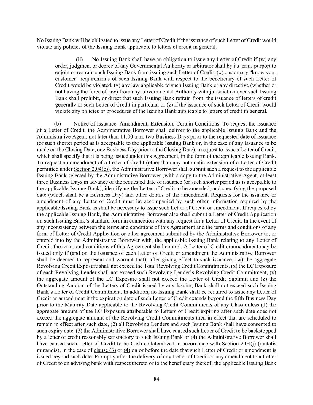 84 No Issuing Bank will be obligated to issue any Letter of Credit if the issuance of such Letter of Credit would violate any policies of the Issuing Bank applicable to letters of credit in general. (ii) No Issuing Bank shall have an obligation to issue any Letter of Credit if (w) any order, judgment or decree of any Governmental Authority or arbitrator shall by its terms purport to enjoin or restrain such Issuing Bank from issuing such Letter of Credit, (x) customary “know your customer” requirements of such Issuing Bank with respect to the beneficiary of such Letter of Credit would be violated, (y) any law applicable to such Issuing Bank or any directive (whether or not having the force of law) from any Governmental Authority with jurisdiction over such Issuing Bank shall prohibit, or direct that such Issuing Bank refrain from, the issuance of letters of credit generally or such Letter of Credit in particular or (z) if the issuance of such Letter of Credit would violate any policies or procedures of the Issuing Bank applicable to letters of credit in general. (b) Notice of Issuance, Amendment, Extension; Certain Conditions. To request the issuance of a Letter of Credit, the Administrative Borrower shall deliver to the applicable Issuing Bank and the Administrative Agent, not later than 11:00 a.m. two Business Days prior to the requested date of issuance (or such shorter period as is acceptable to the applicable Issuing Bank or, in the case of any issuance to be made on the Closing Date, one Business Day prior to the Closing Date), a request to issue a Letter of Credit, which shall specify that it is being issued under this Agreement, in the form of the applicable Issuing Bank. To request an amendment of a Letter of Credit (other than any automatic extension of a Letter of Credit permitted under Section 2.04(c)), the Administrative Borrower shall submit such a request to the applicable Issuing Bank selected by the Administrative Borrower (with a copy to the Administrative Agent) at least three Business Days in advance of the requested date of issuance (or such shorter period as is acceptable to the applicable Issuing Bank), identifying the Letter of Credit to be amended, and specifying the proposed date (which shall be a Business Day) and other details of the amendment. Requests for the issuance or amendment of any Letter of Credit must be accompanied by such other information required by the applicable Issuing Bank as shall be necessary to issue such Letter of Credit or amendment. If requested by the applicable Issuing Bank, the Administrative Borrower also shall submit a Letter of Credit Application on such Issuing Bank’s standard form in connection with any request for a Letter of Credit. In the event of any inconsistency between the terms and conditions of this Agreement and the terms and conditions of any form of Letter of Credit Application or other agreement submitted by the Administrative Borrower to, or entered into by the Administrative Borrower with, the applicable Issuing Bank relating to any Letter of Credit, the terms and conditions of this Agreement shall control. A Letter of Credit or amendment may be issued only if (and on the issuance of each Letter of Credit or amendment the Administrative Borrower shall be deemed to represent and warrant that), after giving effect to such issuance, (w) the aggregate Revolving Credit Exposure shall not exceed the Total Revolving Credit Commitments, (x) the LC Exposure of each Revolving Lender shall not exceed such Revolving Lender’s Revolving Credit Commitment, (y) the aggregate amount of the LC Exposure shall not exceed the Letter of Credit Sublimit and (z) the Outstanding Amount of the Letters of Credit issued by any Issuing Bank shall not exceed such Issuing Bank’s Letter of Credit Commitment. In addition, no Issuing Bank shall be required to issue any Letter of Credit or amendment if the expiration date of such Letter of Credit extends beyond the fifth Business Day prior to the Maturity Date applicable to the Revolving Credit Commitments of any Class unless (1) the aggregate amount of the LC Exposure attributable to Letters of Credit expiring after such date does not exceed the aggregate amount of the Revolving Credit Commitments then in effect that are scheduled to remain in effect after such date, (2) all Revolving Lenders and such Issuing Bank shall have consented to such expiry date, (3) the Administrative Borrower shall have caused such Letter of Credit to be backstopped by a letter of credit reasonably satisfactory to such Issuing Bank or (4) the Administrative Borrower shall have caused such Letter of Credit to be Cash collateralized in accordance with Section 2.04(j) (mutatis mutandis), in the case of clause (3) or (4) on or before the date that such Letter of Credit or amendment is issued beyond such date. Promptly after the delivery of any Letter of Credit or any amendment to a Letter of Credit to an advising bank with respect thereto or to the beneficiary thereof, the applicable Issuing Bank