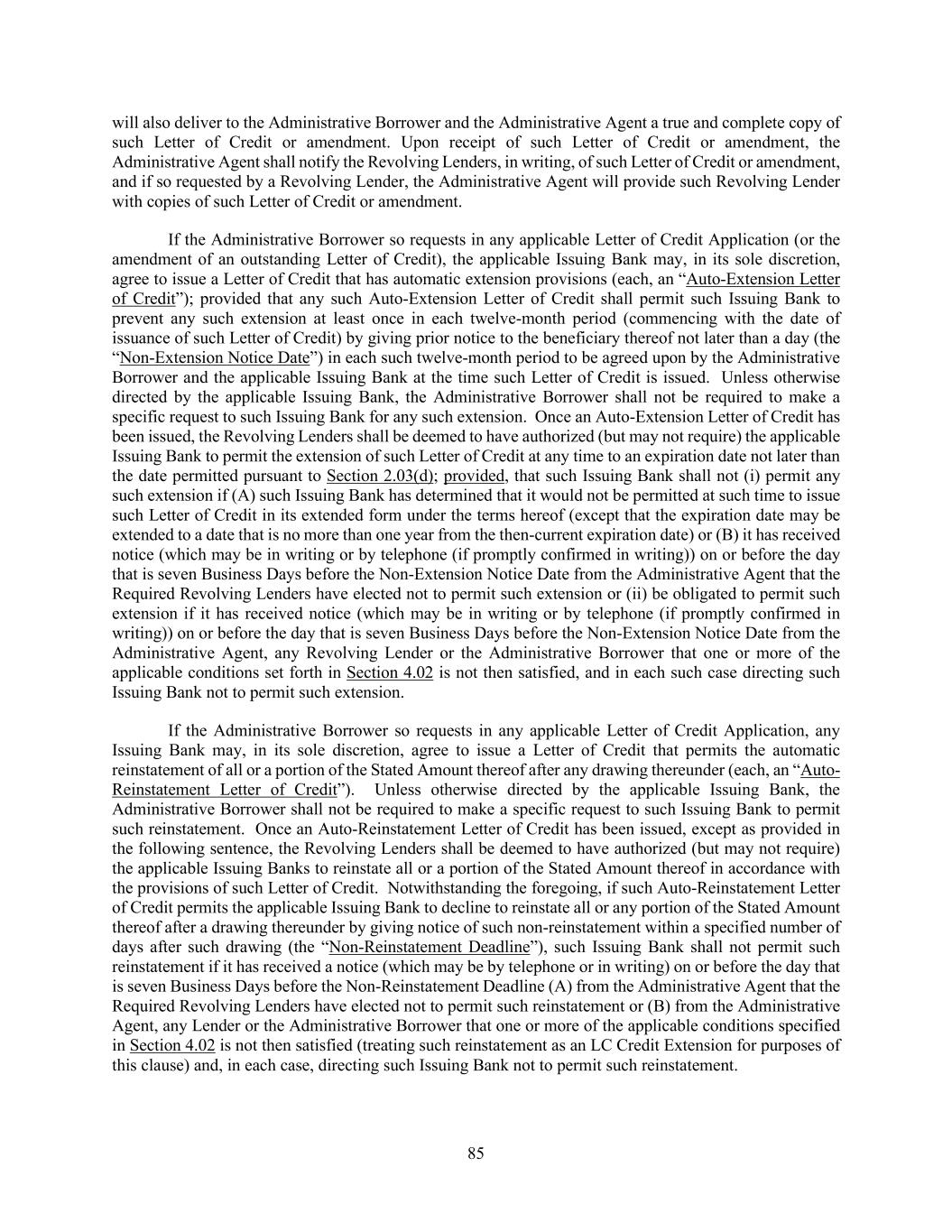 85 will also deliver to the Administrative Borrower and the Administrative Agent a true and complete copy of such Letter of Credit or amendment. Upon receipt of such Letter of Credit or amendment, the Administrative Agent shall notify the Revolving Lenders, in writing, of such Letter of Credit or amendment, and if so requested by a Revolving Lender, the Administrative Agent will provide such Revolving Lender with copies of such Letter of Credit or amendment. If the Administrative Borrower so requests in any applicable Letter of Credit Application (or the amendment of an outstanding Letter of Credit), the applicable Issuing Bank may, in its sole discretion, agree to issue a Letter of Credit that has automatic extension provisions (each, an “Auto-Extension Letter of Credit”); provided that any such Auto-Extension Letter of Credit shall permit such Issuing Bank to prevent any such extension at least once in each twelve-month period (commencing with the date of issuance of such Letter of Credit) by giving prior notice to the beneficiary thereof not later than a day (the “Non-Extension Notice Date”) in each such twelve-month period to be agreed upon by the Administrative Borrower and the applicable Issuing Bank at the time such Letter of Credit is issued. Unless otherwise directed by the applicable Issuing Bank, the Administrative Borrower shall not be required to make a specific request to such Issuing Bank for any such extension. Once an Auto-Extension Letter of Credit has been issued, the Revolving Lenders shall be deemed to have authorized (but may not require) the applicable Issuing Bank to permit the extension of such Letter of Credit at any time to an expiration date not later than the date permitted pursuant to Section 2.03(d); provided, that such Issuing Bank shall not (i) permit any such extension if (A) such Issuing Bank has determined that it would not be permitted at such time to issue such Letter of Credit in its extended form under the terms hereof (except that the expiration date may be extended to a date that is no more than one year from the then-current expiration date) or (B) it has received notice (which may be in writing or by telephone (if promptly confirmed in writing)) on or before the day that is seven Business Days before the Non-Extension Notice Date from the Administrative Agent that the Required Revolving Lenders have elected not to permit such extension or (ii) be obligated to permit such extension if it has received notice (which may be in writing or by telephone (if promptly confirmed in writing)) on or before the day that is seven Business Days before the Non-Extension Notice Date from the Administrative Agent, any Revolving Lender or the Administrative Borrower that one or more of the applicable conditions set forth in Section 4.02 is not then satisfied, and in each such case directing such Issuing Bank not to permit such extension. If the Administrative Borrower so requests in any applicable Letter of Credit Application, any Issuing Bank may, in its sole discretion, agree to issue a Letter of Credit that permits the automatic reinstatement of all or a portion of the Stated Amount thereof after any drawing thereunder (each, an “Auto- Reinstatement Letter of Credit”). Unless otherwise directed by the applicable Issuing Bank, the Administrative Borrower shall not be required to make a specific request to such Issuing Bank to permit such reinstatement. Once an Auto-Reinstatement Letter of Credit has been issued, except as provided in the following sentence, the Revolving Lenders shall be deemed to have authorized (but may not require) the applicable Issuing Banks to reinstate all or a portion of the Stated Amount thereof in accordance with the provisions of such Letter of Credit. Notwithstanding the foregoing, if such Auto-Reinstatement Letter of Credit permits the applicable Issuing Bank to decline to reinstate all or any portion of the Stated Amount thereof after a drawing thereunder by giving notice of such non-reinstatement within a specified number of days after such drawing (the “Non-Reinstatement Deadline”), such Issuing Bank shall not permit such reinstatement if it has received a notice (which may be by telephone or in writing) on or before the day that is seven Business Days before the Non-Reinstatement Deadline (A) from the Administrative Agent that the Required Revolving Lenders have elected not to permit such reinstatement or (B) from the Administrative Agent, any Lender or the Administrative Borrower that one or more of the applicable conditions specified in Section 4.02 is not then satisfied (treating such reinstatement as an LC Credit Extension for purposes of this clause) and, in each case, directing such Issuing Bank not to permit such reinstatement.