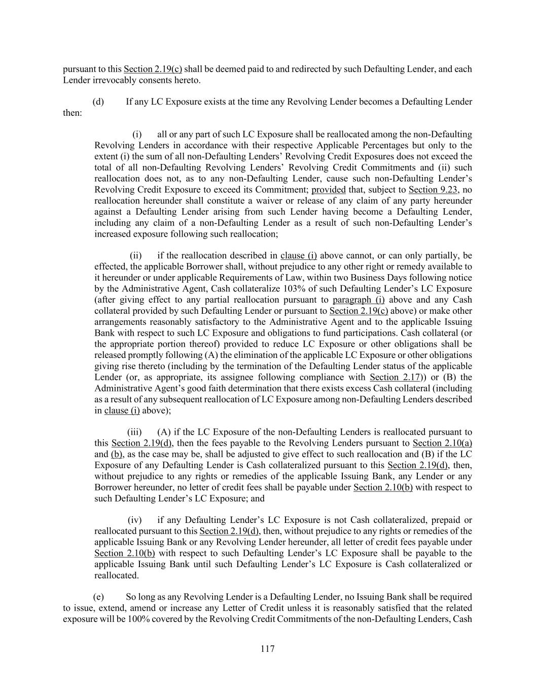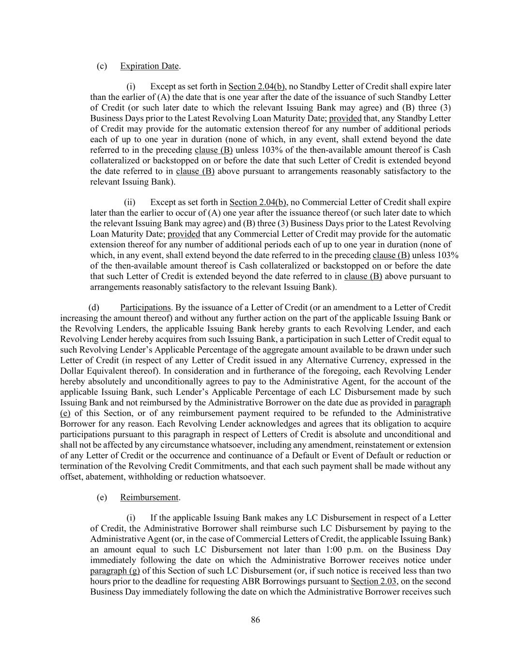 86 (c) Expiration Date. (i) Except as set forth in Section 2.04(b), no Standby Letter of Credit shall expire later than the earlier of (A) the date that is one year after the date of the issuance of such Standby Letter of Credit (or such later date to which the relevant Issuing Bank may agree) and (B) three (3) Business Days prior to the Latest Revolving Loan Maturity Date; provided that, any Standby Letter of Credit may provide for the automatic extension thereof for any number of additional periods each of up to one year in duration (none of which, in any event, shall extend beyond the date referred to in the preceding clause (B) unless 103% of the then-available amount thereof is Cash collateralized or backstopped on or before the date that such Letter of Credit is extended beyond the date referred to in clause (B) above pursuant to arrangements reasonably satisfactory to the relevant Issuing Bank). (ii) Except as set forth in Section 2.04(b), no Commercial Letter of Credit shall expire later than the earlier to occur of (A) one year after the issuance thereof (or such later date to which the relevant Issuing Bank may agree) and (B) three (3) Business Days prior to the Latest Revolving Loan Maturity Date; provided that any Commercial Letter of Credit may provide for the automatic extension thereof for any number of additional periods each of up to one year in duration (none of which, in any event, shall extend beyond the date referred to in the preceding clause (B) unless 103% of the then-available amount thereof is Cash collateralized or backstopped on or before the date that such Letter of Credit is extended beyond the date referred to in clause (B) above pursuant to arrangements reasonably satisfactory to the relevant Issuing Bank). (d) Participations. By the issuance of a Letter of Credit (or an amendment to a Letter of Credit increasing the amount thereof) and without any further action on the part of the applicable Issuing Bank or the Revolving Lenders, the applicable Issuing Bank hereby grants to each Revolving Lender, and each Revolving Lender hereby acquires from such Issuing Bank, a participation in such Letter of Credit equal to such Revolving Lender’s Applicable Percentage of the aggregate amount available to be drawn under such Letter of Credit (in respect of any Letter of Credit issued in any Alternative Currency, expressed in the Dollar Equivalent thereof). In consideration and in furtherance of the foregoing, each Revolving Lender hereby absolutely and unconditionally agrees to pay to the Administrative Agent, for the account of the applicable Issuing Bank, such Lender’s Applicable Percentage of each LC Disbursement made by such Issuing Bank and not reimbursed by the Administrative Borrower on the date due as provided in paragraph (e) of this Section, or of any reimbursement payment required to be refunded to the Administrative Borrower for any reason. Each Revolving Lender acknowledges and agrees that its obligation to acquire participations pursuant to this paragraph in respect of Letters of Credit is absolute and unconditional and shall not be affected by any circumstance whatsoever, including any amendment, reinstatement or extension of any Letter of Credit or the occurrence and continuance of a Default or Event of Default or reduction or termination of the Revolving Credit Commitments, and that each such payment shall be made without any offset, abatement, withholding or reduction whatsoever. (e) Reimbursement. (i) If the applicable Issuing Bank makes any LC Disbursement in respect of a Letter of Credit, the Administrative Borrower shall reimburse such LC Disbursement by paying to the Administrative Agent (or, in the case of Commercial Letters of Credit, the applicable Issuing Bank) an amount equal to such LC Disbursement not later than 1:00 p.m. on the Business Day immediately following the date on which the Administrative Borrower receives notice under paragraph (g) of this Section of such LC Disbursement (or, if such notice is received less than two hours prior to the deadline for requesting ABR Borrowings pursuant to Section 2.03, on the second Business Day immediately following the date on which the Administrative Borrower receives such