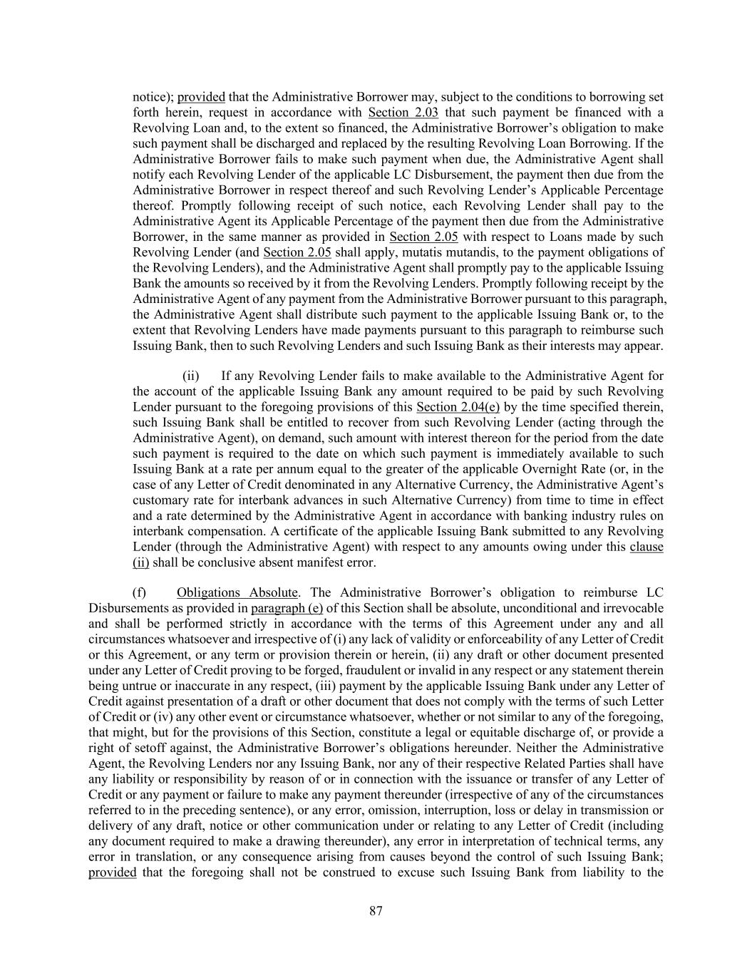87 notice); provided that the Administrative Borrower may, subject to the conditions to borrowing set forth herein, request in accordance with Section 2.03 that such payment be financed with a Revolving Loan and, to the extent so financed, the Administrative Borrower’s obligation to make such payment shall be discharged and replaced by the resulting Revolving Loan Borrowing. If the Administrative Borrower fails to make such payment when due, the Administrative Agent shall notify each Revolving Lender of the applicable LC Disbursement, the payment then due from the Administrative Borrower in respect thereof and such Revolving Lender’s Applicable Percentage thereof. Promptly following receipt of such notice, each Revolving Lender shall pay to the Administrative Agent its Applicable Percentage of the payment then due from the Administrative Borrower, in the same manner as provided in Section 2.05 with respect to Loans made by such Revolving Lender (and Section 2.05 shall apply, mutatis mutandis, to the payment obligations of the Revolving Lenders), and the Administrative Agent shall promptly pay to the applicable Issuing Bank the amounts so received by it from the Revolving Lenders. Promptly following receipt by the Administrative Agent of any payment from the Administrative Borrower pursuant to this paragraph, the Administrative Agent shall distribute such payment to the applicable Issuing Bank or, to the extent that Revolving Lenders have made payments pursuant to this paragraph to reimburse such Issuing Bank, then to such Revolving Lenders and such Issuing Bank as their interests may appear. (ii) If any Revolving Lender fails to make available to the Administrative Agent for the account of the applicable Issuing Bank any amount required to be paid by such Revolving Lender pursuant to the foregoing provisions of this Section 2.04(e) by the time specified therein, such Issuing Bank shall be entitled to recover from such Revolving Lender (acting through the Administrative Agent), on demand, such amount with interest thereon for the period from the date such payment is required to the date on which such payment is immediately available to such Issuing Bank at a rate per annum equal to the greater of the applicable Overnight Rate (or, in the case of any Letter of Credit denominated in any Alternative Currency, the Administrative Agent’s customary rate for interbank advances in such Alternative Currency) from time to time in effect and a rate determined by the Administrative Agent in accordance with banking industry rules on interbank compensation. A certificate of the applicable Issuing Bank submitted to any Revolving Lender (through the Administrative Agent) with respect to any amounts owing under this clause (ii) shall be conclusive absent manifest error. (f) Obligations Absolute. The Administrative Borrower’s obligation to reimburse LC Disbursements as provided in paragraph (e) of this Section shall be absolute, unconditional and irrevocable and shall be performed strictly in accordance with the terms of this Agreement under any and all circumstances whatsoever and irrespective of (i) any lack of validity or enforceability of any Letter of Credit or this Agreement, or any term or provision therein or herein, (ii) any draft or other document presented under any Letter of Credit proving to be forged, fraudulent or invalid in any respect or any statement therein being untrue or inaccurate in any respect, (iii) payment by the applicable Issuing Bank under any Letter of Credit against presentation of a draft or other document that does not comply with the terms of such Letter of Credit or (iv) any other event or circumstance whatsoever, whether or not similar to any of the foregoing, that might, but for the provisions of this Section, constitute a legal or equitable discharge of, or provide a right of setoff against, the Administrative Borrower’s obligations hereunder. Neither the Administrative Agent, the Revolving Lenders nor any Issuing Bank, nor any of their respective Related Parties shall have any liability or responsibility by reason of or in connection with the issuance or transfer of any Letter of Credit or any payment or failure to make any payment thereunder (irrespective of any of the circumstances referred to in the preceding sentence), or any error, omission, interruption, loss or delay in transmission or delivery of any draft, notice or other communication under or relating to any Letter of Credit (including any document required to make a drawing thereunder), any error in interpretation of technical terms, any error in translation, or any consequence arising from causes beyond the control of such Issuing Bank; provided that the foregoing shall not be construed to excuse such Issuing Bank from liability to the